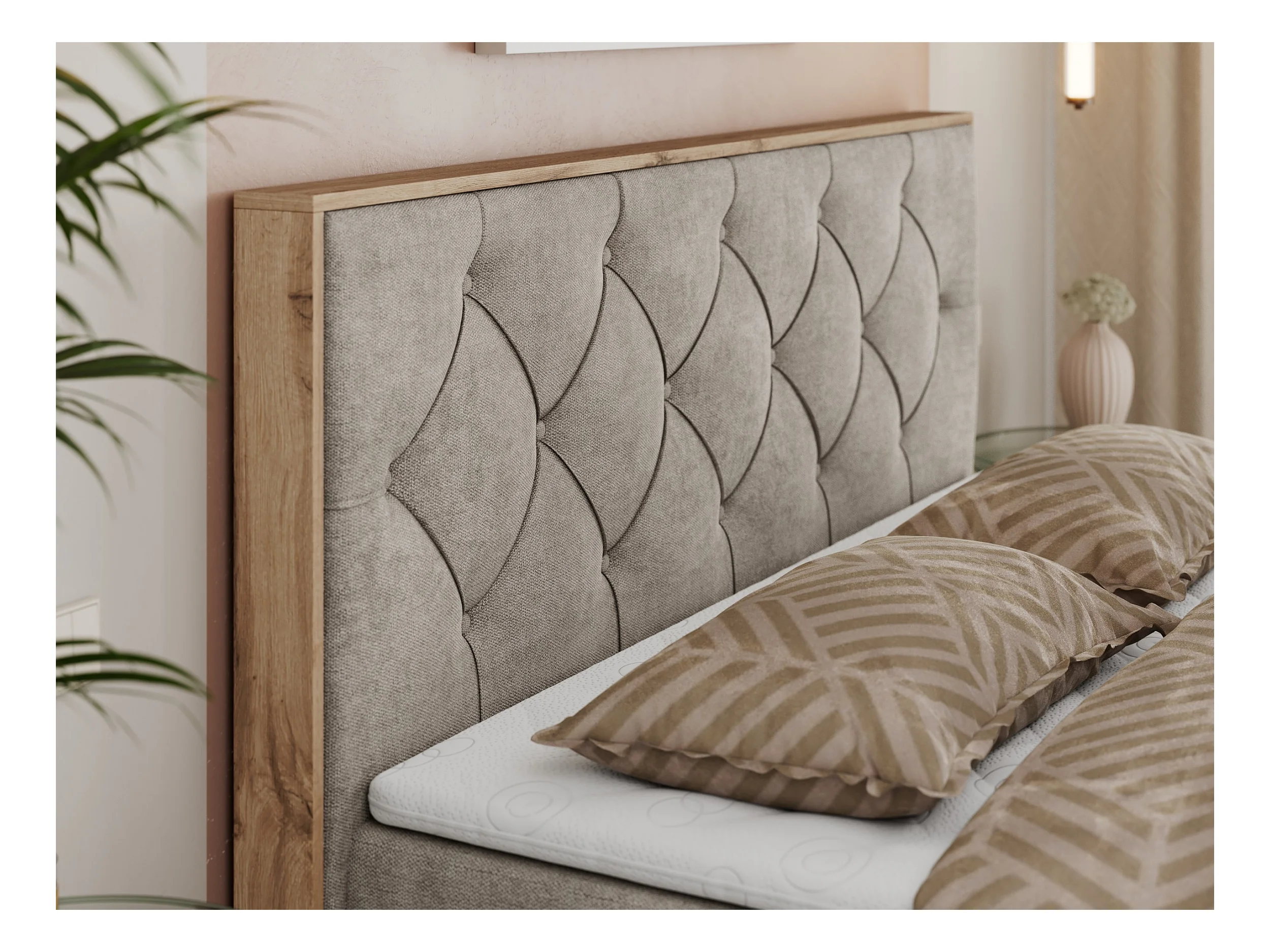 Boxspringbett VENETO - gestepptem Kopfteil, Set mit Multipocket-Matratze und Topper, Holzrahmen, zwei Bettkästen - 160x200 cm - H4 - Beige Strukture