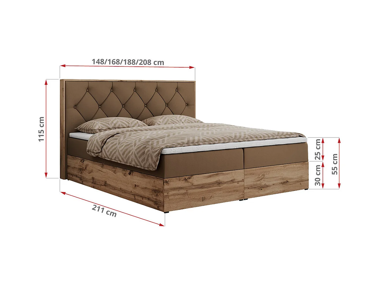 Boxspringbett VENETO - gestepptem Kopfteil, Set mit Multipocket-Matratze und Topper, Holzrahmen, zwei Bettkästen - 200x200 cm - H3 - Braun Kunstleder