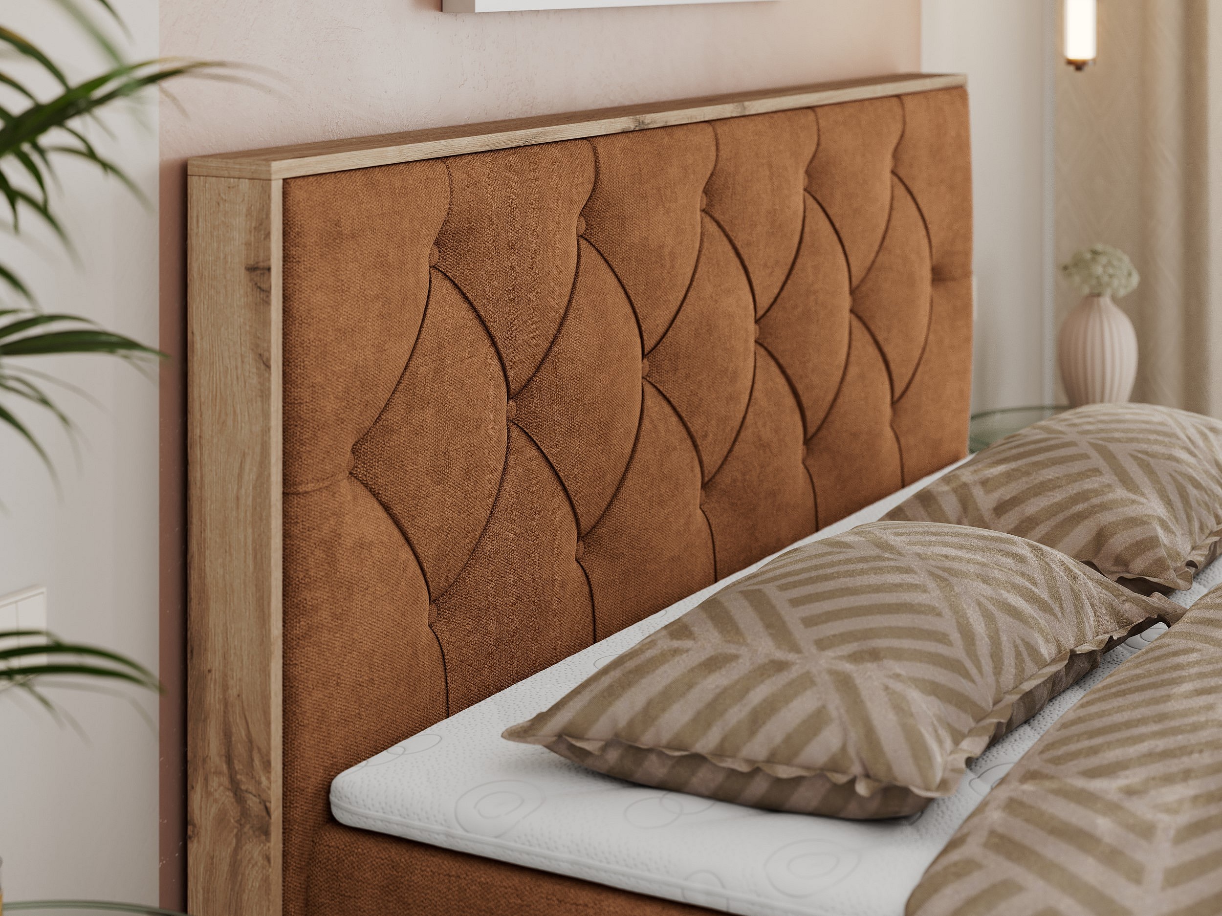 Boxspringbett VENETO - gestepptem Kopfteil, Set mit Multipocket-Matratze und Topper, Holzrahmen, zwei Bettkästen - 200x200 cm - H4 - Orange Strukture