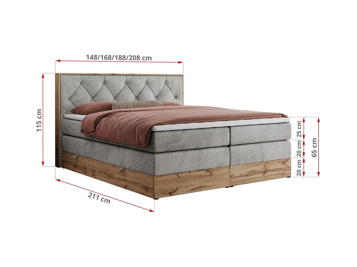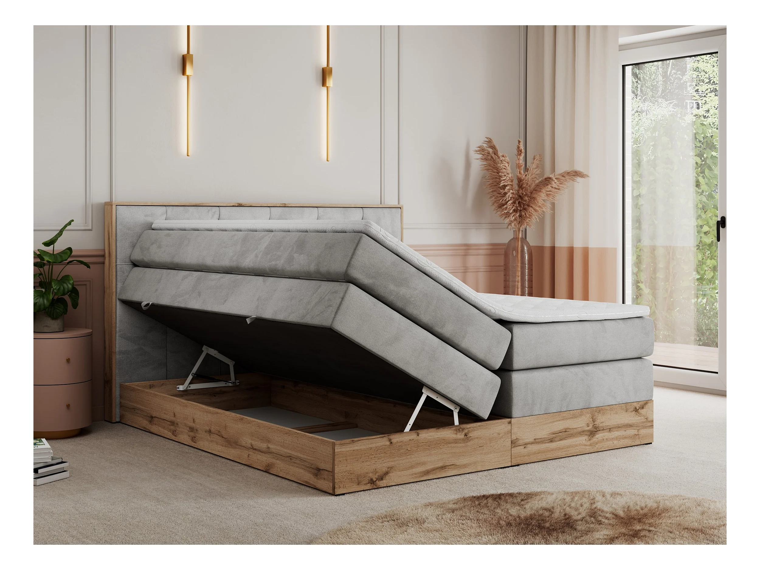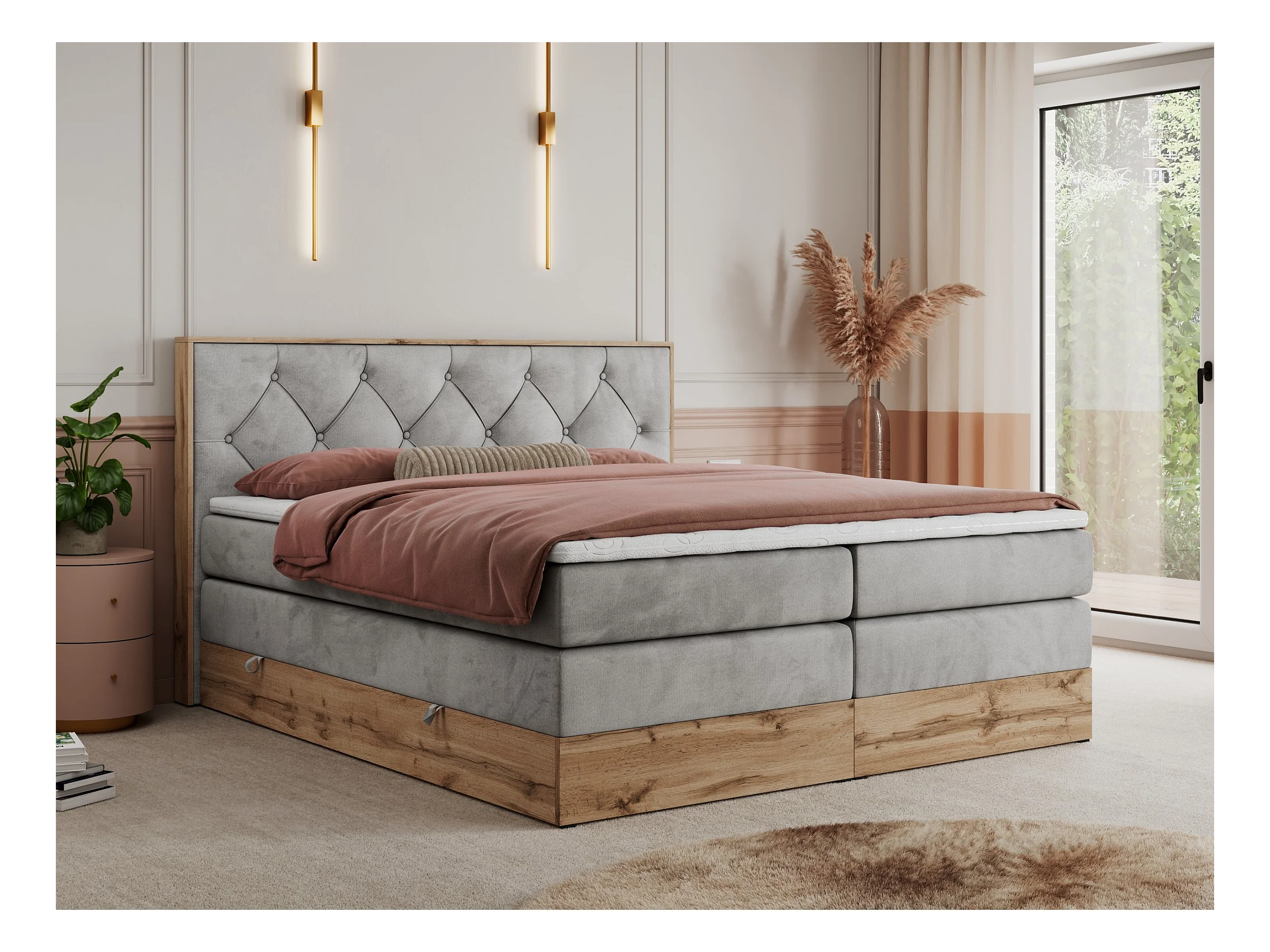 Boxspringbett VENETO KING - Polsterbett mit Multipocket-Matratzen und Kopfteil, Holzrahmen, zwei Bettkästen - 140x200 cm - H3 - Hellgrau Velvet