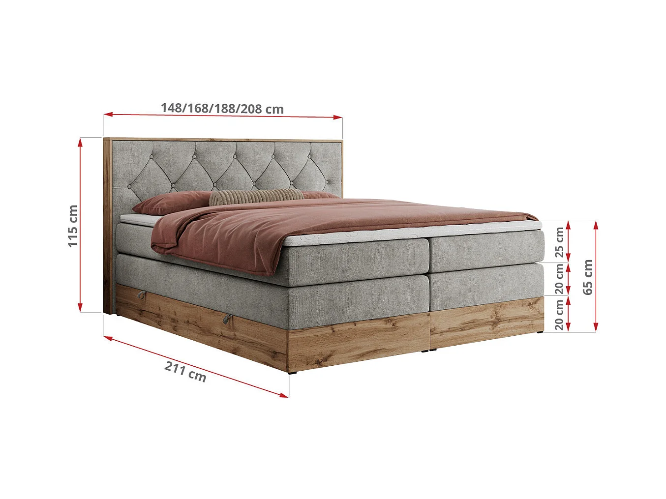 Boxspringbett VENETO KING - Polsterbett mit Multipocket-Matratzen und Kopfteil, Holzrahmen, zwei Bettkästen - 160x200 cm - H4 - Hellgrau Strukture