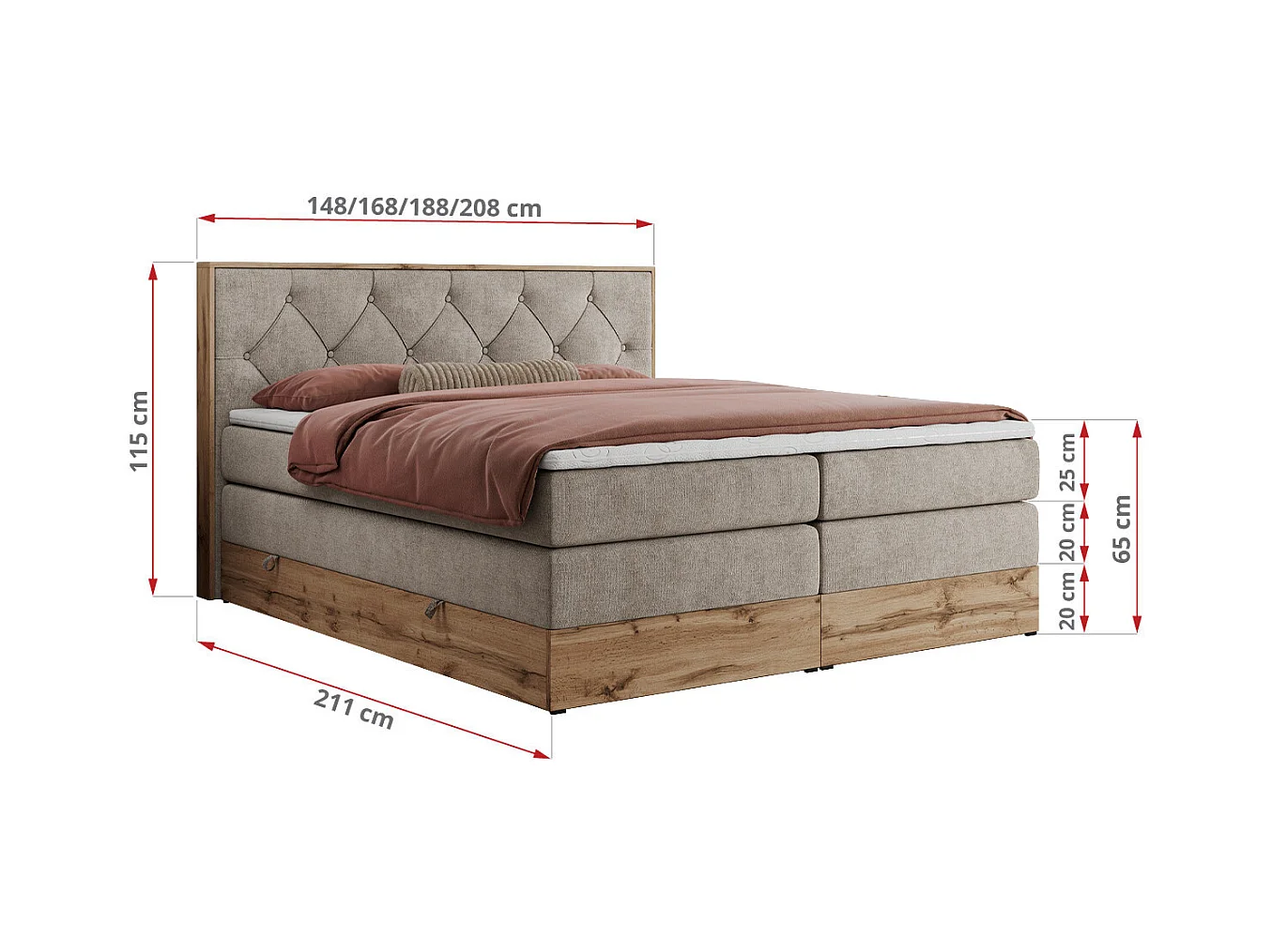 Boxspringbett VENETO KING - Polsterbett mit Multipocket-Matratzen und Kopfteil, Holzrahmen, zwei Bettkästen - 180x200 cm - H4 - Beige Strukture