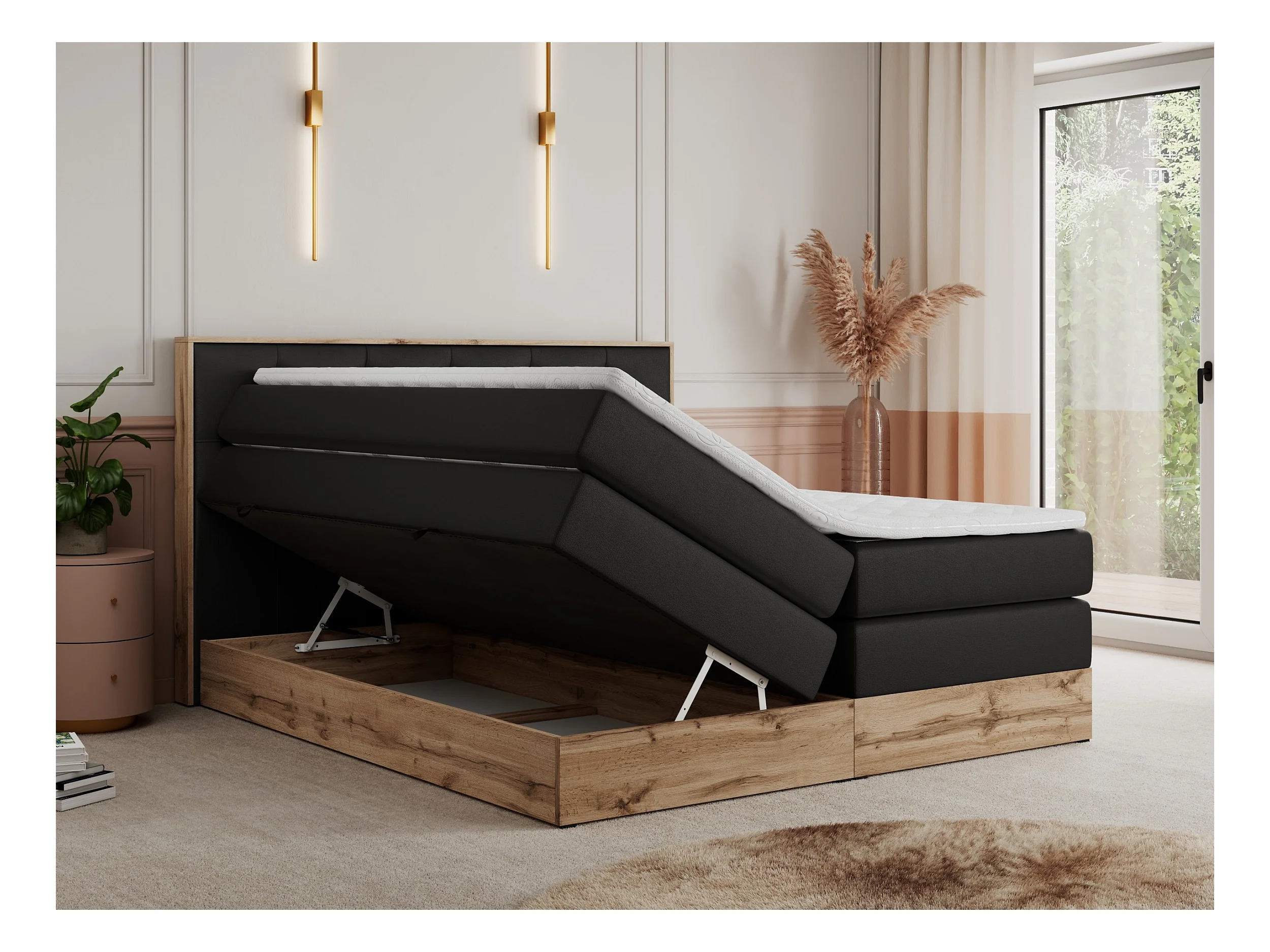 Boxspringbett VENETO KING - Polsterbett mit Multipocket-Matratzen und Kopfteil, Holzrahmen, zwei Bettkästen - 200x200 cm - H3 - Schwarz Kunstleder