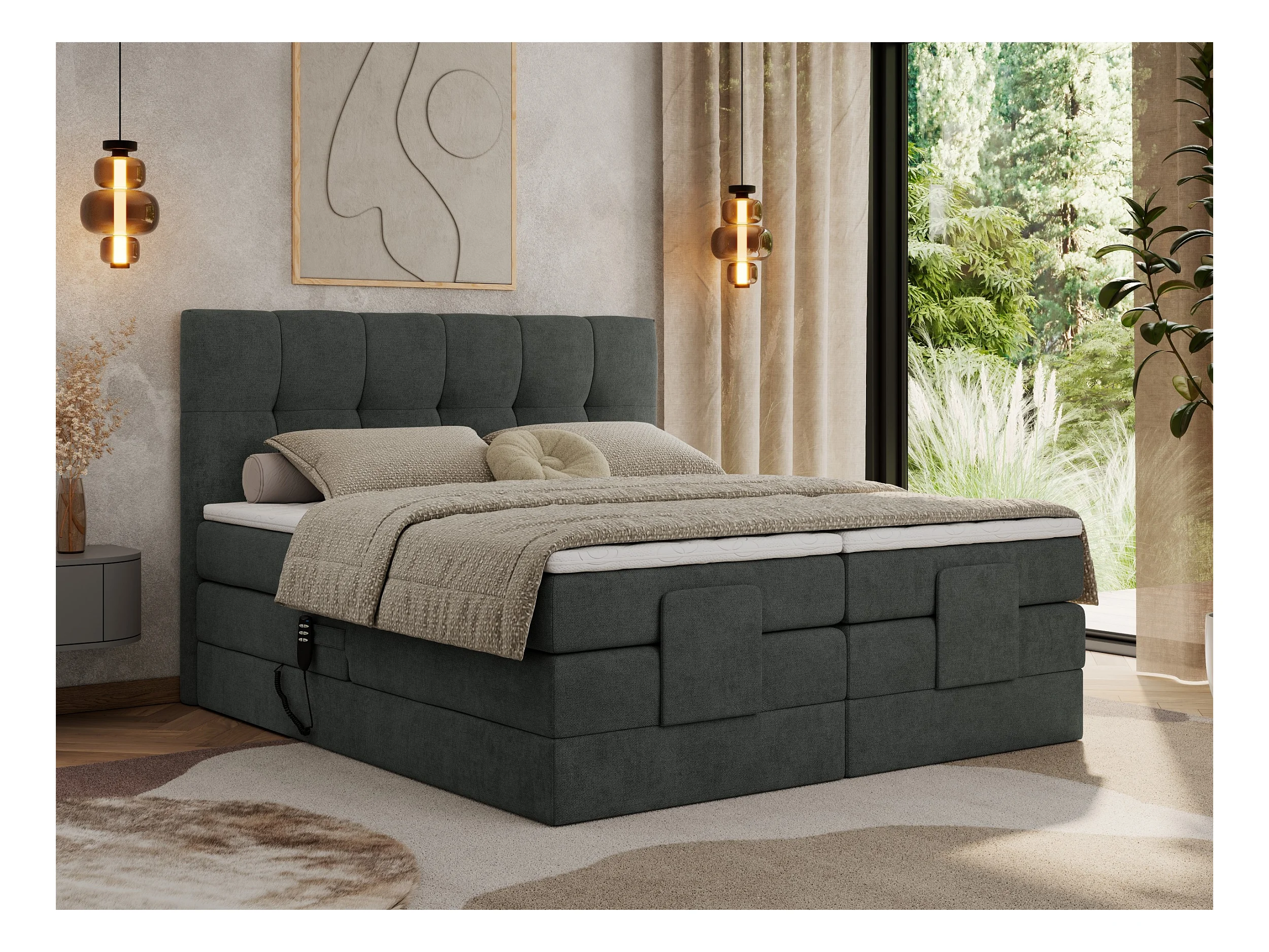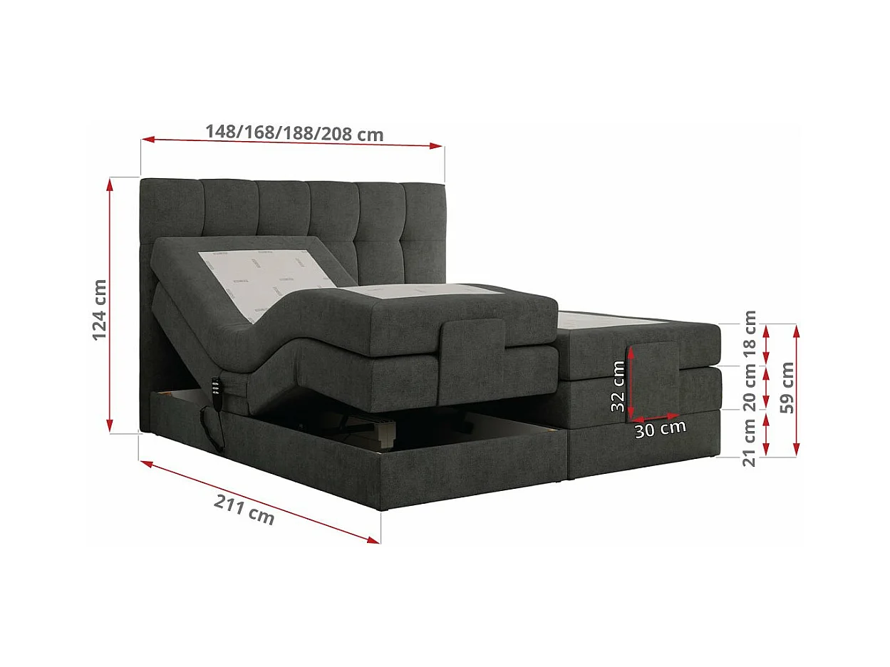 Boxspringbett VITTORIA - mit gestepptem Kopfteil, elektrischem Untergestell, Multipocket-Matratze - 140x200 cm - H3 - Dunkelgrau Strukture