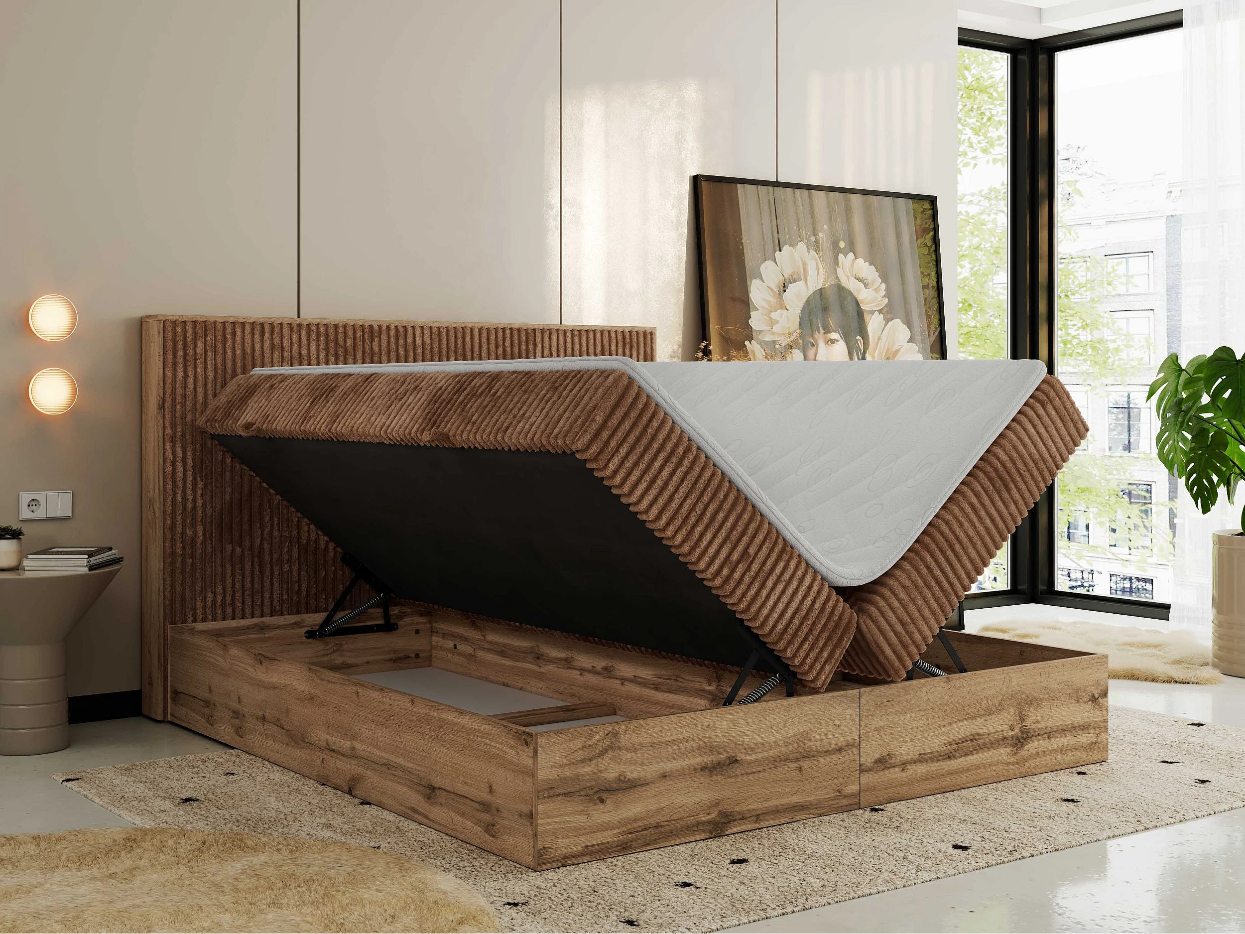 Boxspringbett WOOD CLASSIC - Doppelbett für Schlafzimmer, Set mit Multipocket-Matratze, Holzrahmen - 140x200 cm - H4 - Orange Cord