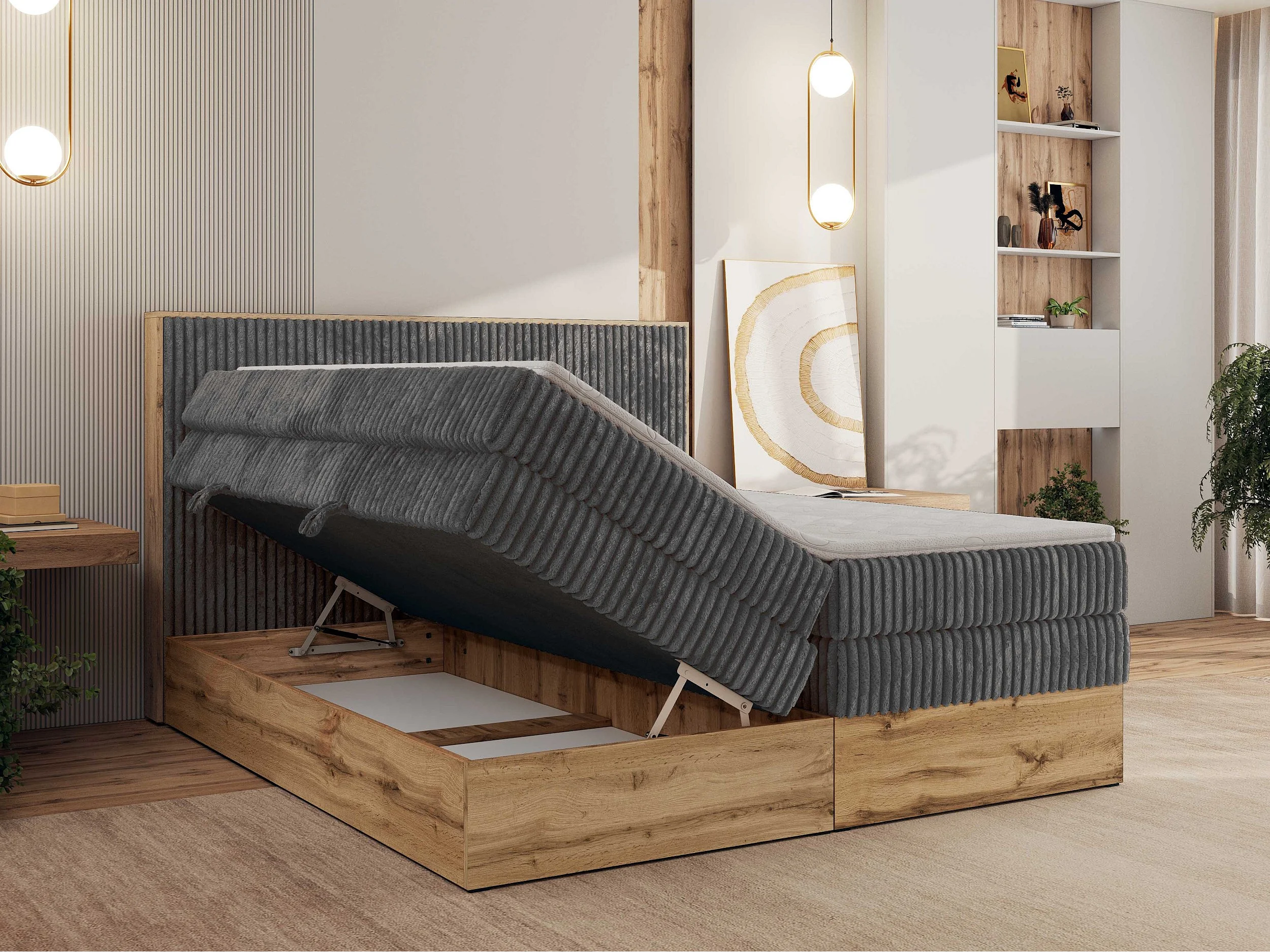 Boxspringbett WOOD CLASSIC KING - Polsterbett mit hohe Kopfteil, zwei Multipocket-Matratze, Bettkästen - 180x200 cm - H3 - Grau Cord