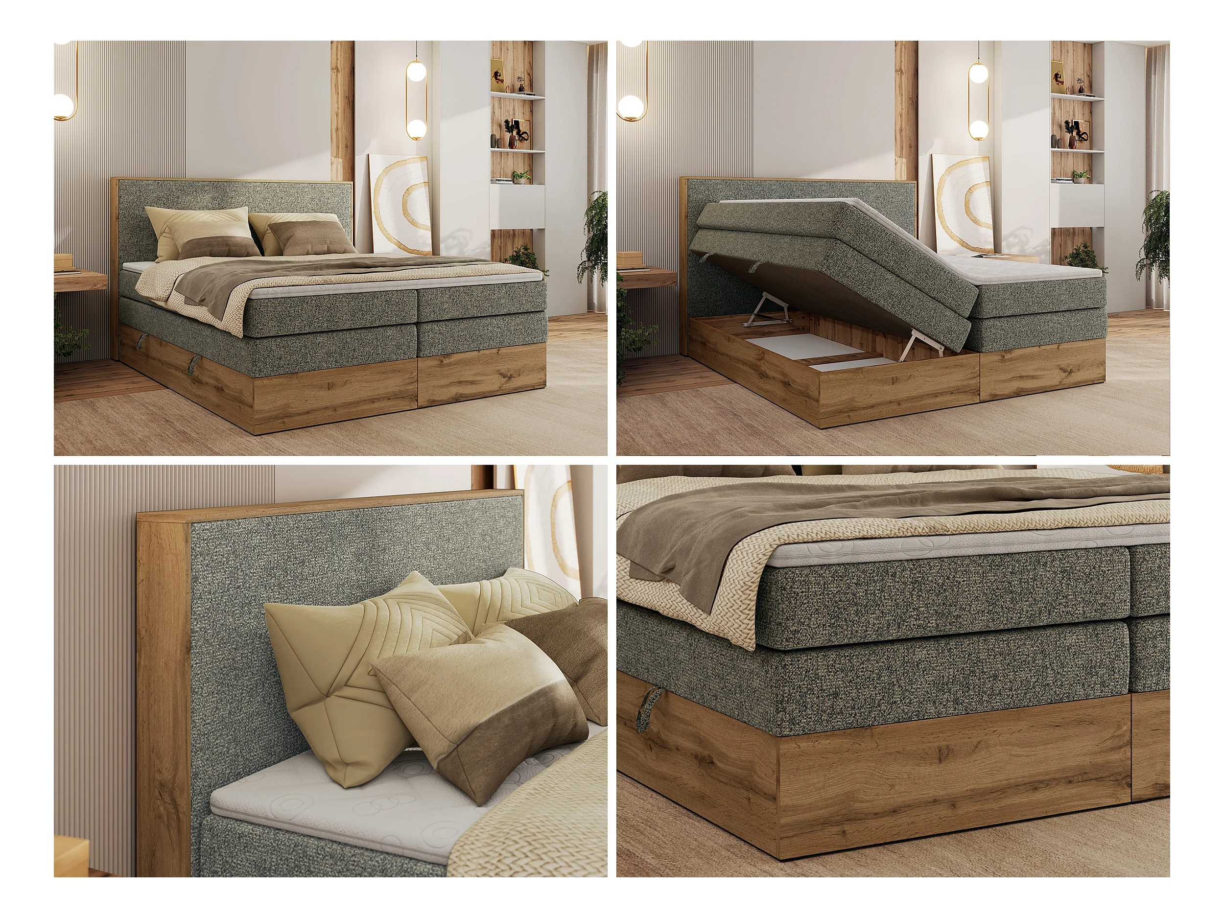 Boxspringbett WOOD CLASSIC KING - Polsterbett mit hohe Kopfteil, zwei Multipocket-Matratze, Bettkästen - 180x200 cm - H3 - Grau Strukture