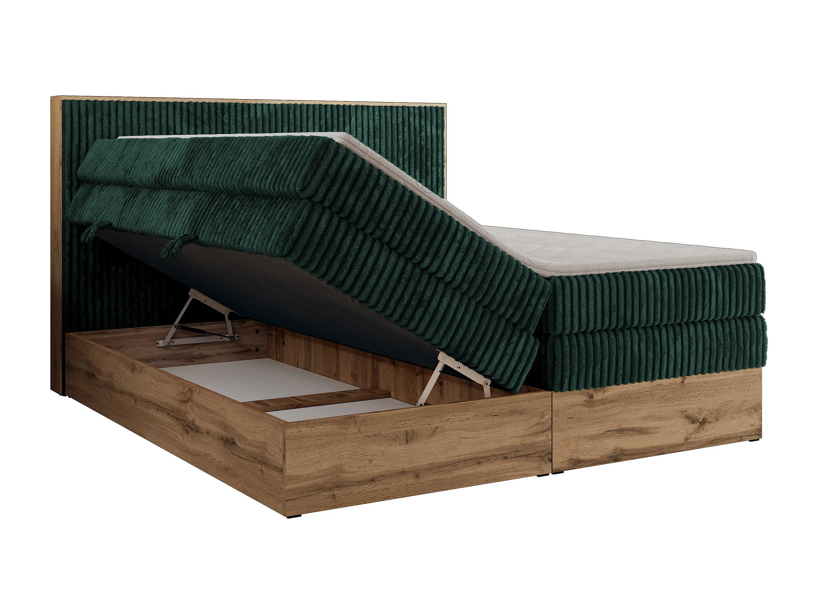 Boxspringbett WOOD CLASSIC KING - Polsterbett mit hohe Kopfteil, zwei Multipocket-Matratze, Bettkästen - 200x200 cm - H3 - Dunkelgrün Cord