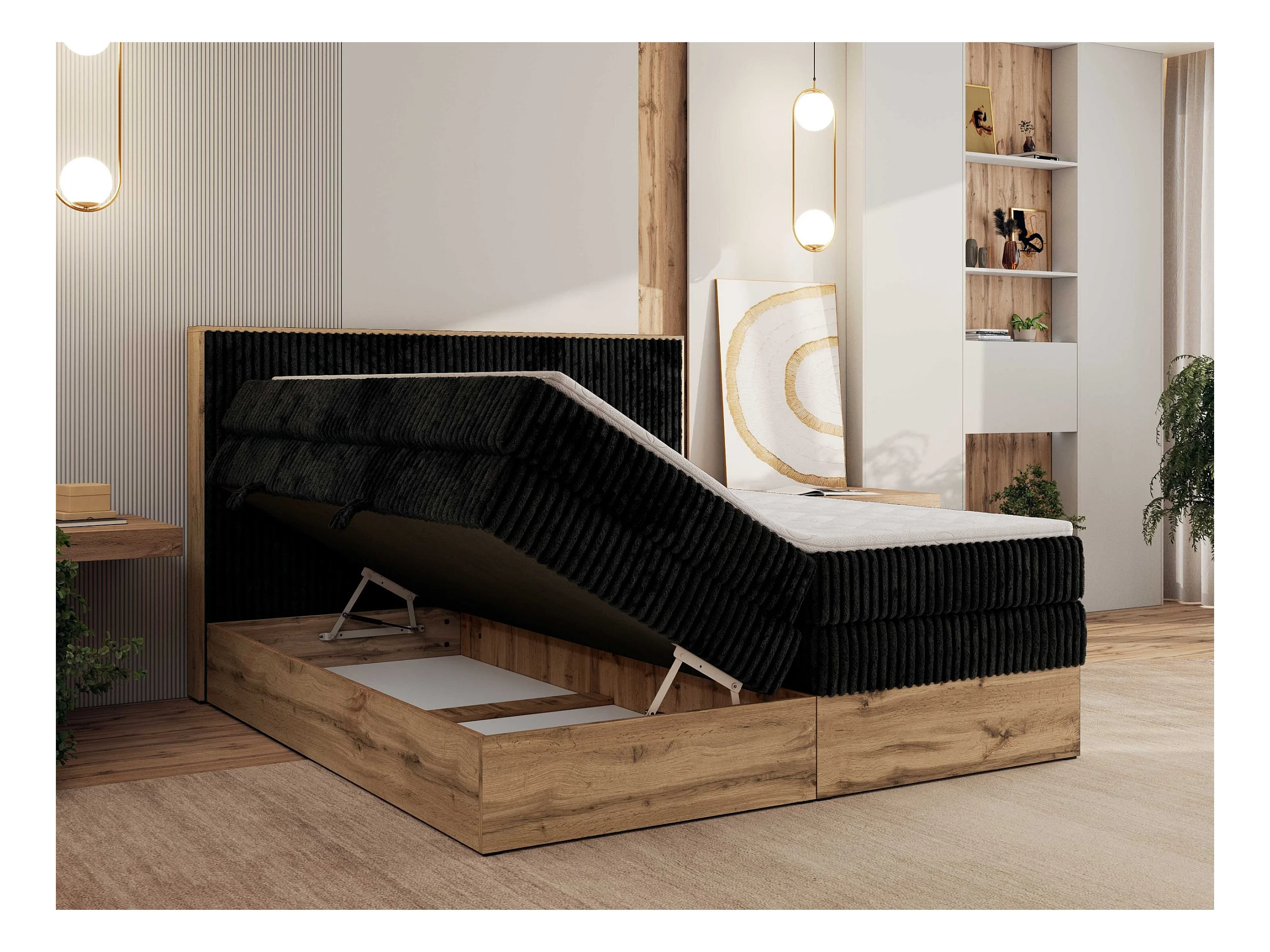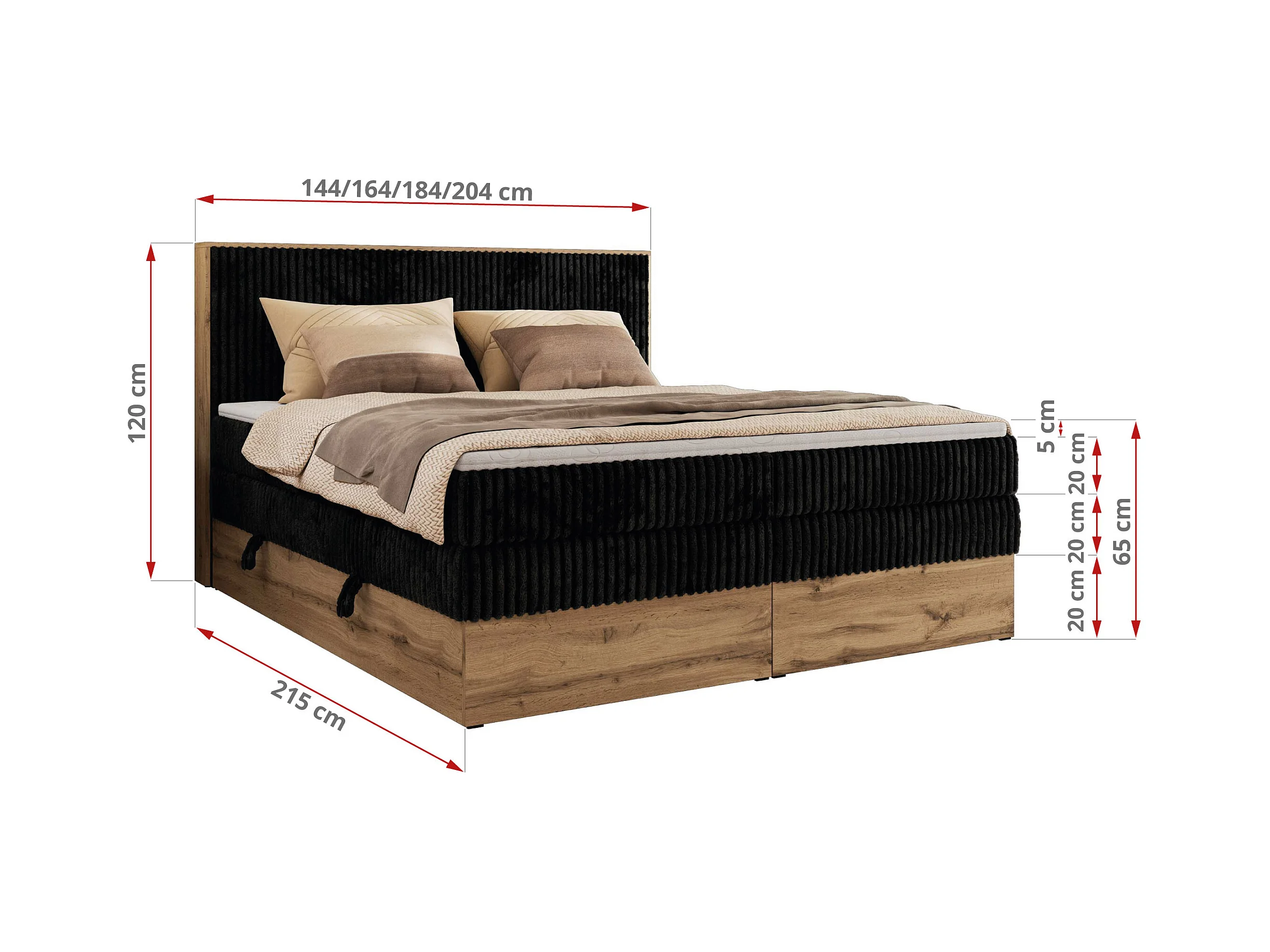 Boxspringbett WOOD CLASSIC KING - Polsterbett mit hohe Kopfteil, zwei Multipocket-Matratze, Bettkästen - 200x200 cm - H3 - Schwarz Cord