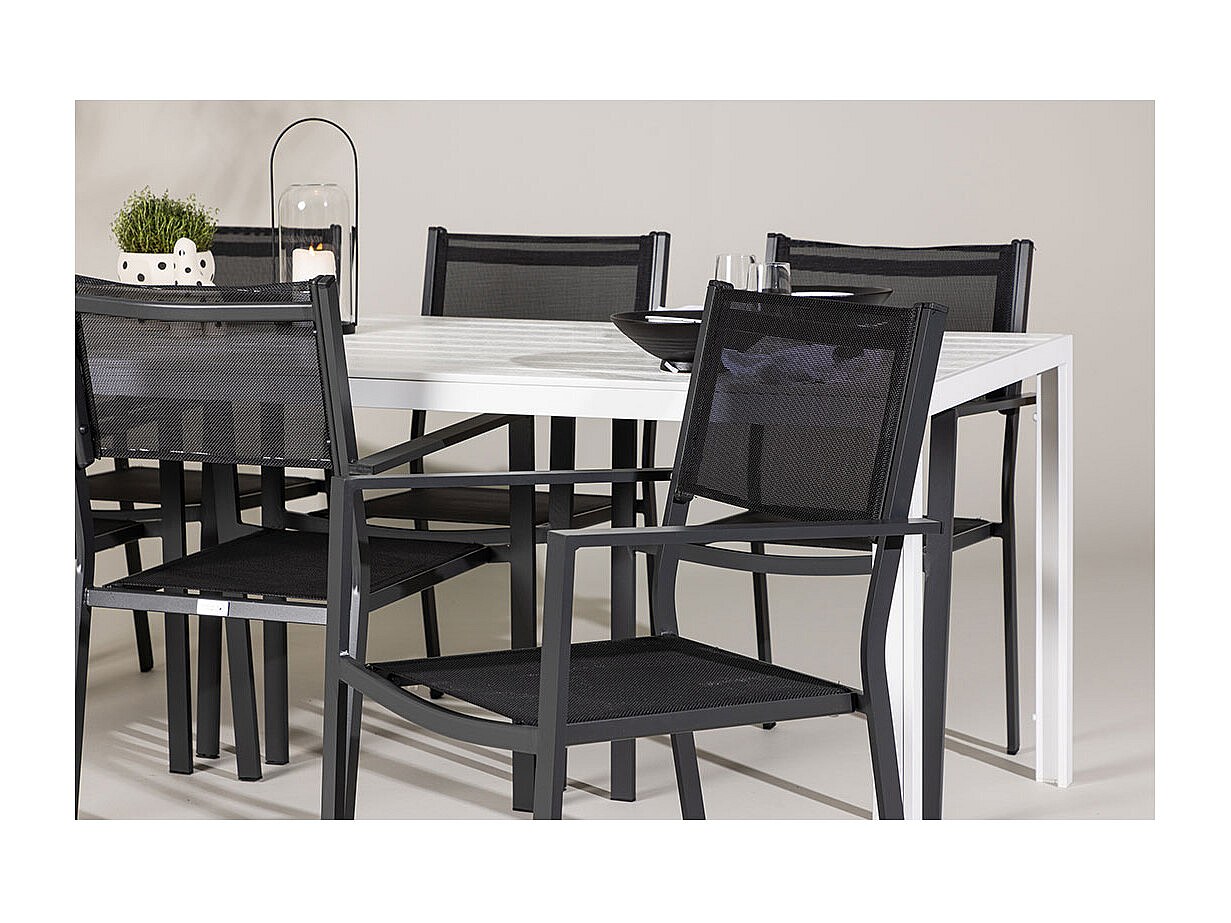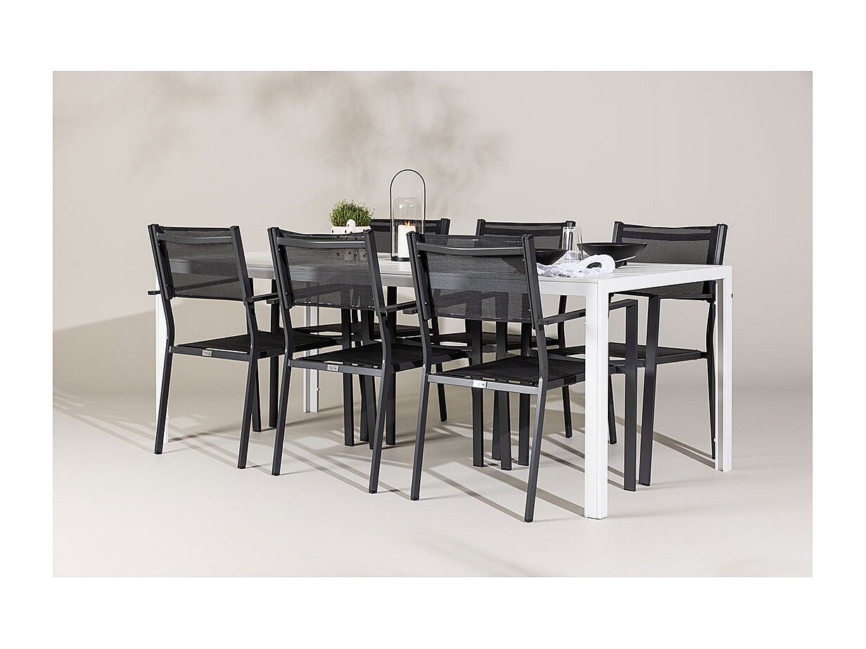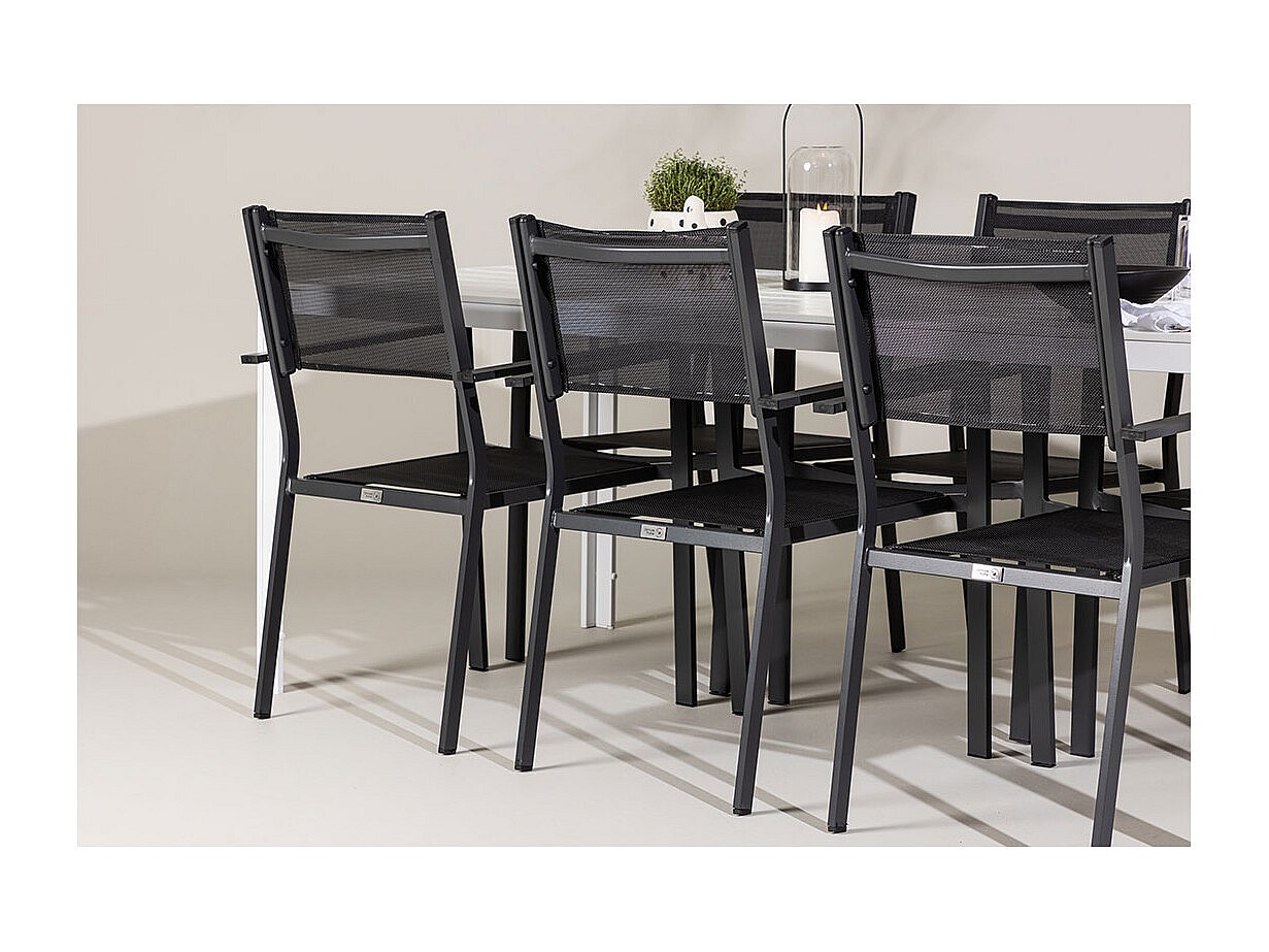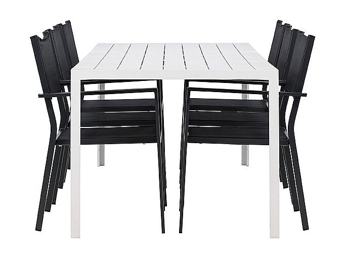 Das Break Gartenset ist eine stilvolle und moderne Lösung für alle, die einen eleganten und funktionalen Essbereich im Freien wünschen. Der große Tisch (90 x 205 cm) bietet viel Platz für die ganze Familie oder Gäste bei sommerlichen Dinnerpartys. Die weiße Tischplatte bildet einen schönen Kontrast zu den sechs schwarzen Stühlen mit bequemer Sitzfläche und Rückenlehne aus Netzmaterial. Die Stühle sind stapelbar und lassen sich platzsparend verstauen. Das robuste Gestell und der gute Sitzkomfort machen dieses Set praktisch und einladend für Garten, Terrasse oder Balkon. Das Set hat eine maximale Tragkraft von 110 kg pro Stuhl.