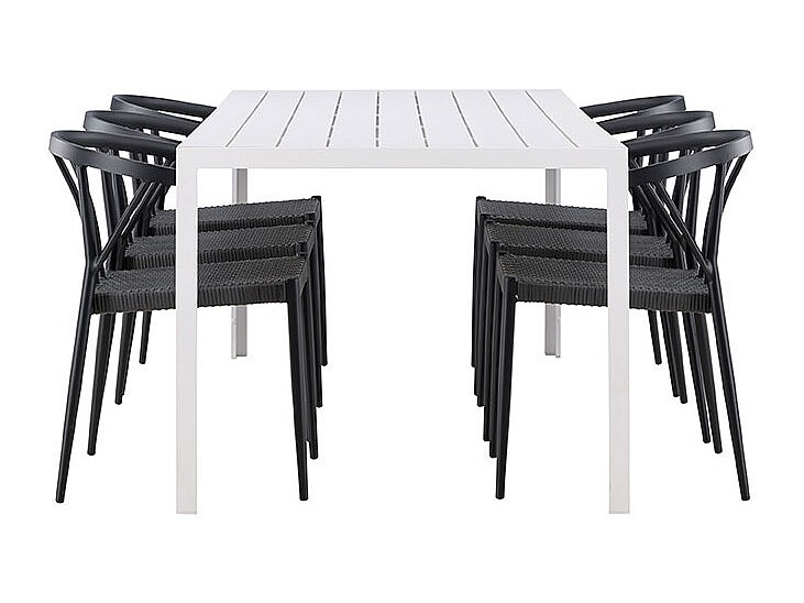 Break Gartenset Tisch 90x205cm weiß, 6 Stühle schwarz.