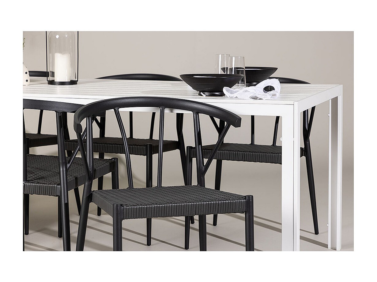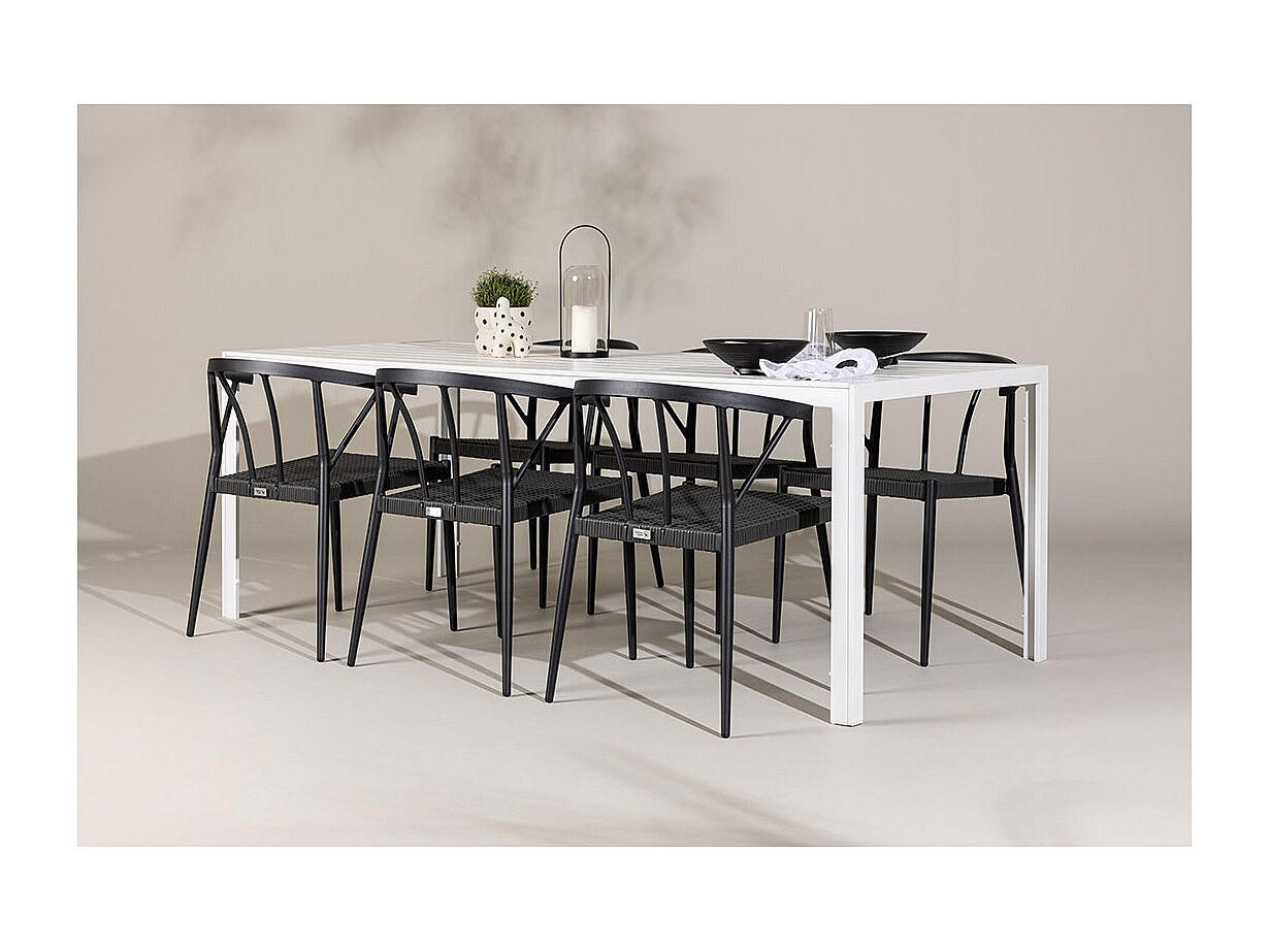 Dieses stilvolle Break Gartenset vereint minimalistische Eleganz mit praktischer Funktionalität. Der weiße Tisch mit pulverbeschichtetem Aluminiumgestell und langer, schmaler Tischplatte schafft einen luftigen und modernen Essbereich im Freien. Die sechs schwarzen Stühle mit X-förmiger Rückenlehne und korbähnlichen Sitzflächen verleihen einen klassischen und einladenden Look. Die Stühle sind leicht, stapelbar und nach der Saison einfach zu verstauen. Das Set eignet sich ideal für alles, vom Morgenkaffee bis zum gemütlichen Grillabend im Garten, auf der Terrasse oder dem Balkon.