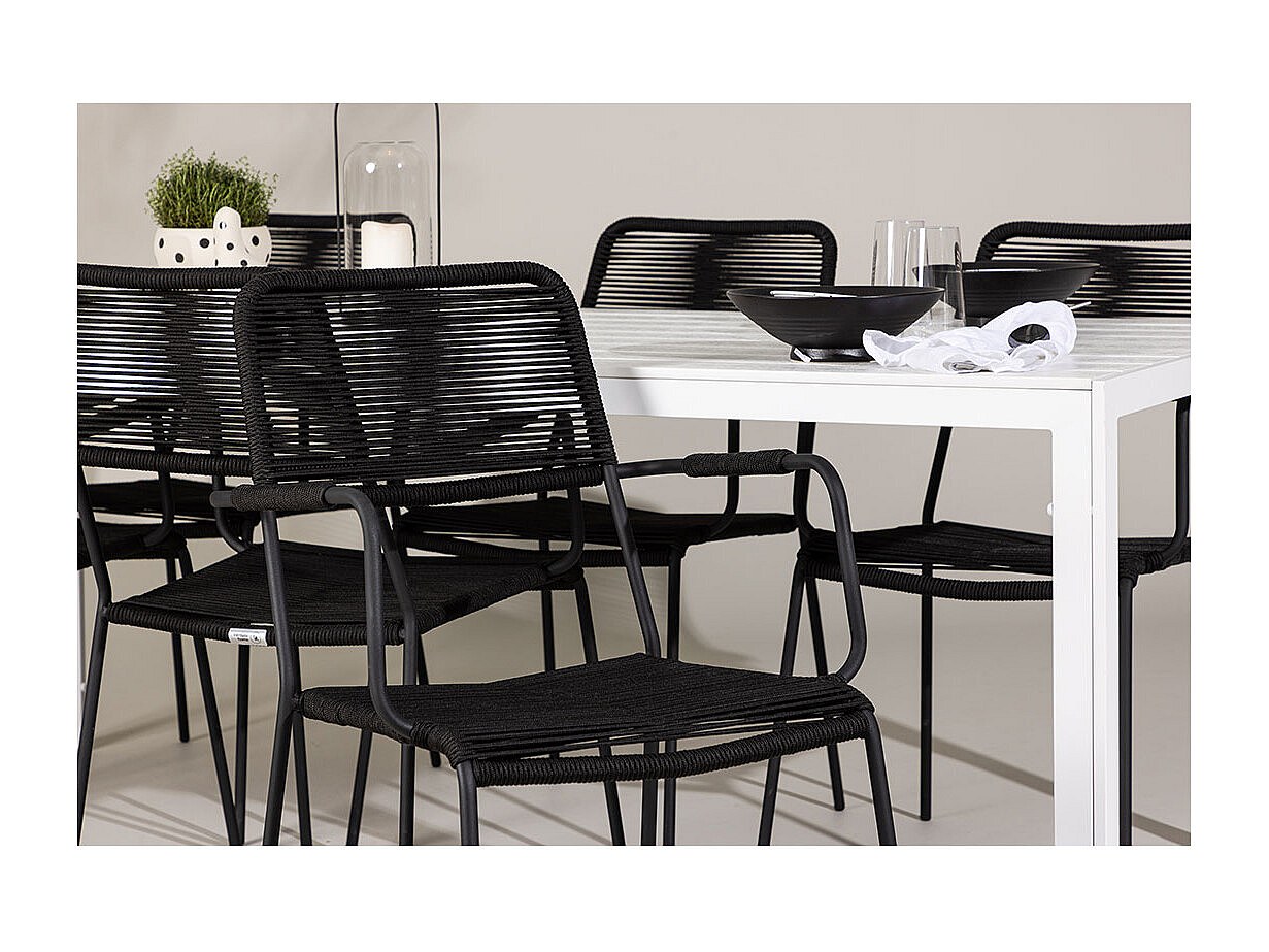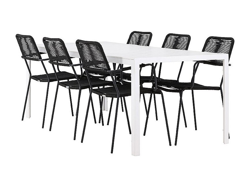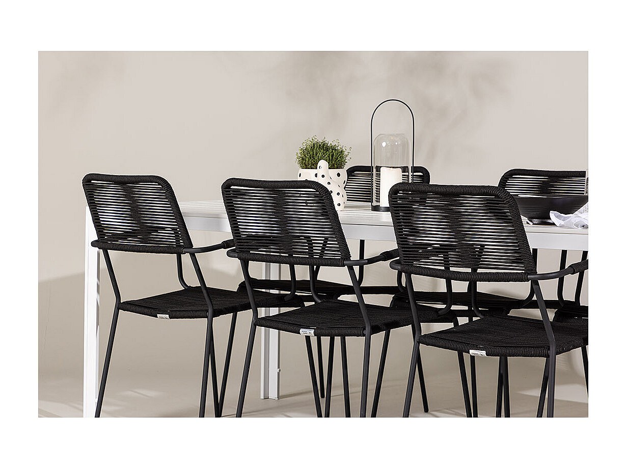 Mit seinem minimalistischen und klaren Look passt dieses Break Gartenset perfekt zu jeder modernen Außeneinrichtung. Der weiße Aluminiumtisch ist 205 cm lang und bietet ausreichend Platz für sechs Personen. Die schwarzen Stühle mit elegantem Kordelgeflecht und filigranen, runden Beinen sorgen für Leichtigkeit und eine entspannte Lounge-Atmosphäre. Die Stühle sind bequem und funktional zugleich – sie sind stapelbar und haben eine hohe Tragkraft von 150 kg. Die ideale Wahl für alle, die ein Gartenset suchen, das Ästhetik und Funktionalität vereint.