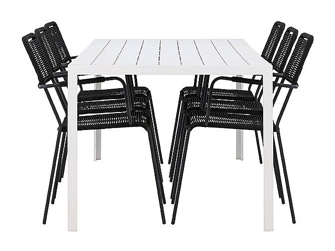Break Gartenset Tisch 90x205cm weiß, 6 Stühle schwarz.