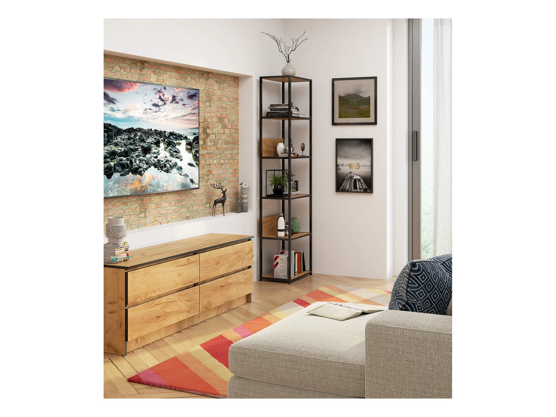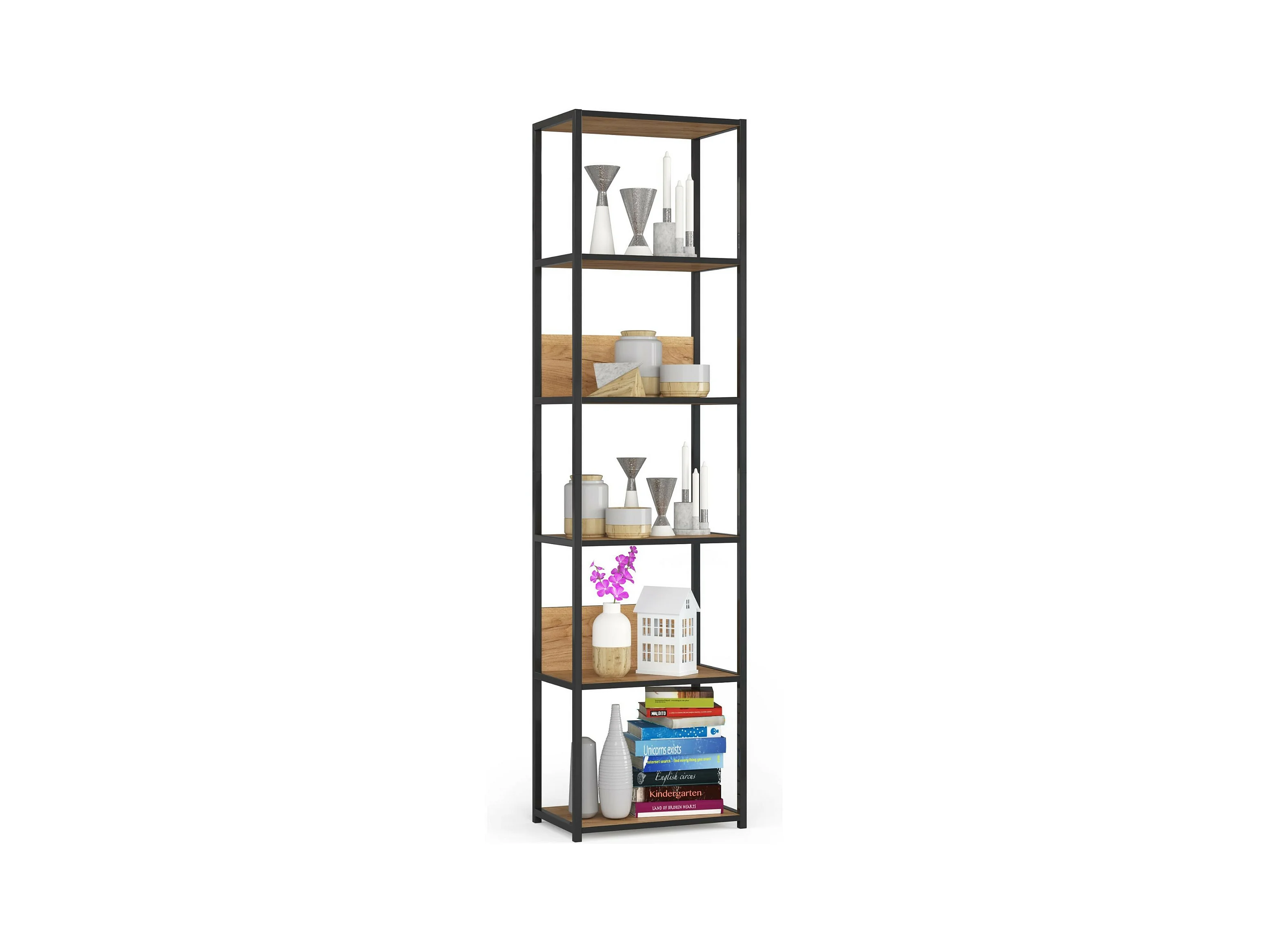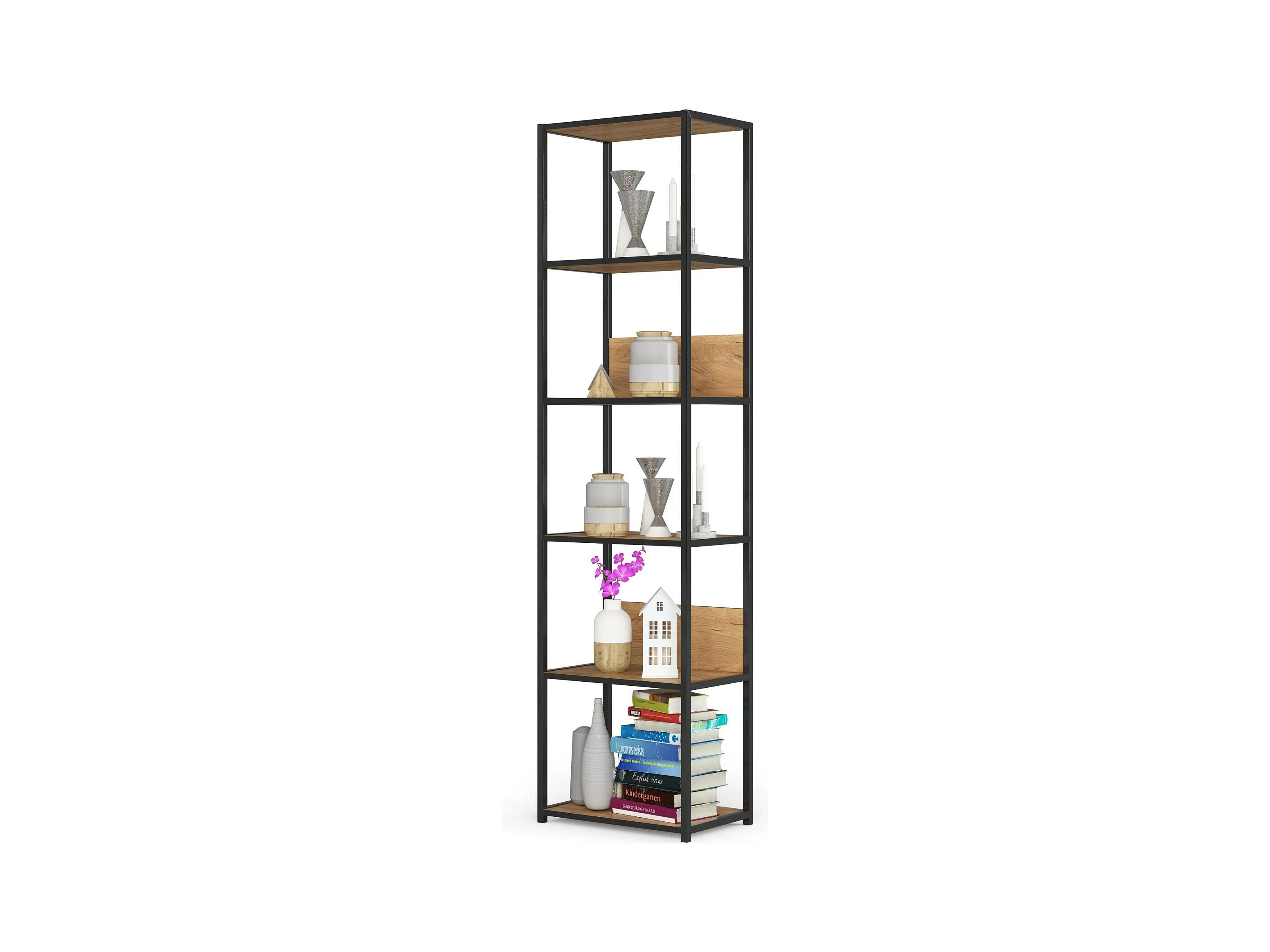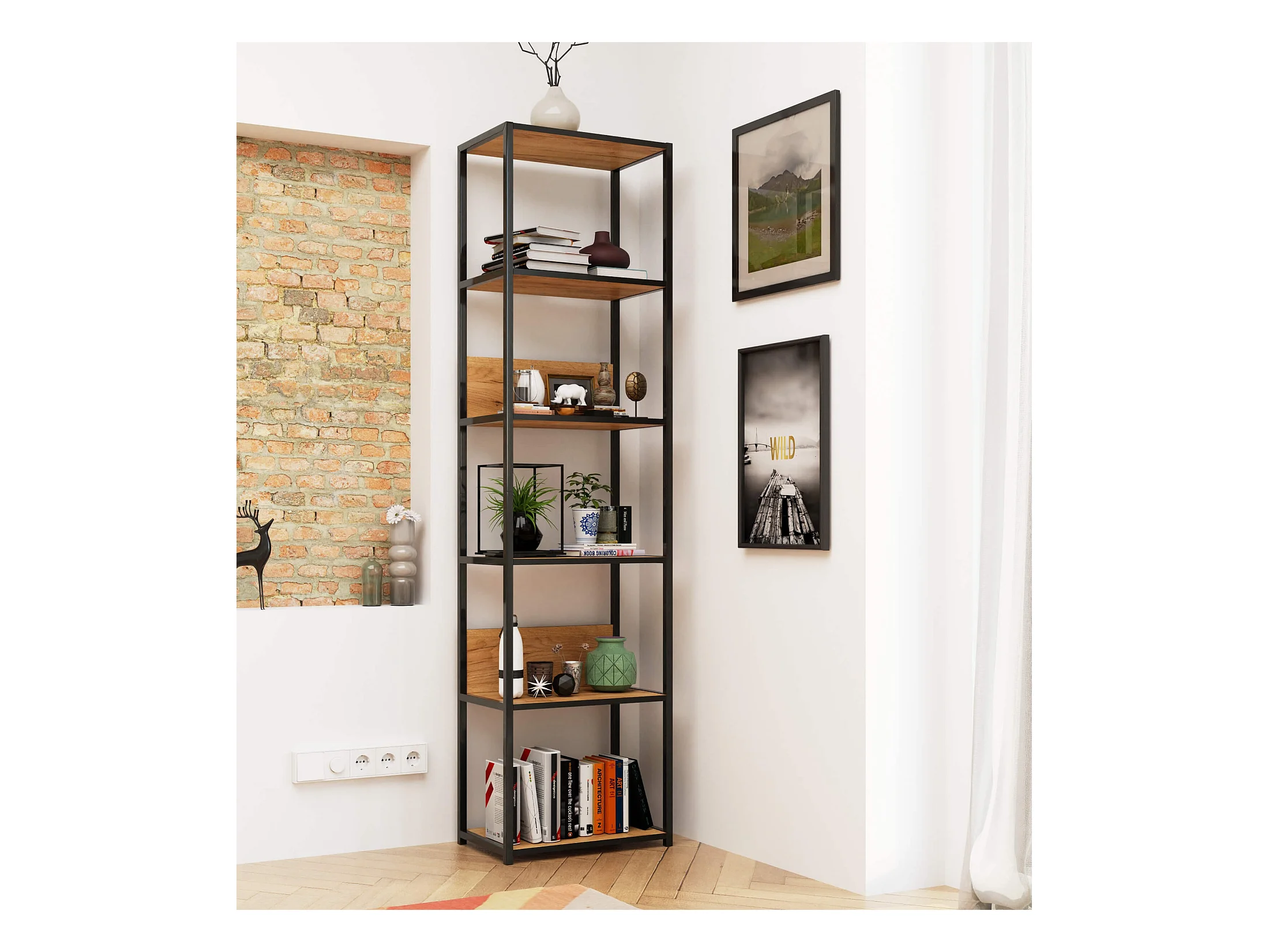 Bücherregal AKORD Metallregal mit Ebenen aus Holzwerkstoff Schwarz Breite 50 cm 6 Ebenen Eiche Craft B50 x H192 x T32 cm