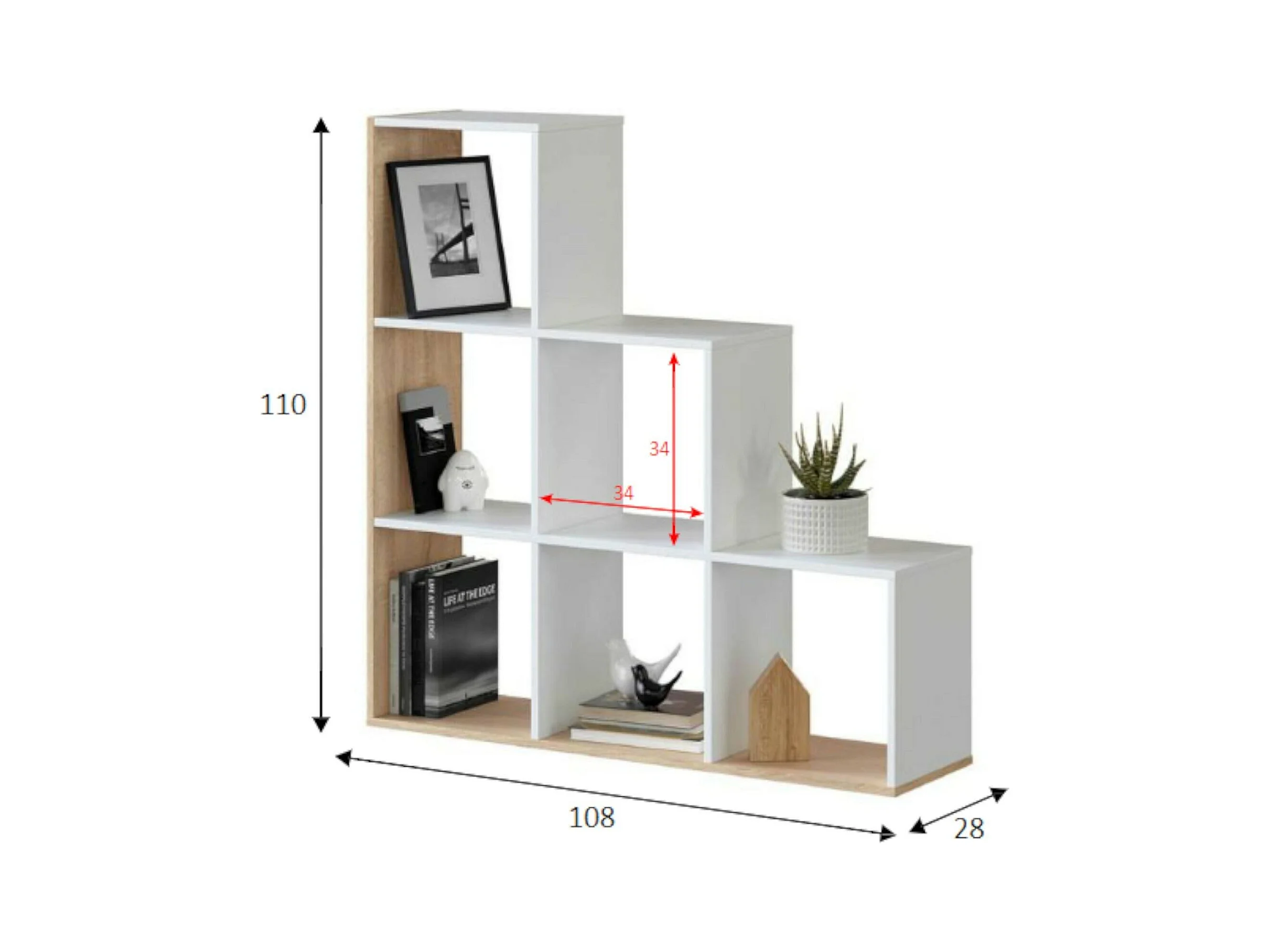 Bücherregal Dbarth, Doppelseitiges Bücherregal mit 6 Fächern, Bürotrennregal, 108x28h110 cm, Weiß und Eiche