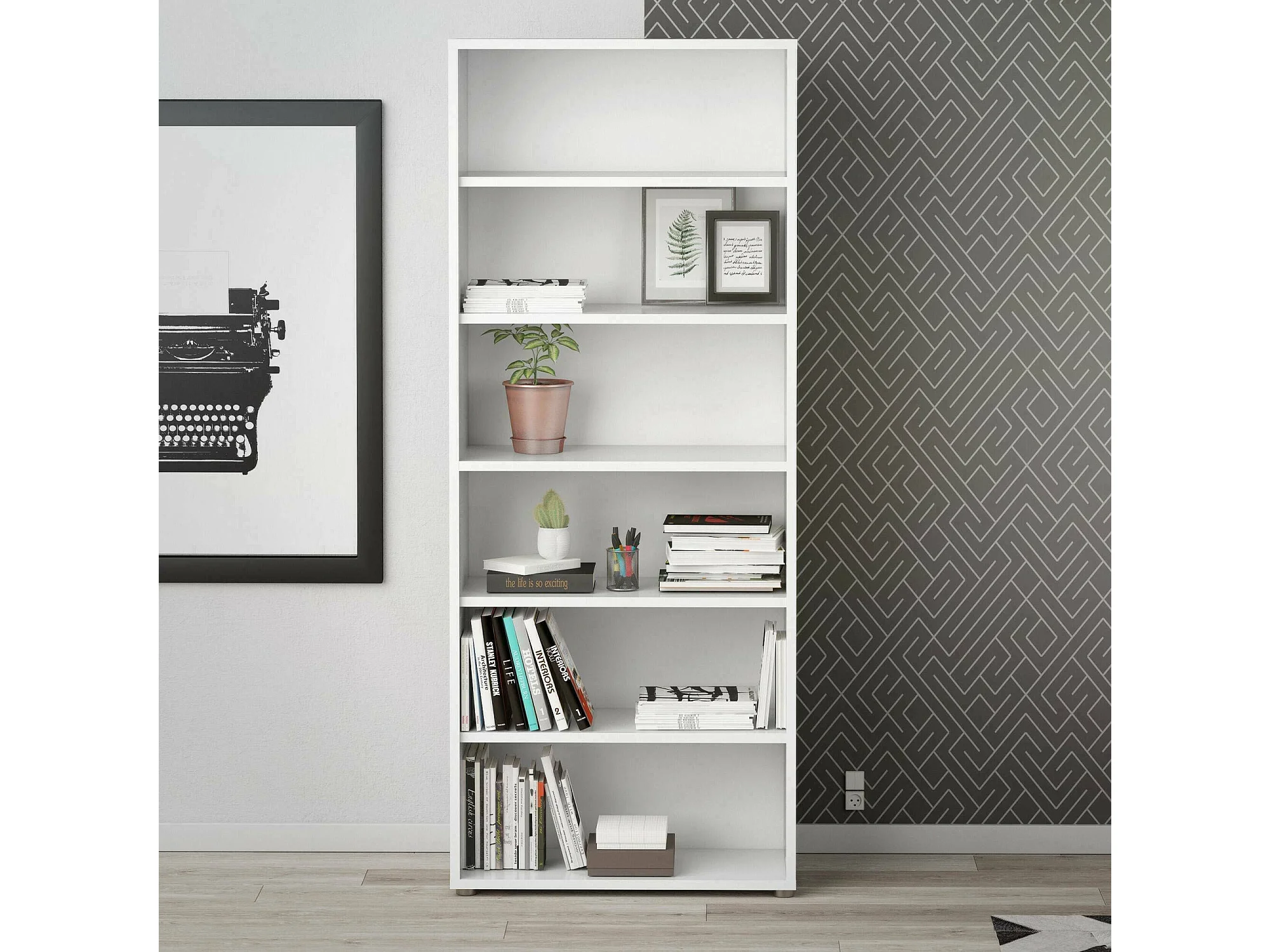 Bücherregal Dtenton, Büroregal, Mobiler Buchhalter, Bücherbrett, 89x40 h222 cm, Weiß