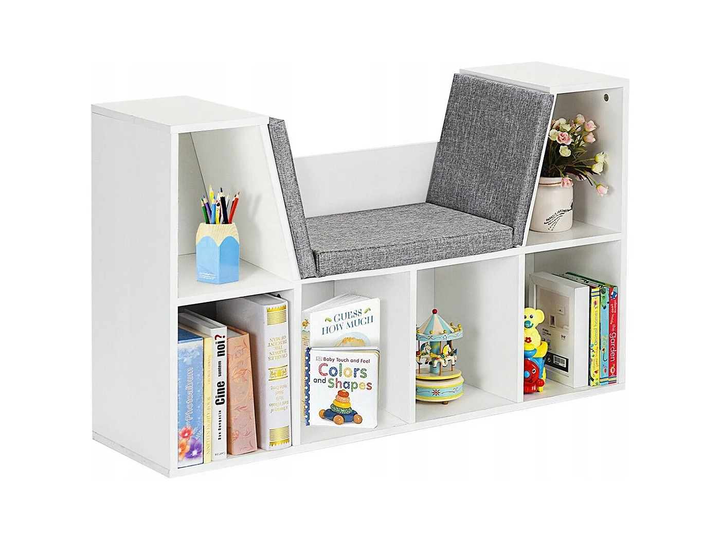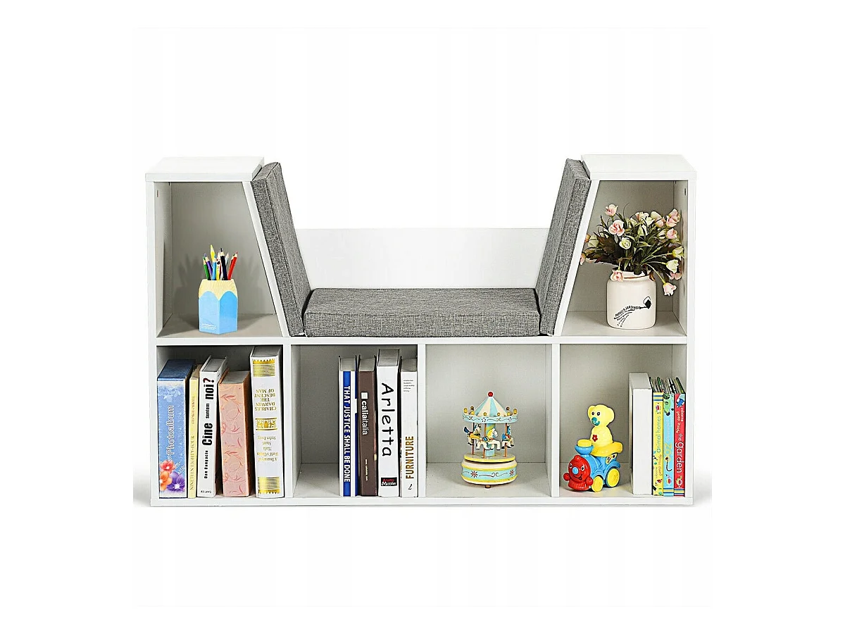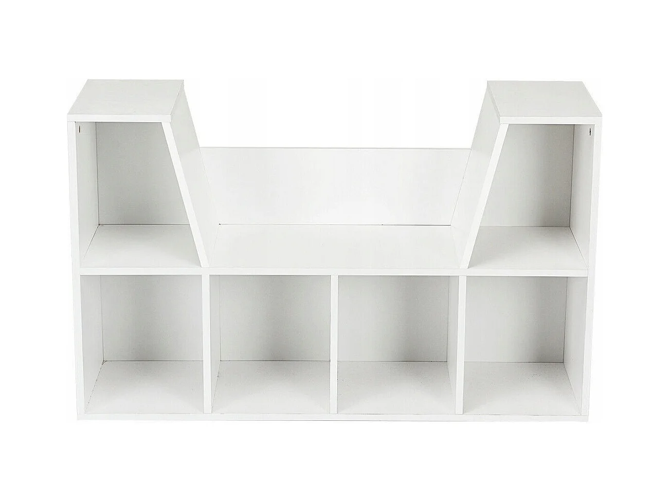Kinder-Aufbewahrungsregal mit gepolsterten Kissen und 7 Fächern, Schuhbank aus weißem Holz 102x30x63cm