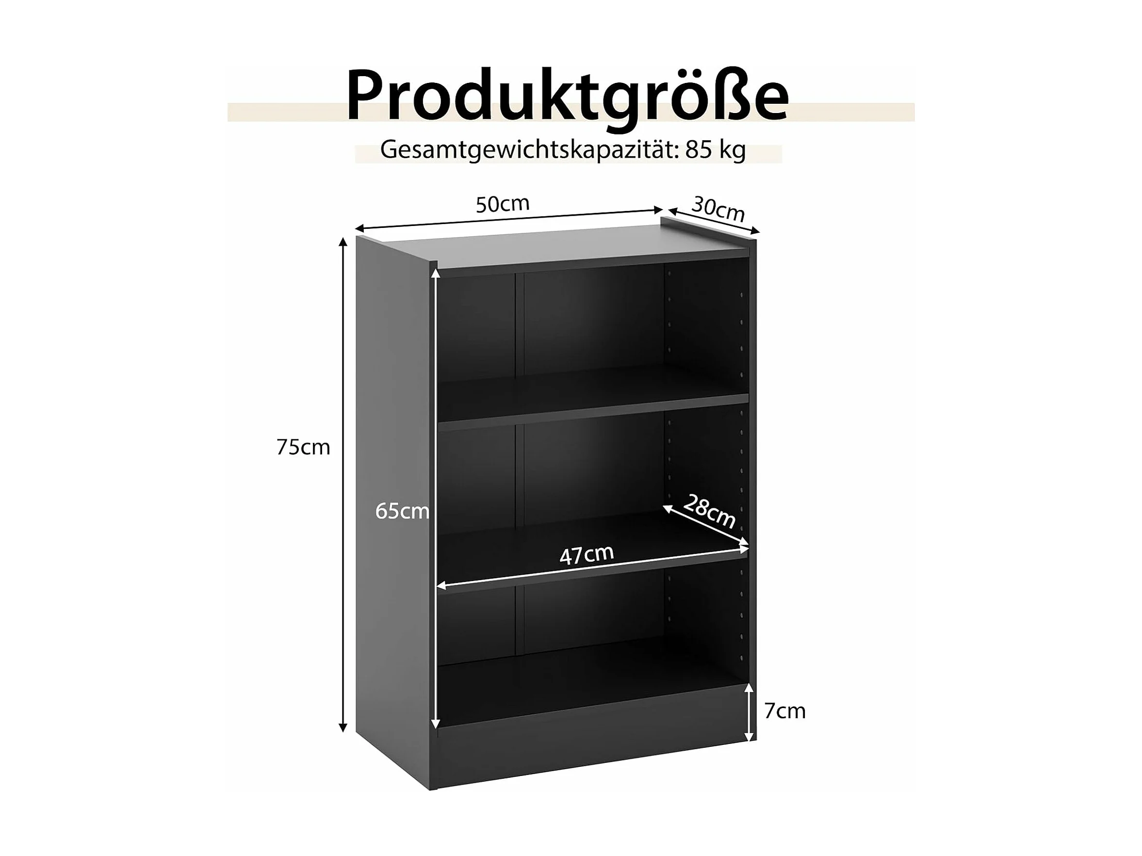 Bücherregal, Standregal mit 3 Fächern, Regal mit verstellbaren Regalen, 30x50x75cm, Schwarz ON32670