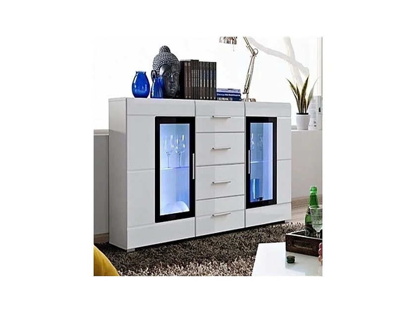 Buffet KRONI mit LED-Beleuchtung - 4 Schubladen und 2 Glastüren - Mattweiß und Glänzend - 150 x 82 x 40 cm