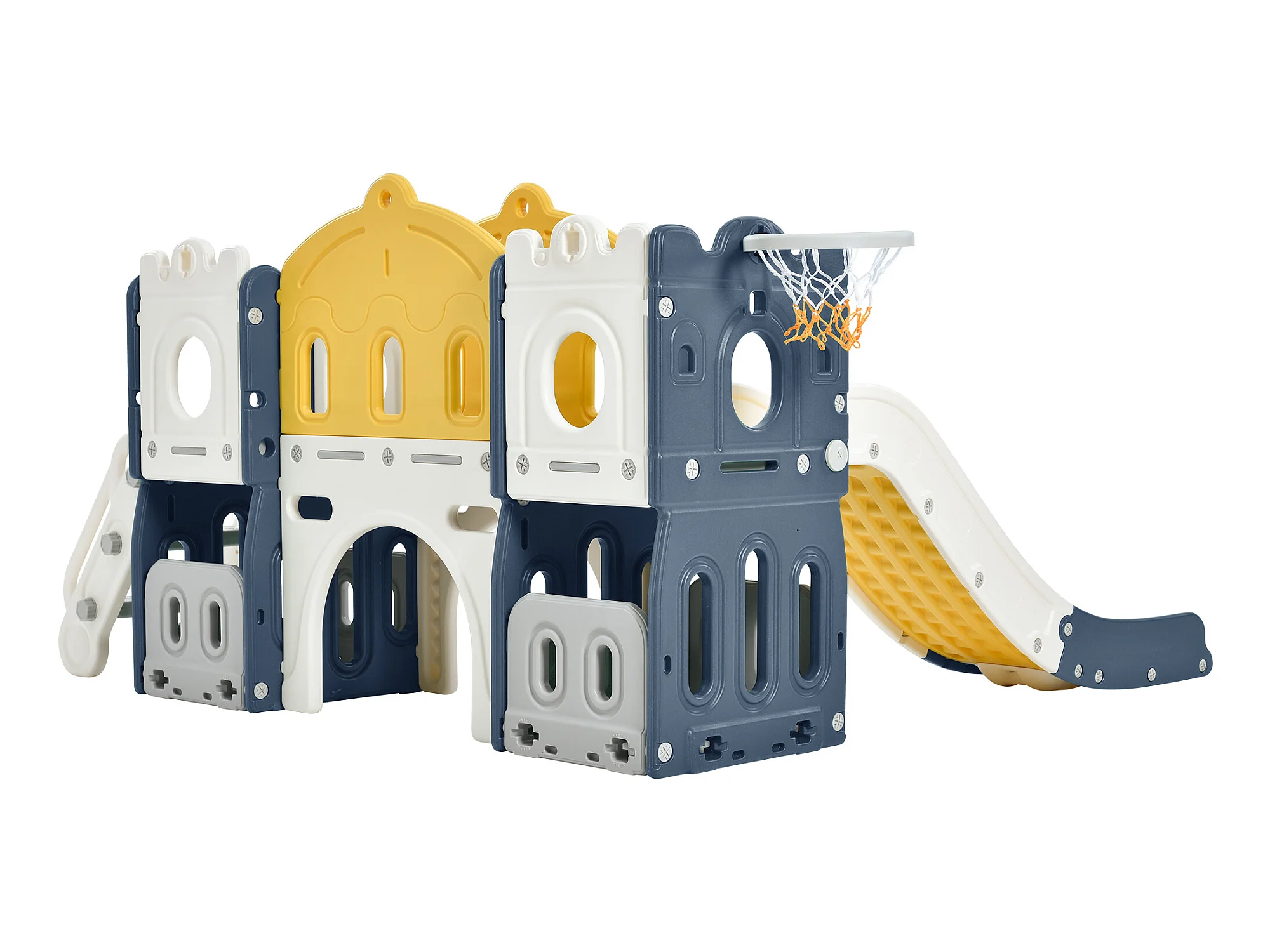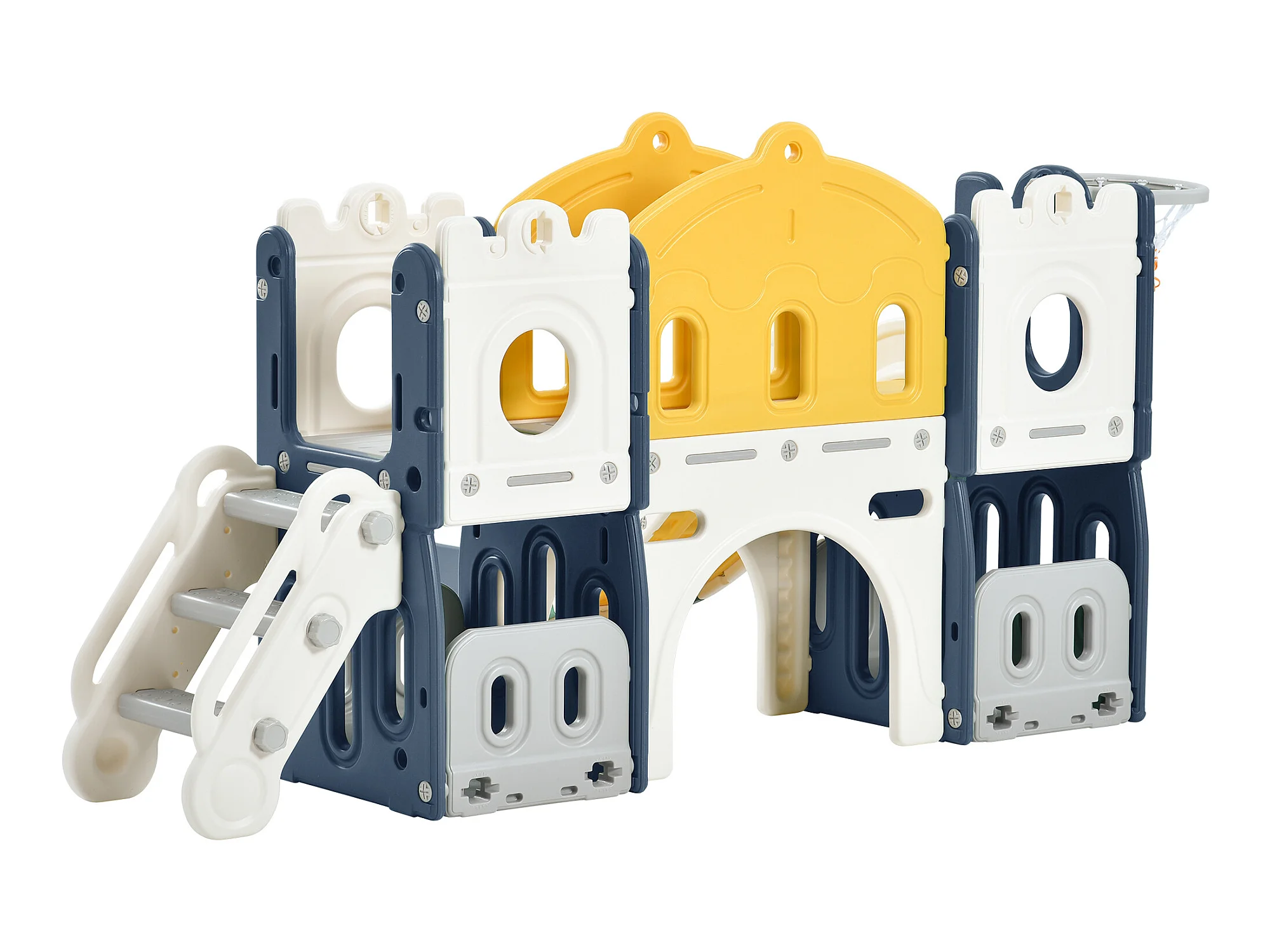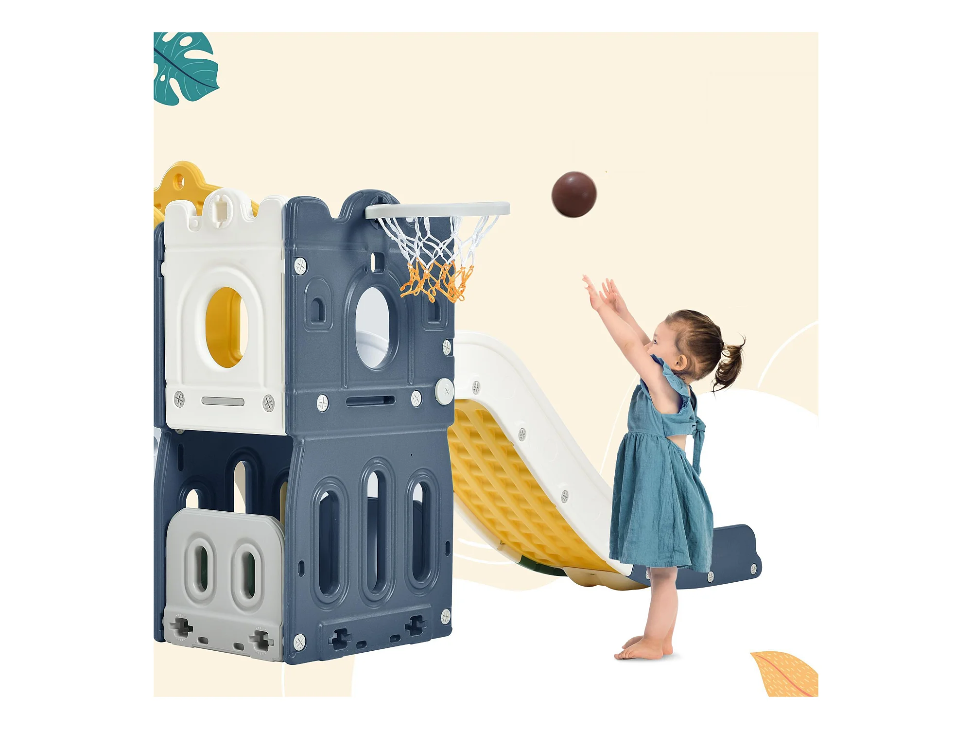 Burgförmige Rutsche mit Kletter-, Tunnel-, Stauraum- und Basketballkorb – blau