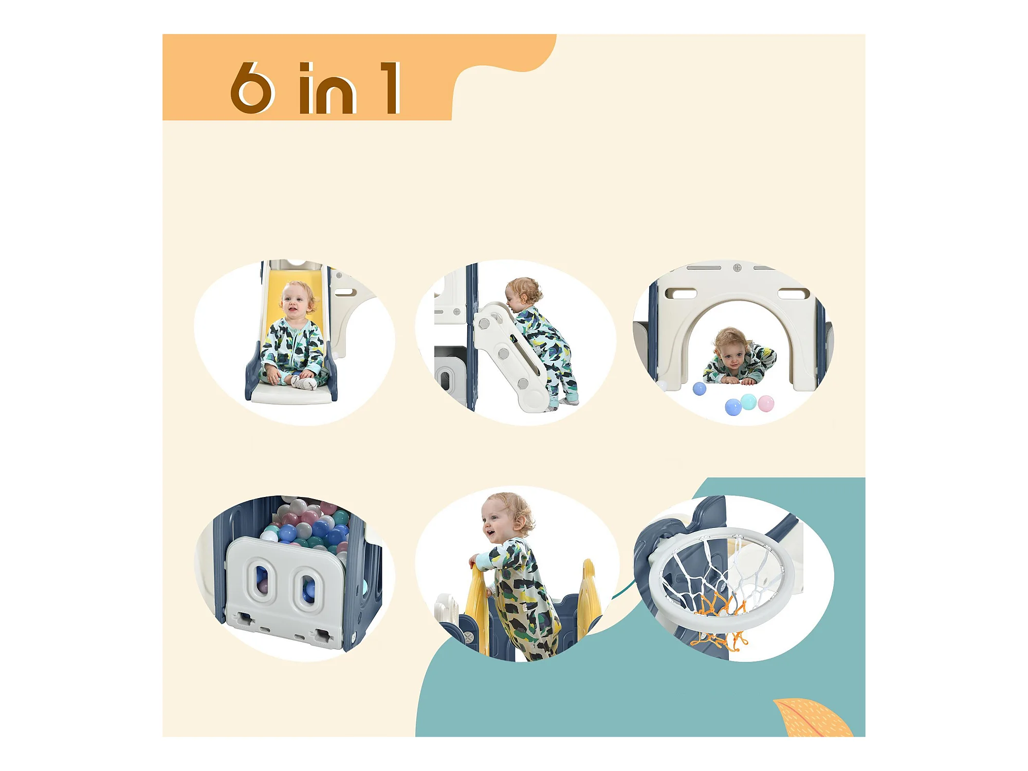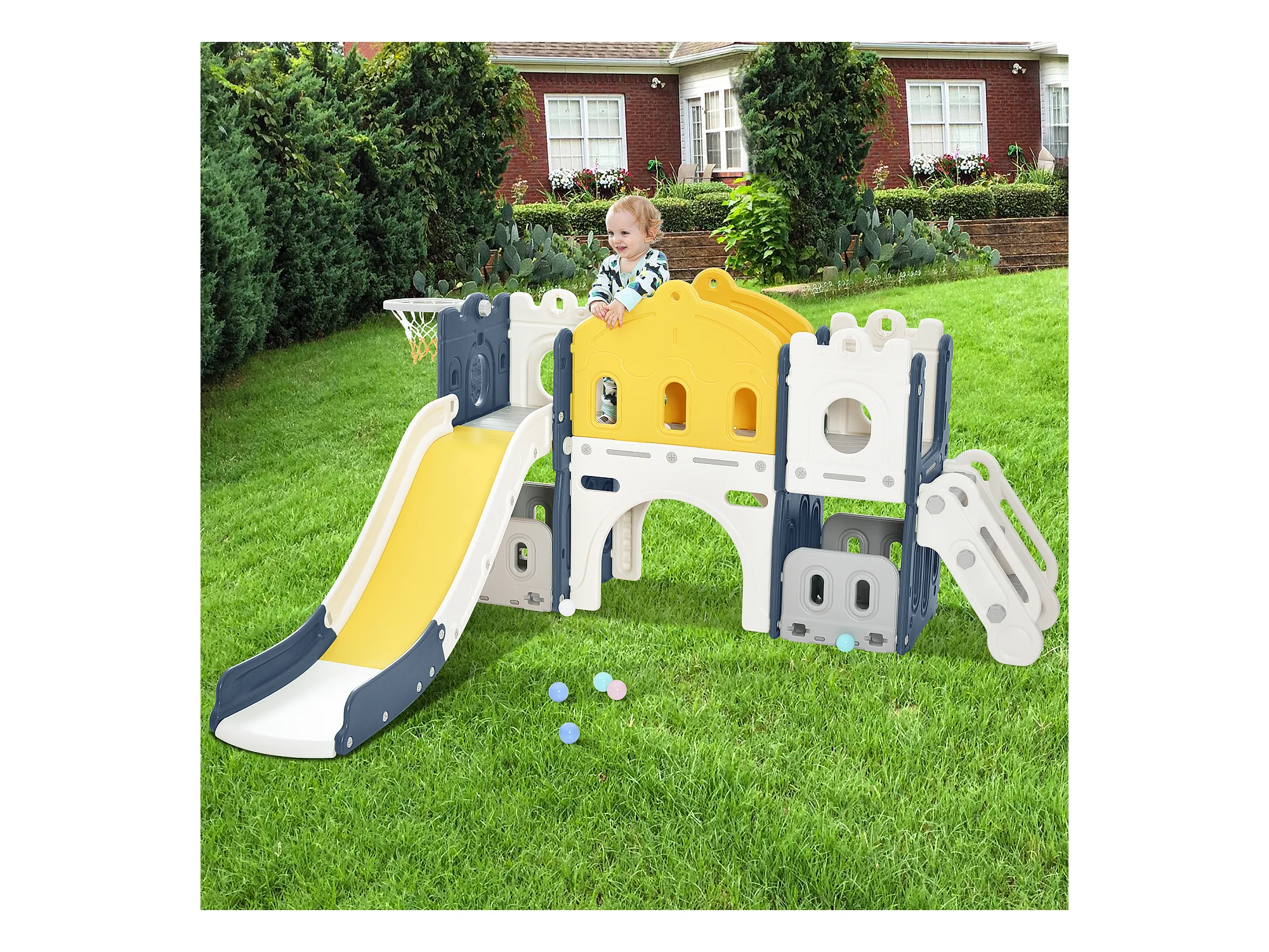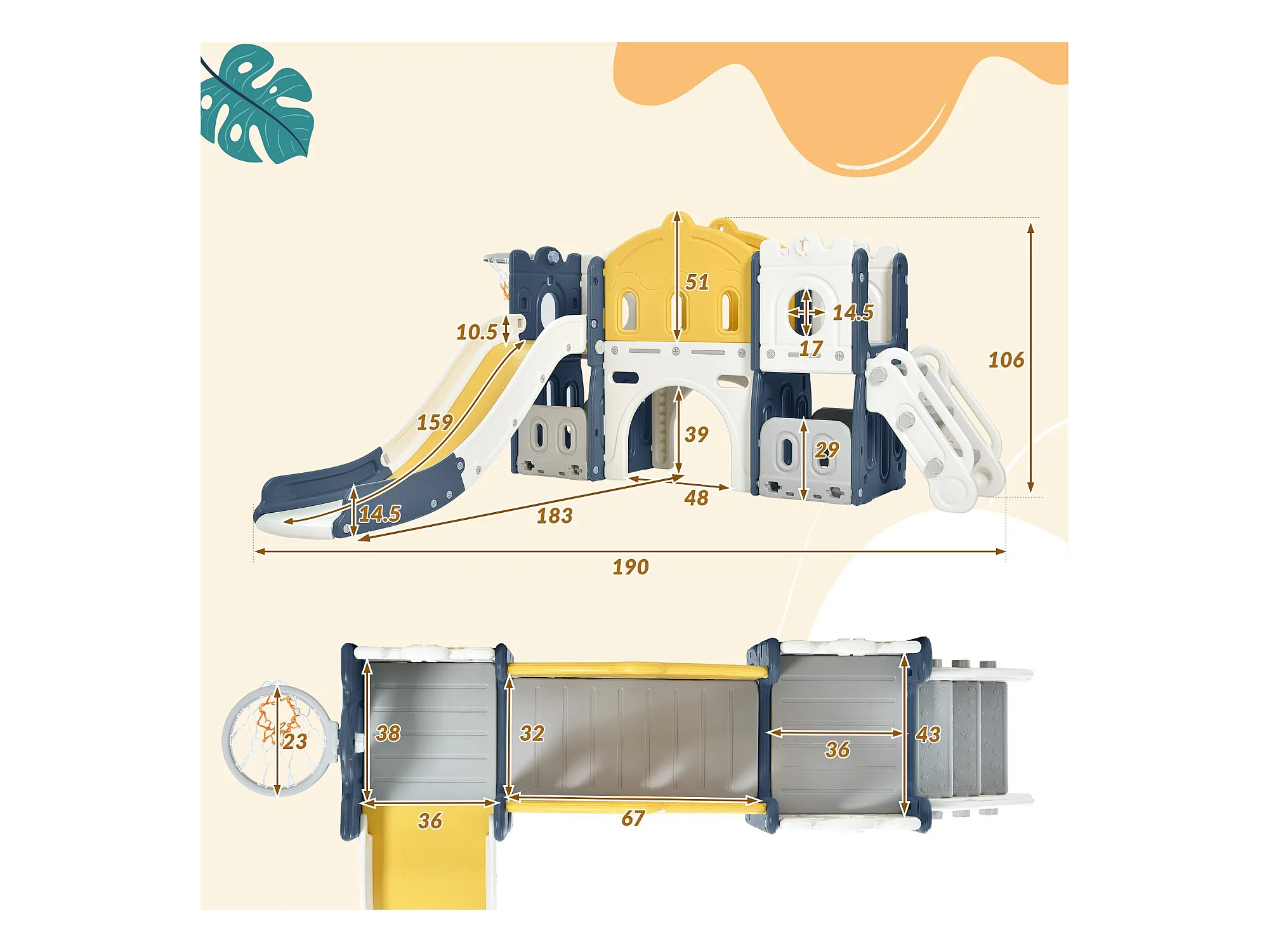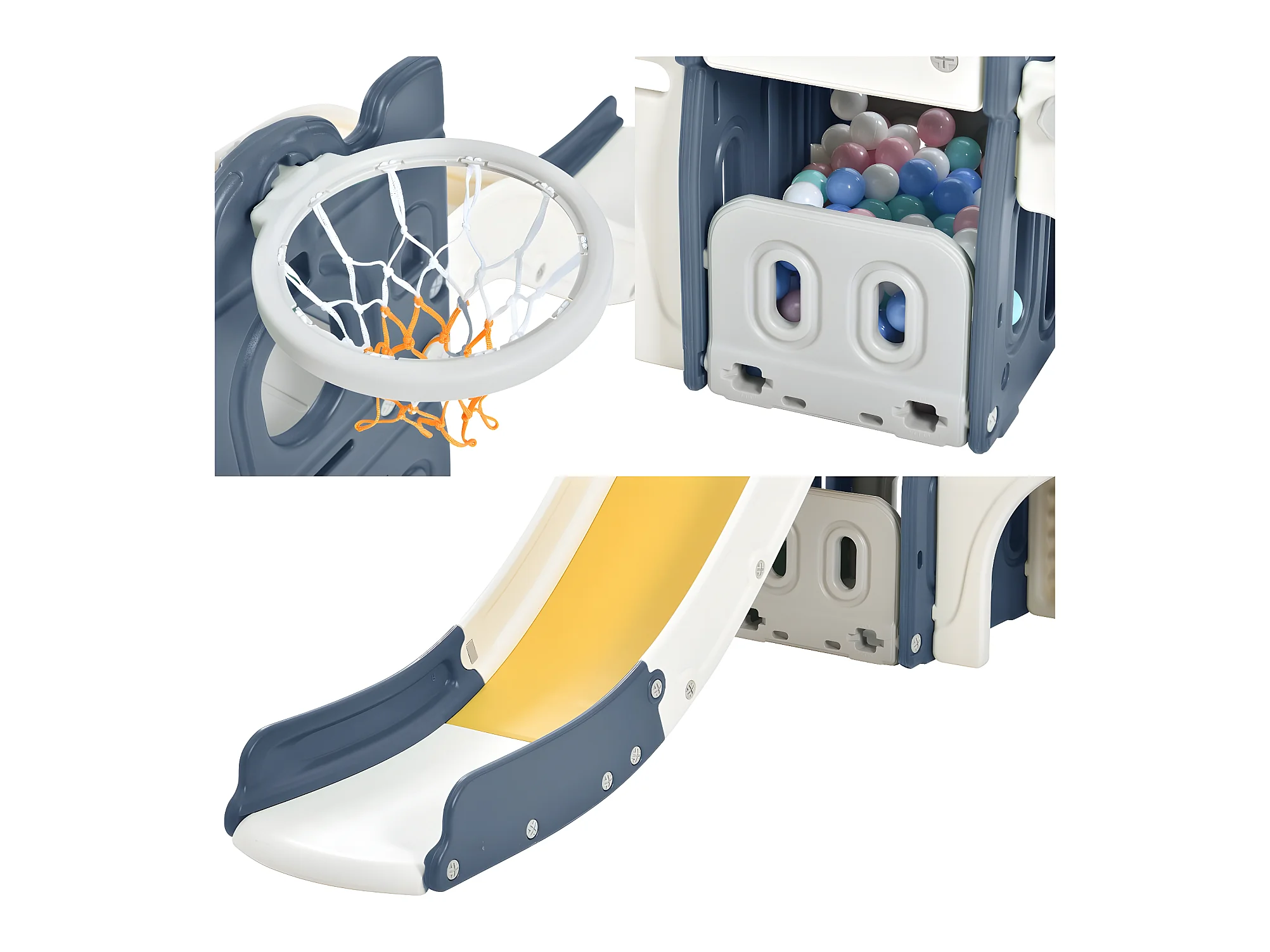 Burgförmige Rutsche mit Kletter-, Tunnel-, Stauraum- und Basketballkorb – blau