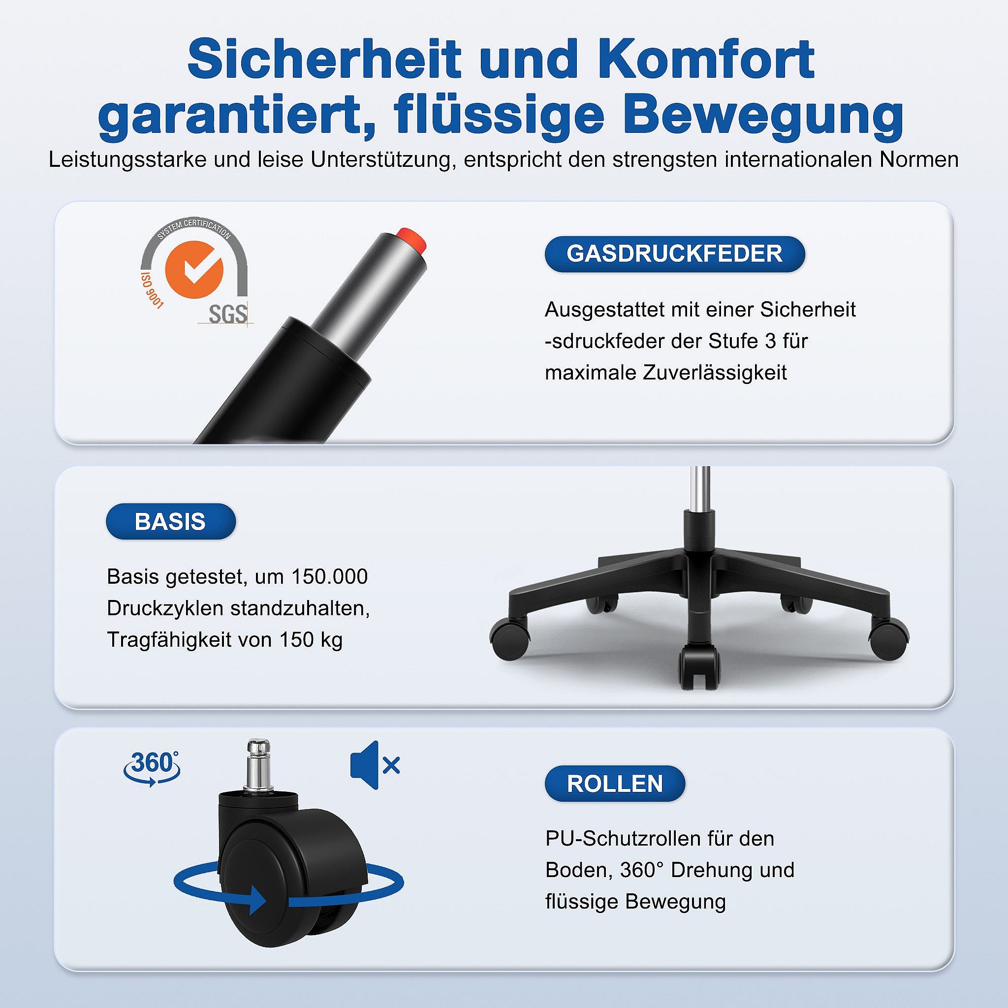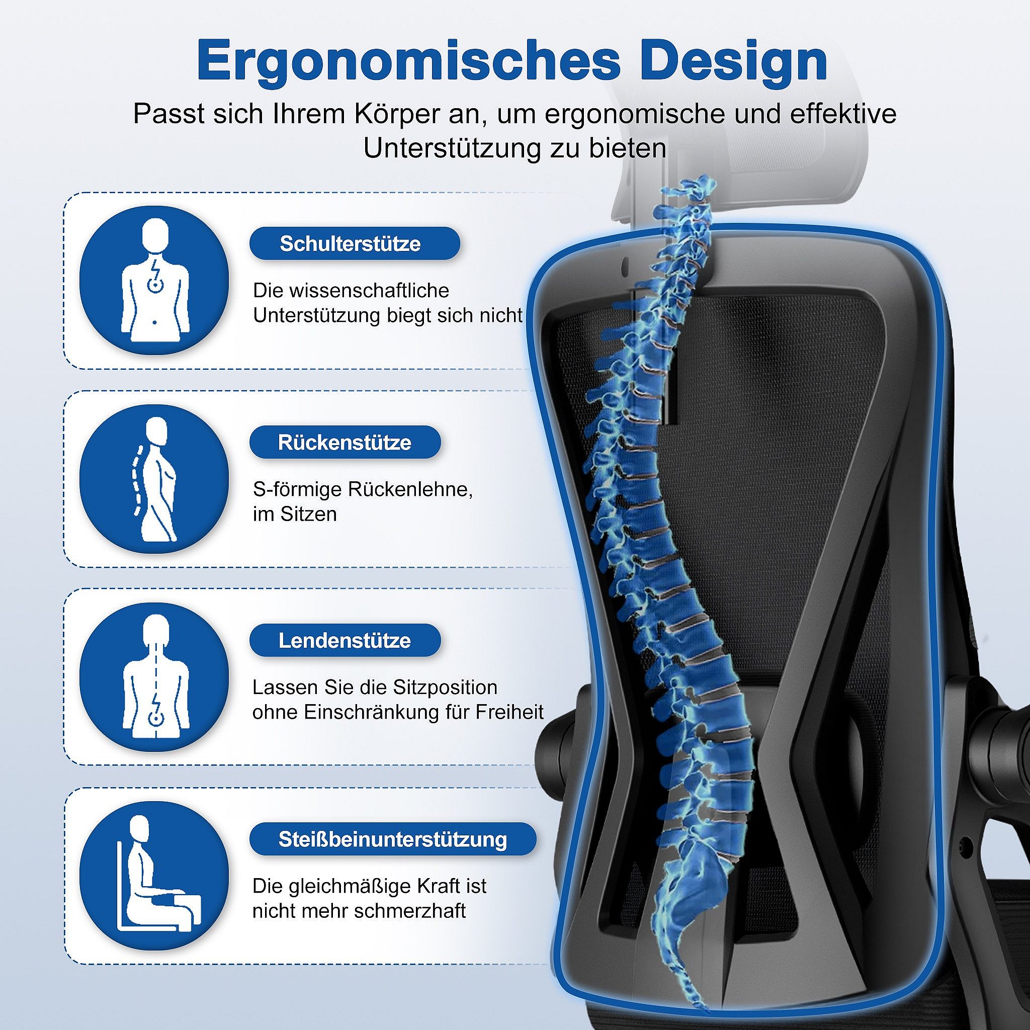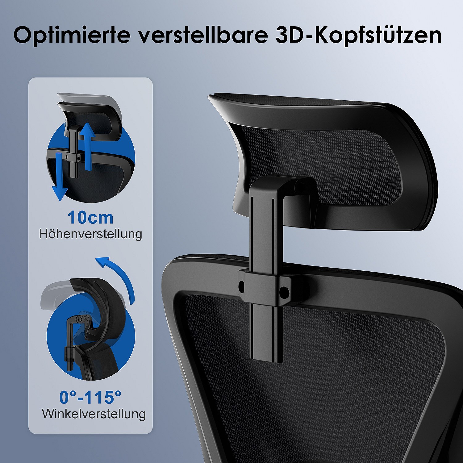 Bürostuhl - Drehbarer ergonomischer Bürostuhl - Mit verstellbarer Kopfstütze und Rückenlehne - Atmungsaktiver Bürostuhl - 150kg - Netz-Wippfunktion - Managerstuhl