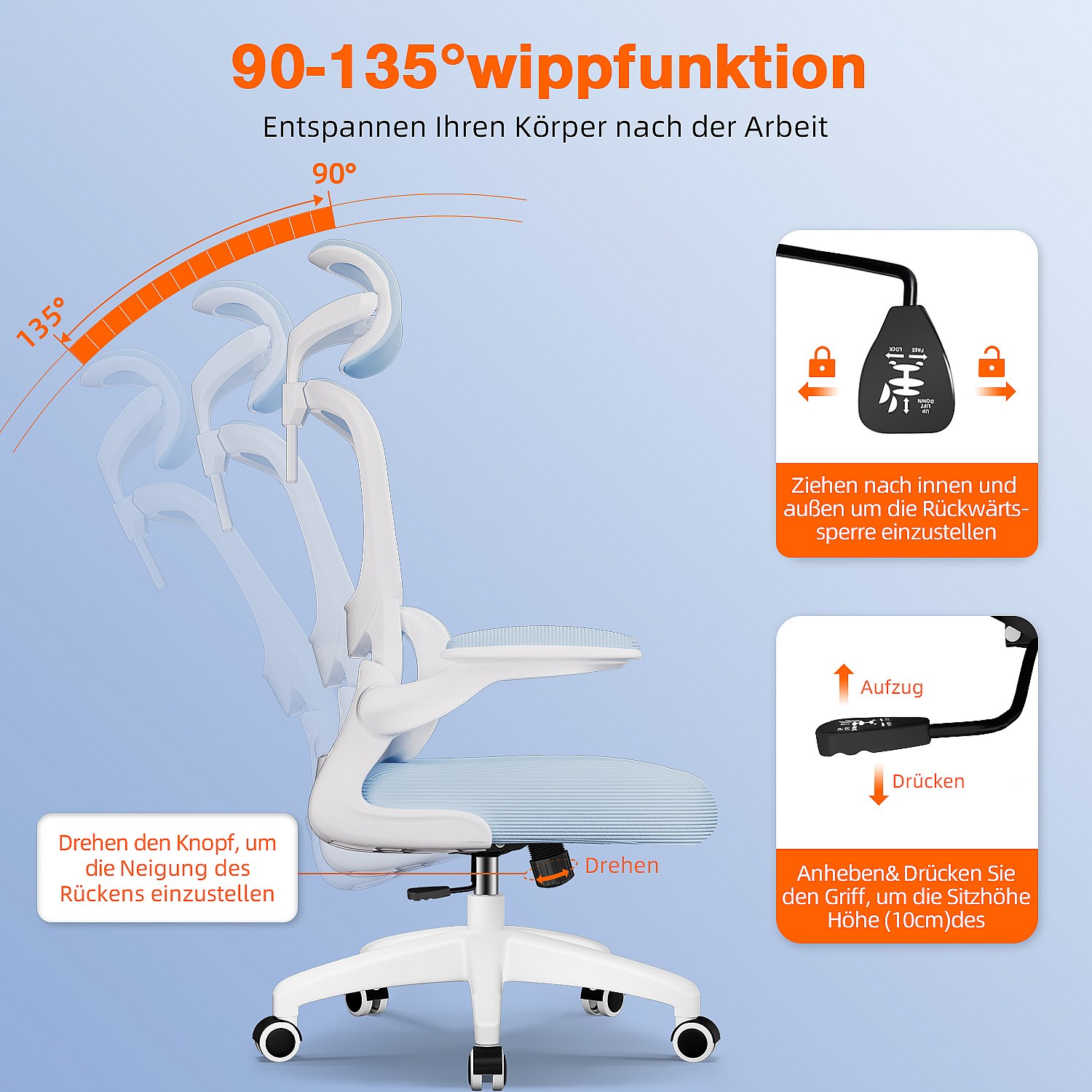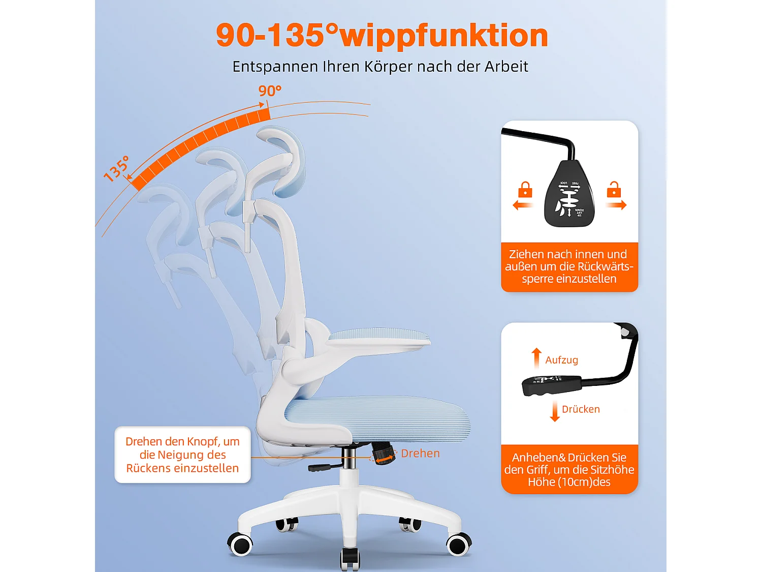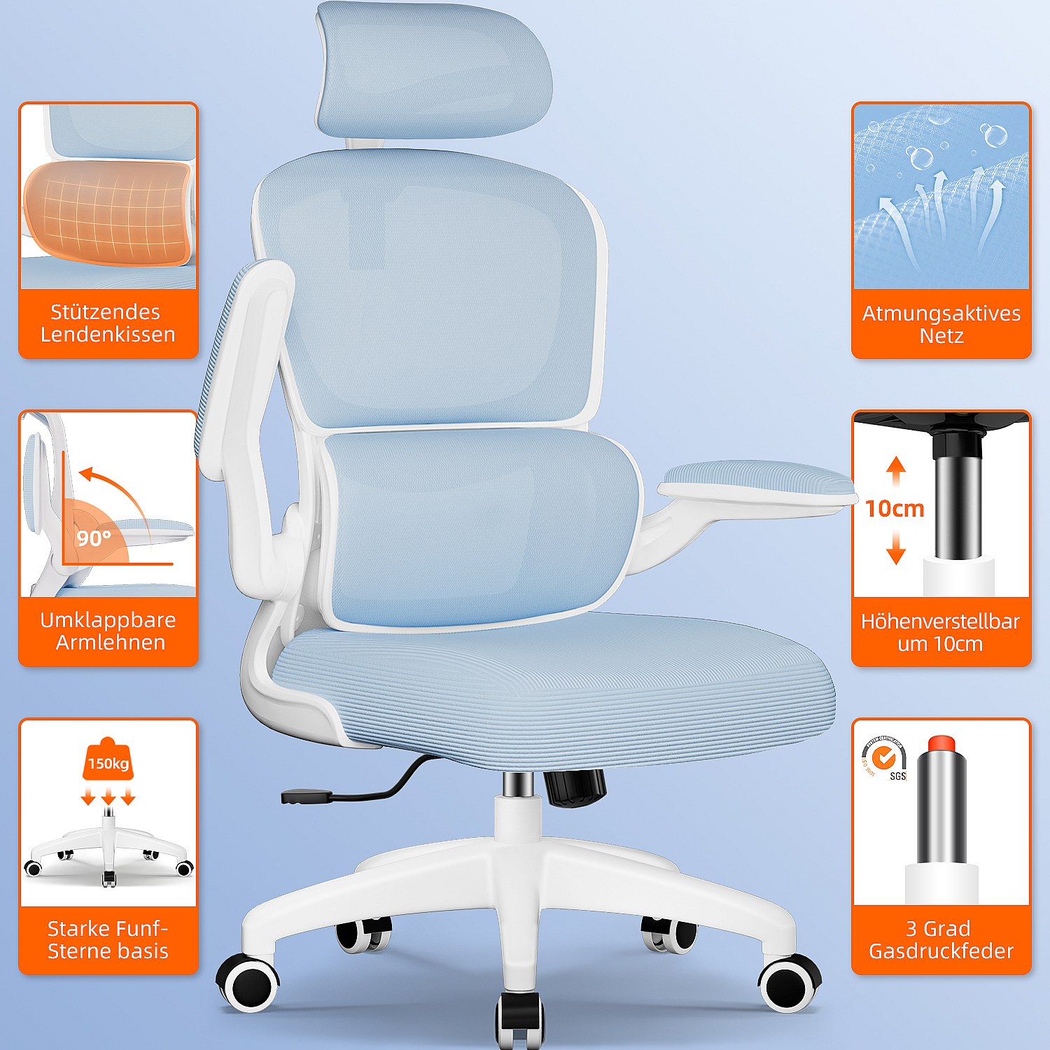 Bürostuhl - Ergonomisch Bürostuhl - Verstellbarer Kopfstütze - Klappbare Armlehnen - Lendenwirbelstütze - Höhenverstellbarer - maximaler Neigung von 135° - 150 kg