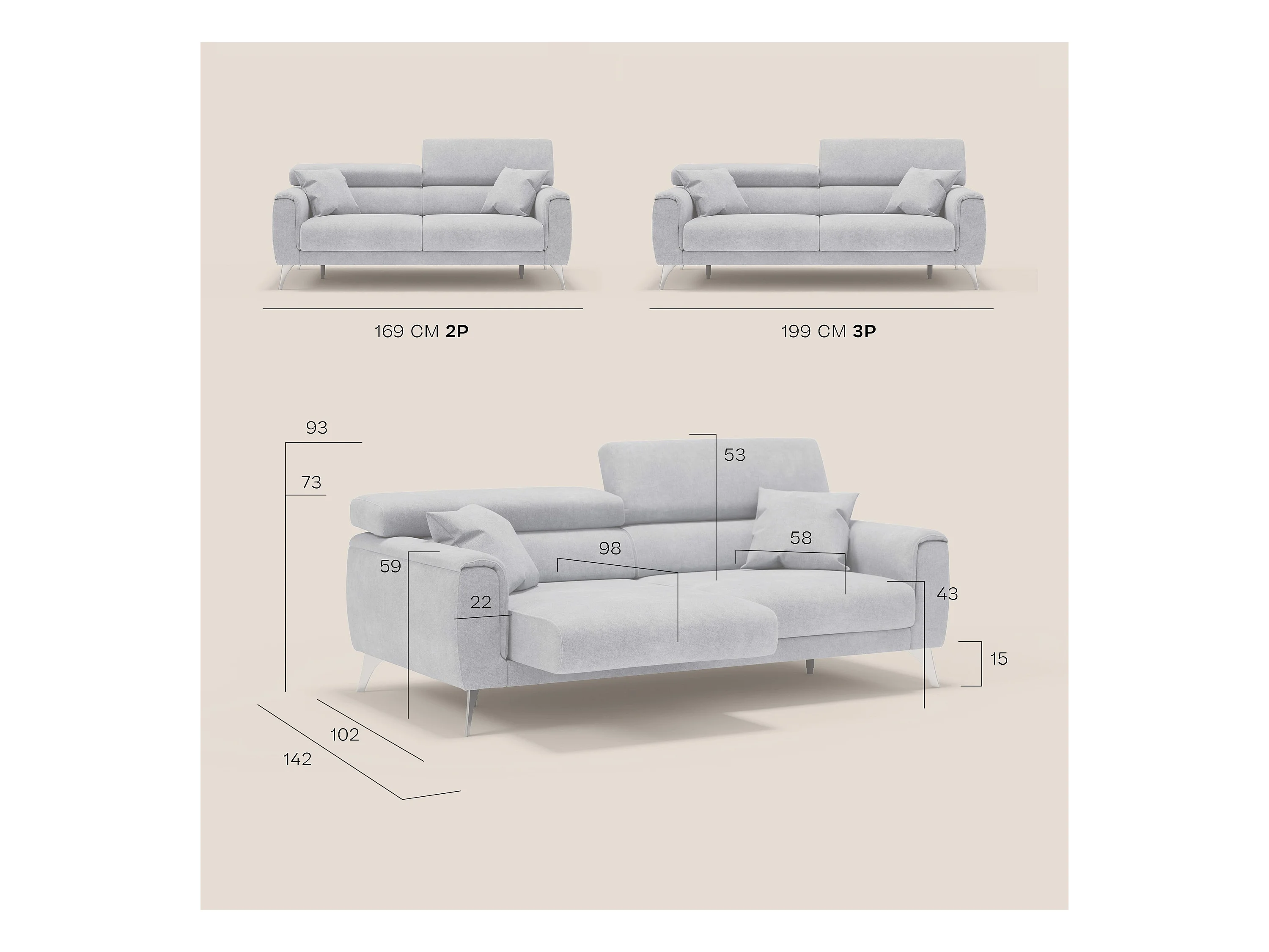Caravaggio Sofa mit verschiebbaren Sitzen aus wasserfestem, weichem Stoff T02 199 cm Creme