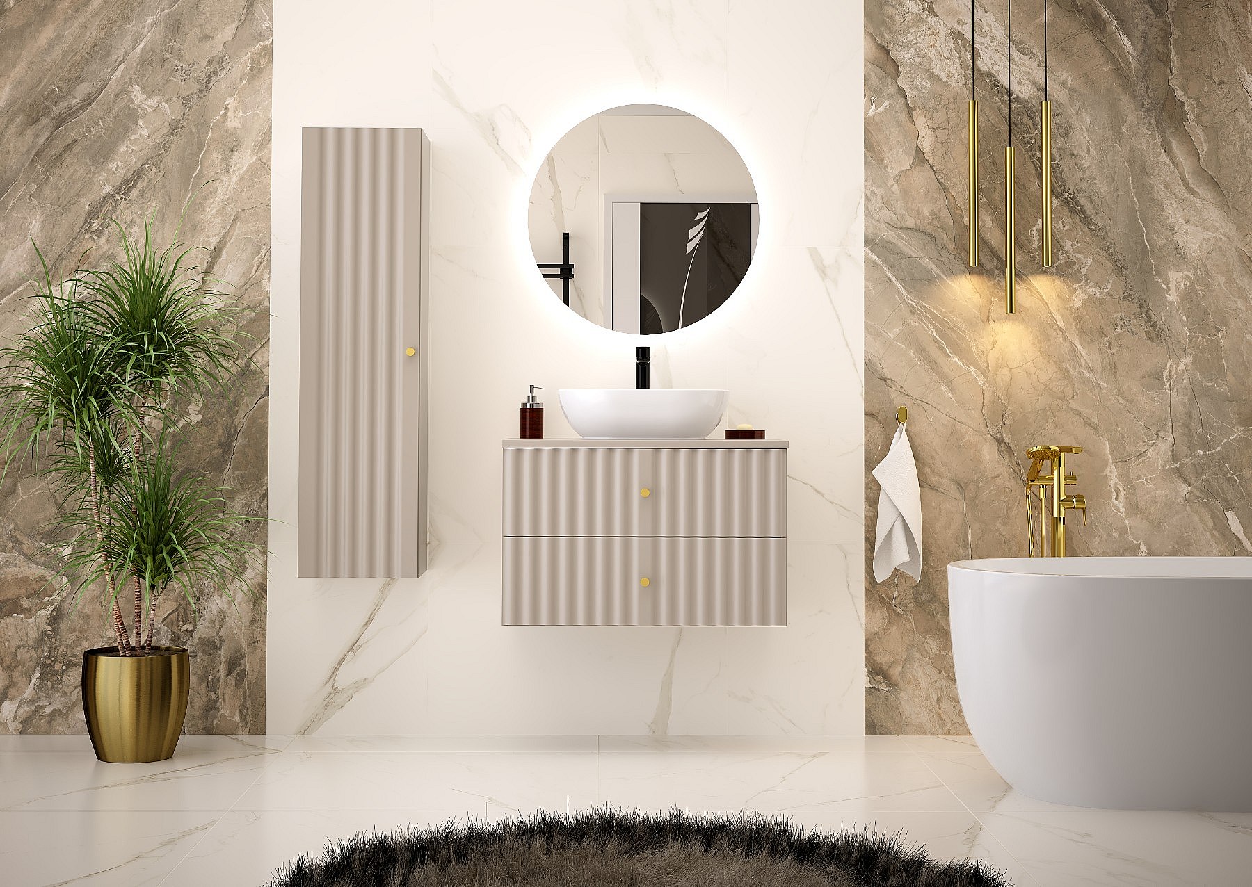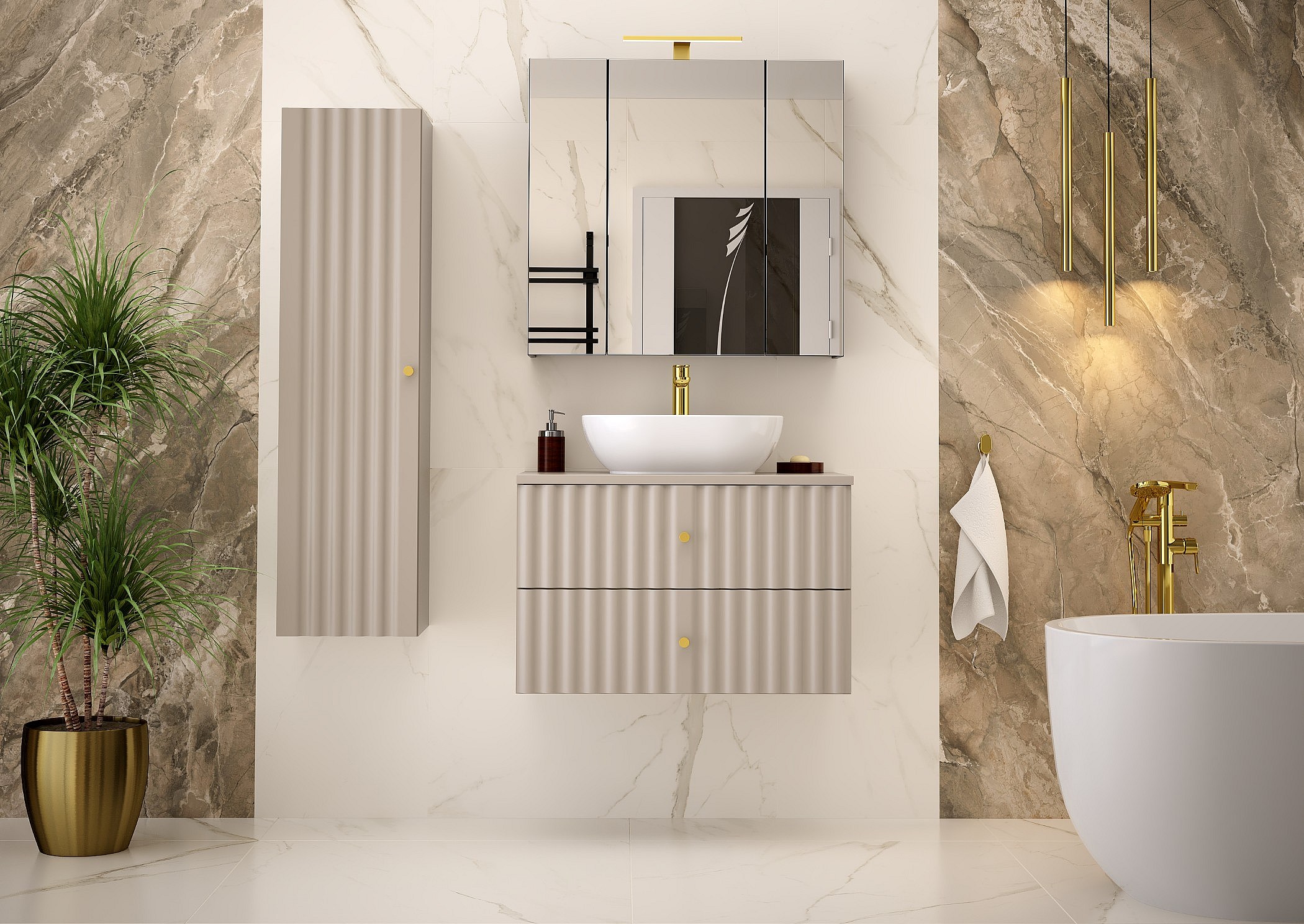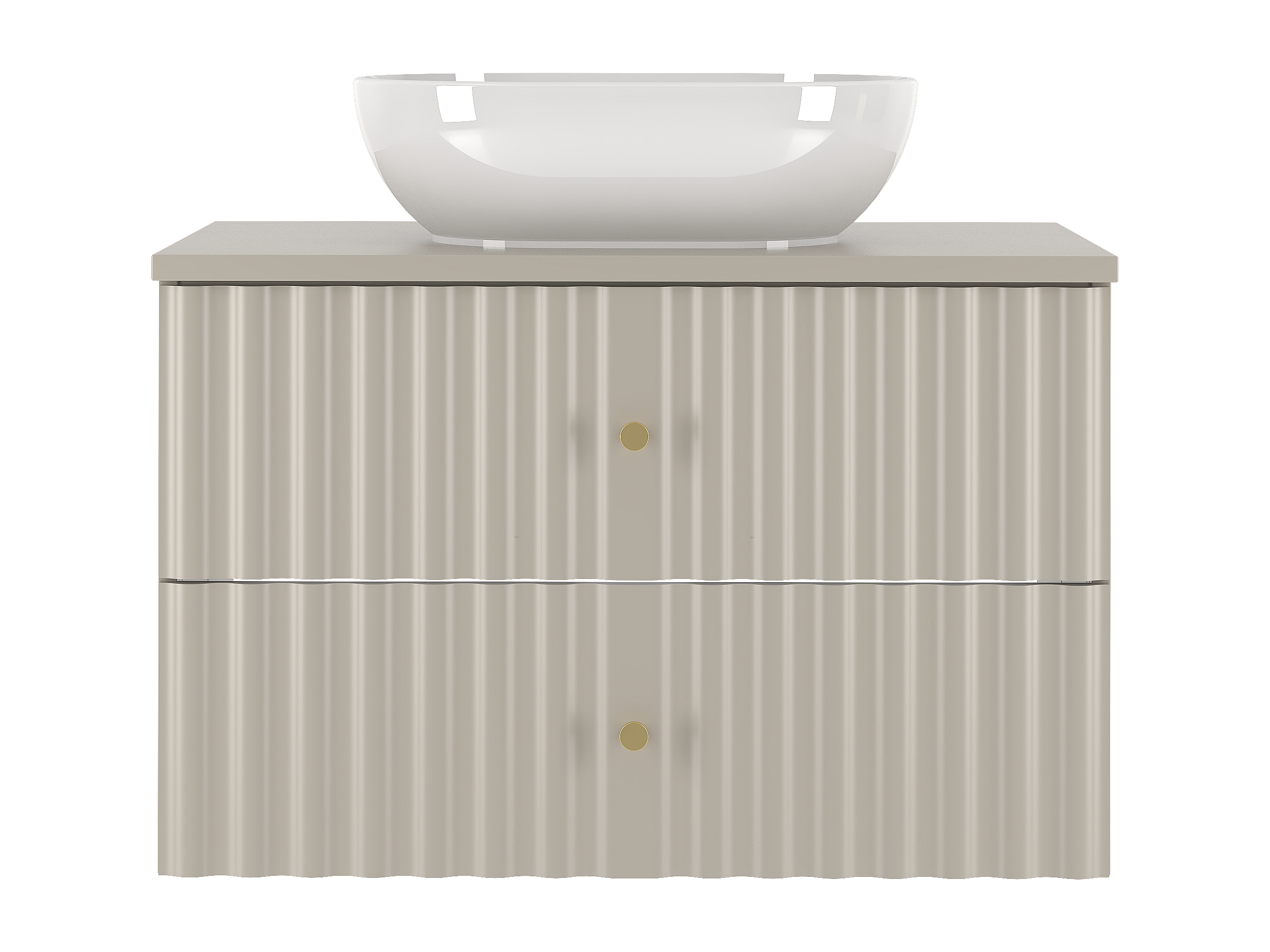 Cashmere Badezimmer Set 80cm Schrank mit Arbeitsplatte und Waschbecken geriffelte Fronten Aqua