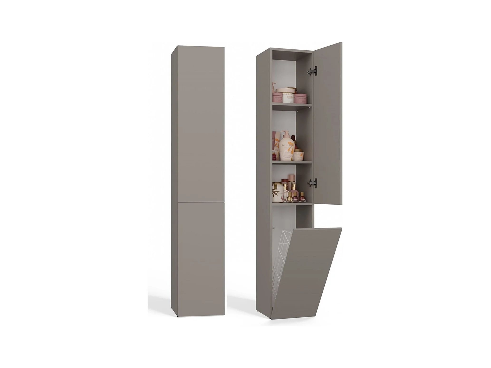 CDF Bad-Hochschrank NEL lV | Farbe: Gruau | Modernes Badregal | Stauraumschrank | Geräumige Einlegeböden | Türen | Einfache Montage | Stilvolle Griffe | Wäschekorb