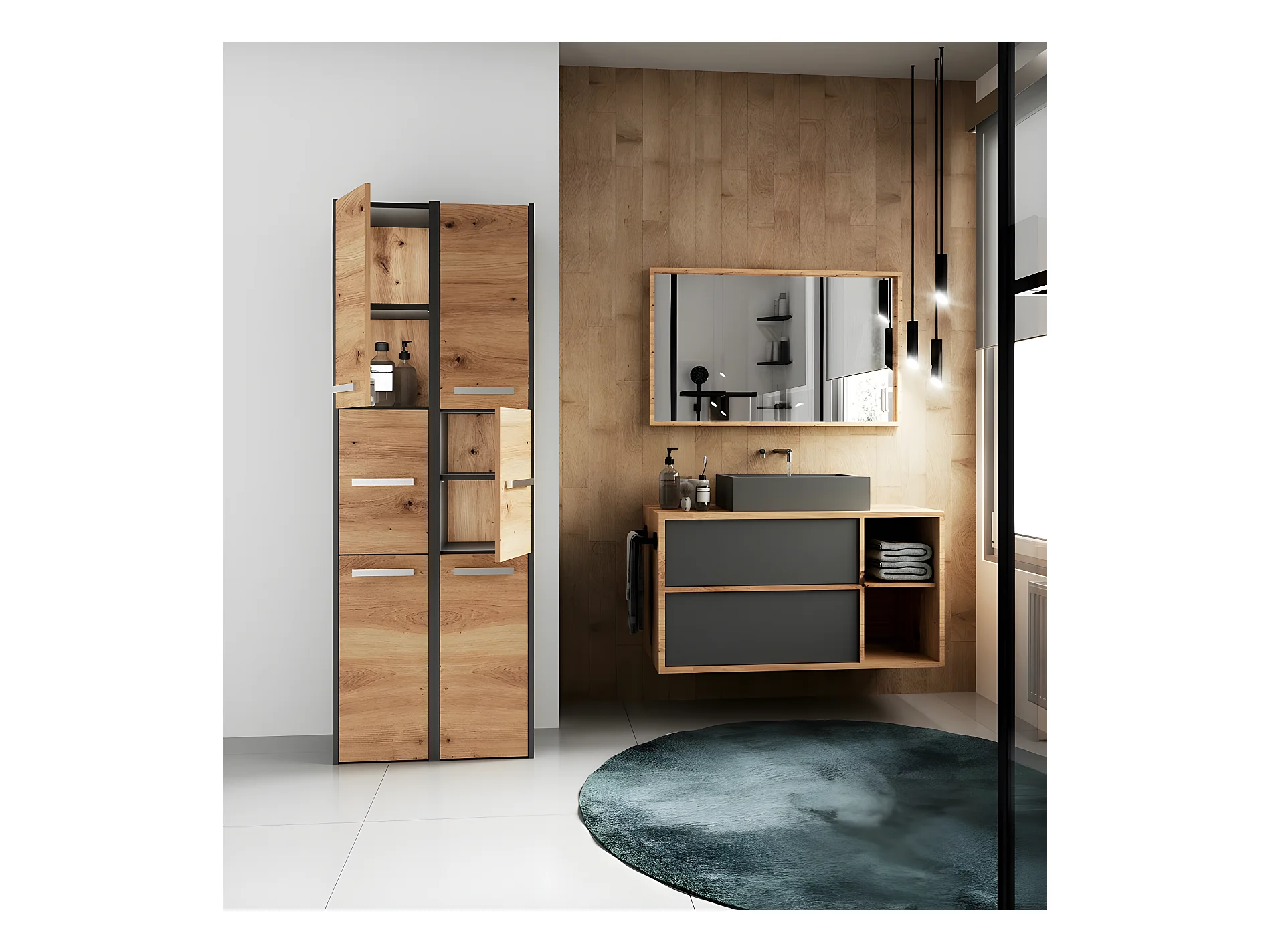 CDF Badschrank S33 | Farbe: Anthrazit - Eiche Artisan | Moderner Badezimmerschrank | Ablagefläche | Geräumige Einlegeböden | Türen | Einfache Montage