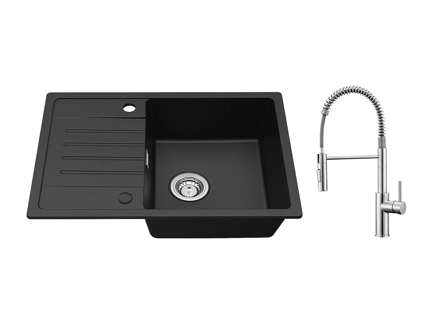 Cecipa max Einzelspüle mit Abtropffläche, Einbauspüle aus Quarz und Kunstharz, Schwarz, 65 x 45 cm + Küchenarmatur mit gebürsteter Feder und ausziehbarer Brause