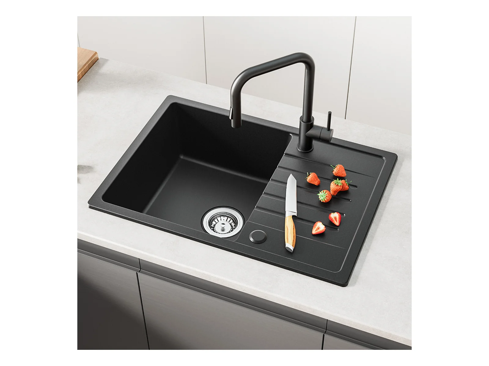 Cecipa max Einzelspüle mit Abtropffläche, Quarz- und Kunstharzspüle Schwarz 65x45cm + Mischbatterie mit ausziehbarer Brause, 3 Wasserauslassmodi, Gebürstet