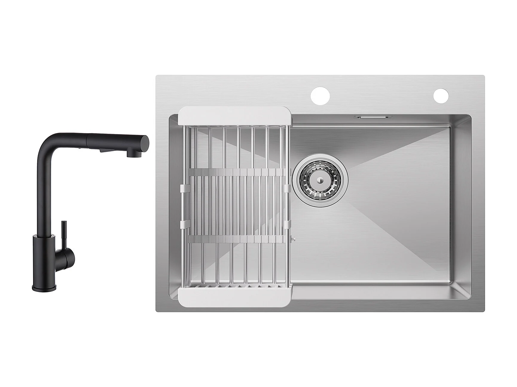 Cecipa max Einzelspüle, 60 x 45 cm, Spüle aus gebürstetem Edelstahl mit Ablaufkorb + schwarzer Küchenmischhahn mit ausziehbarer Brause, 2 Sprühmodi