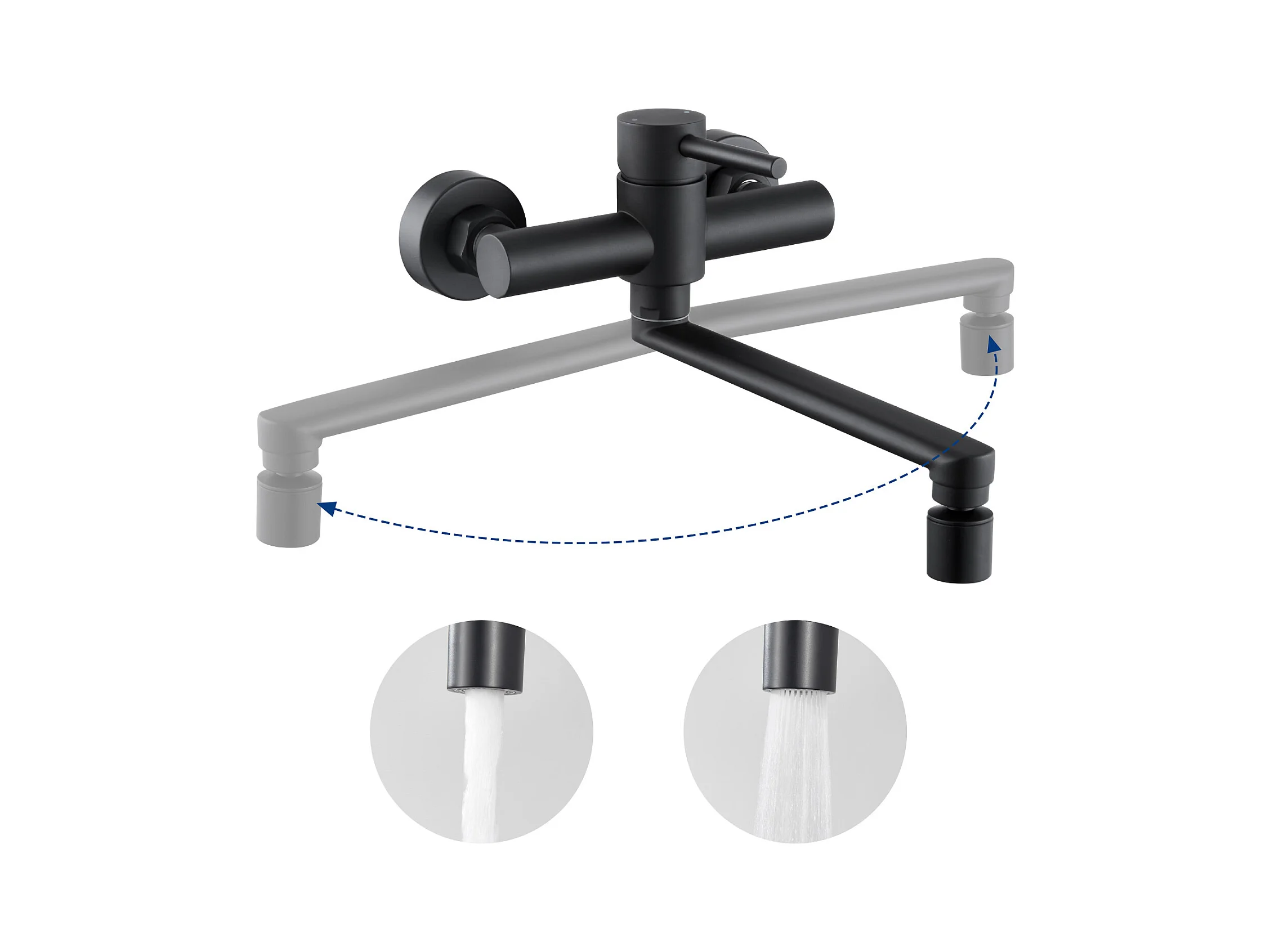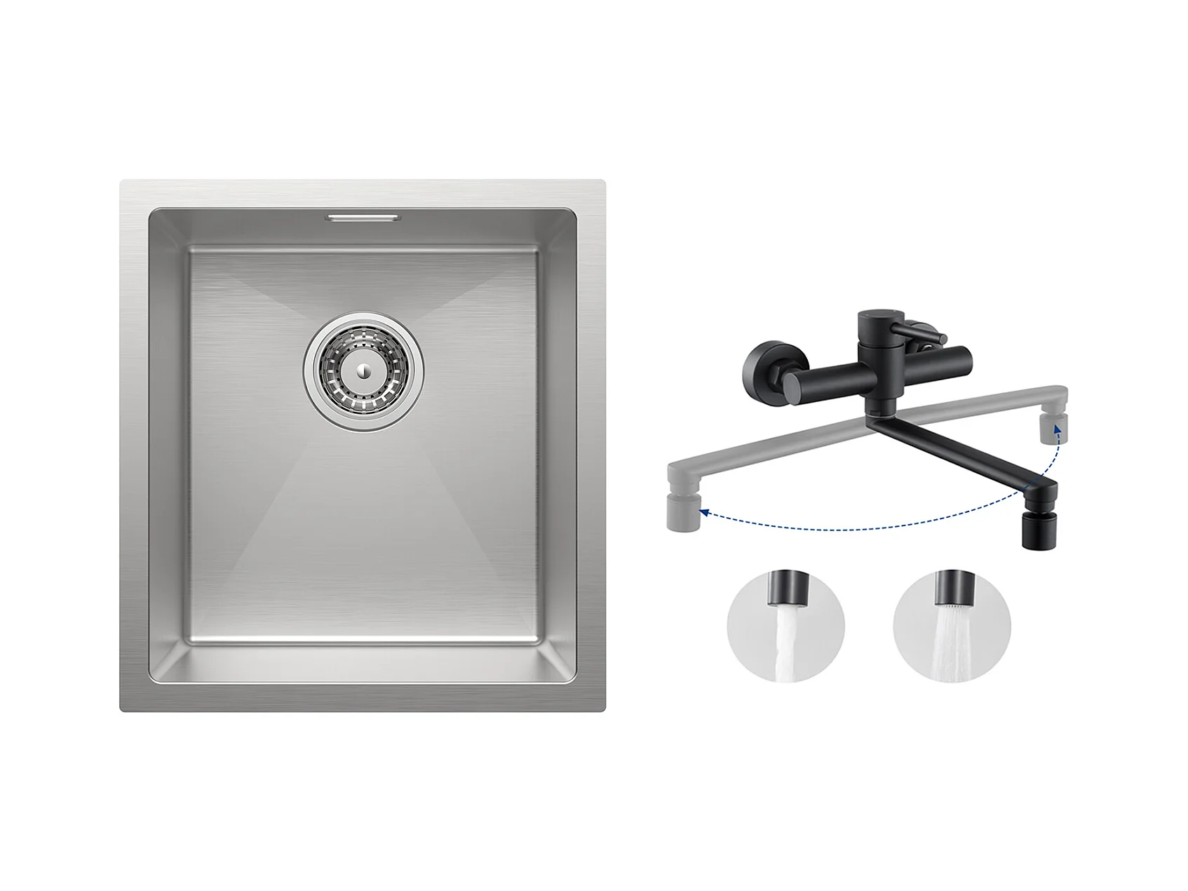 Cecipa MAX Einzelbecken-Küchenspüle 40x44x19 cm, Spüle aus gebürstetem Edelstahl + wandmontierte Küchenmischbatterie mit 2 schwarzen Düsen