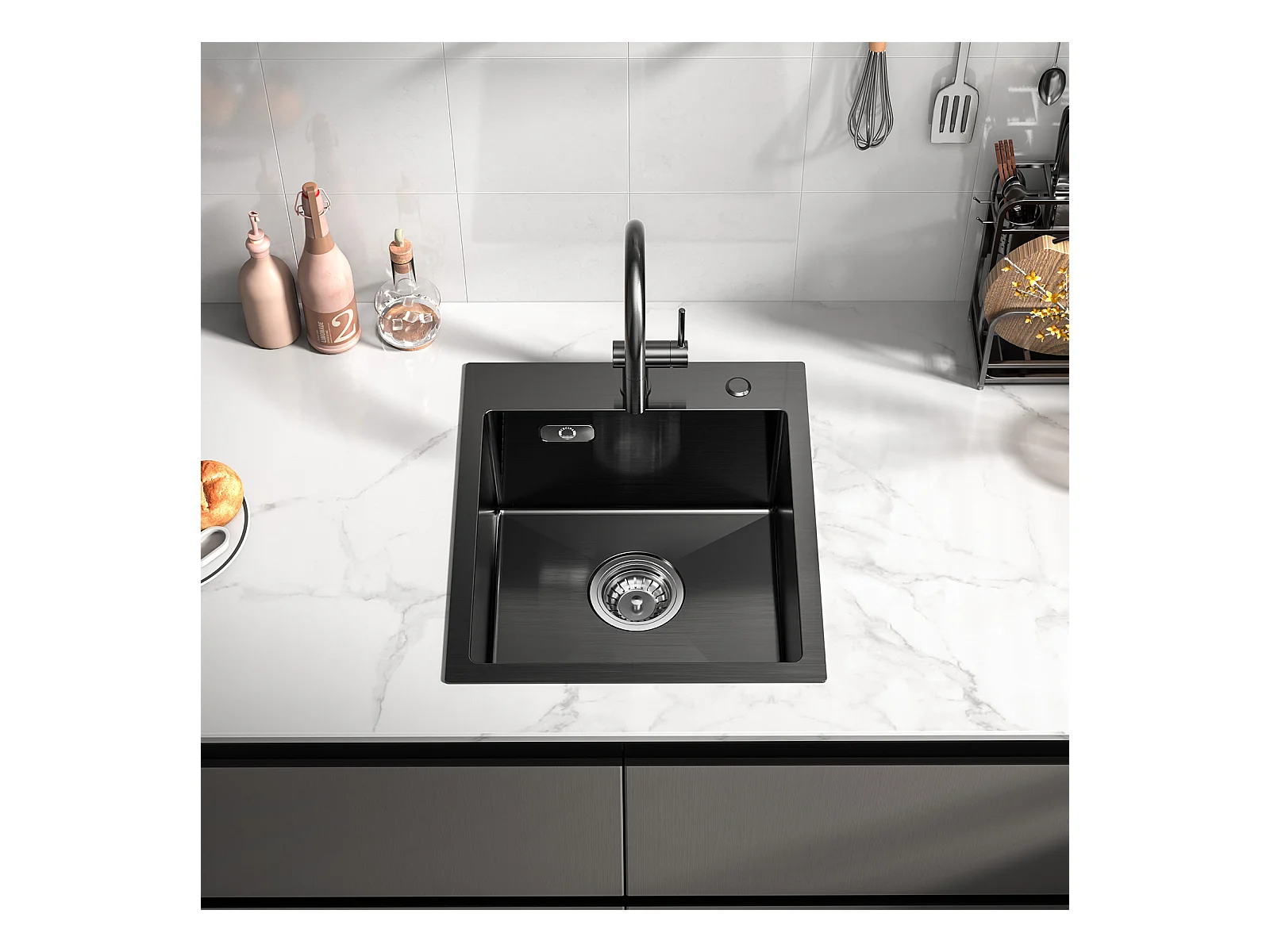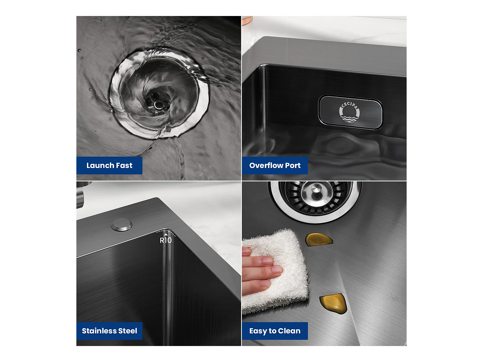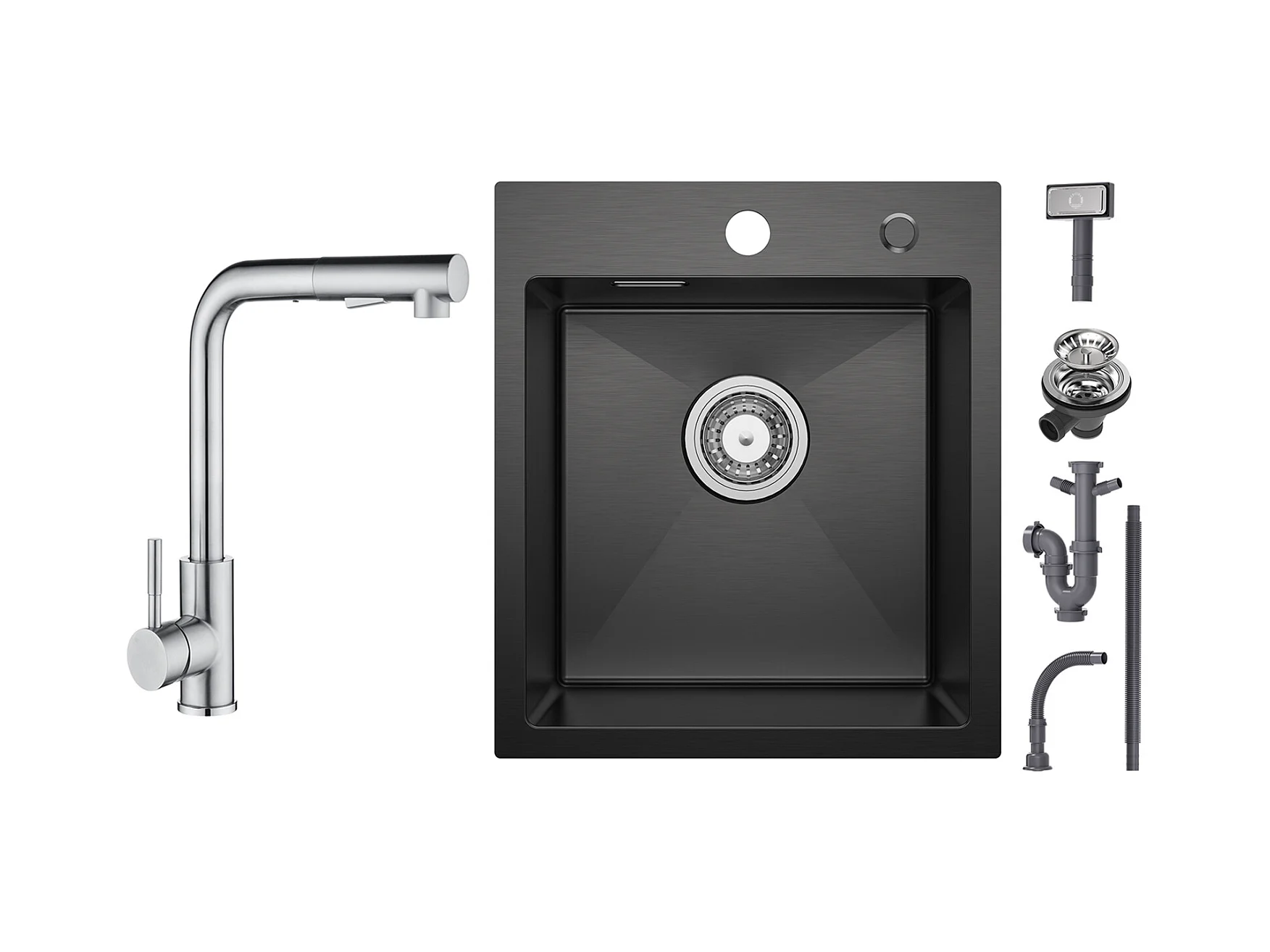 Cecipa max 1 Becken schwarze Küchenspüle 40*45*19CM - 1 Becken Edelstahlspüle + gebürstete Küchenmischbatterie mit ausziehbarer Brause - 2 Düsen zur Auswahl