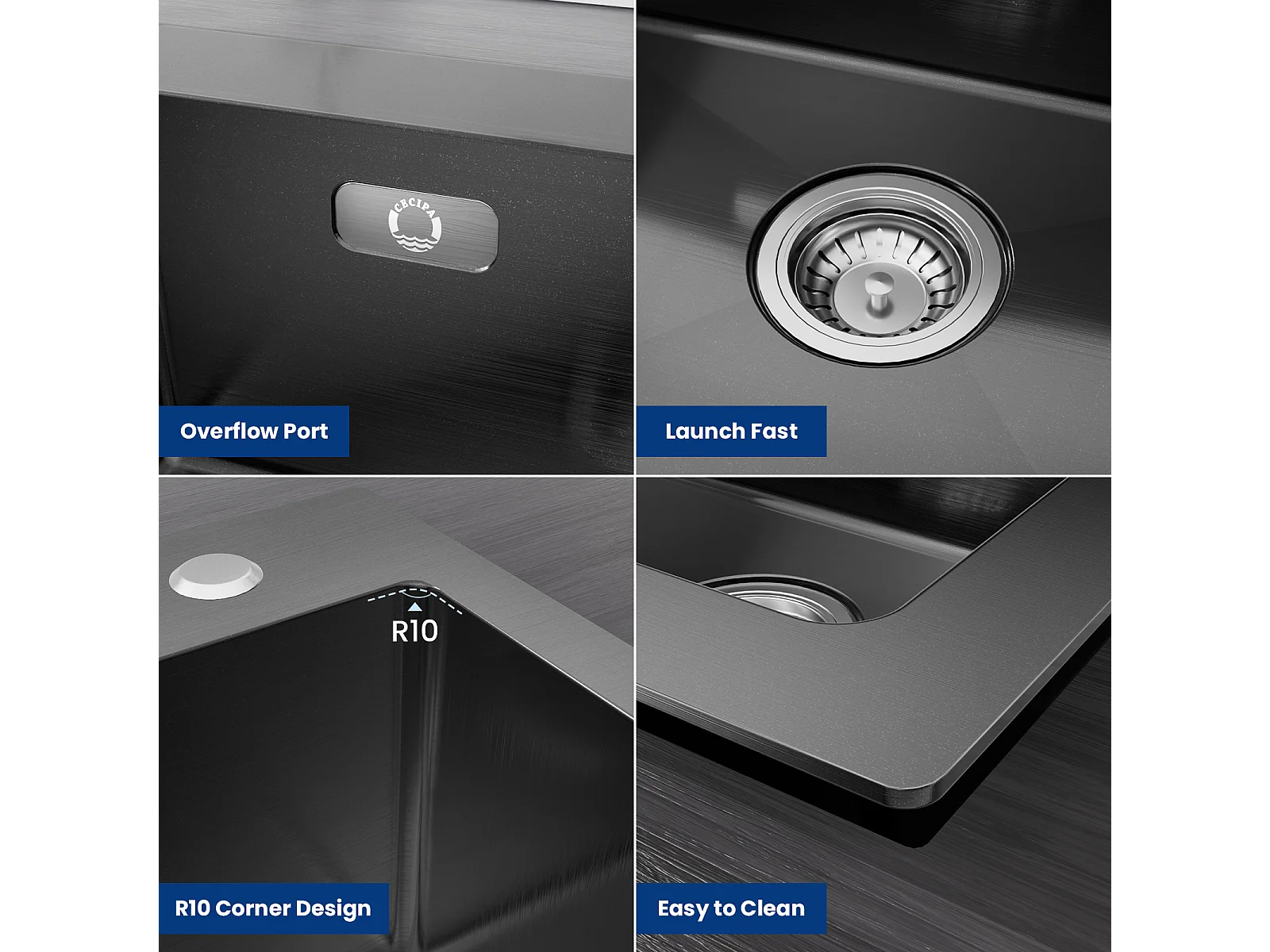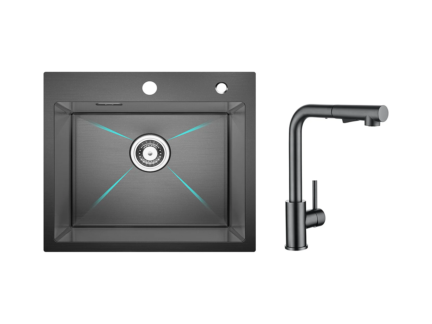 Cecipa MAX Einzelbecken-Küchenspüle 50×45×18,5 cm, schwarze Edelstahlspüle + Küchenmischbatterie mit ausziehbarer Brause