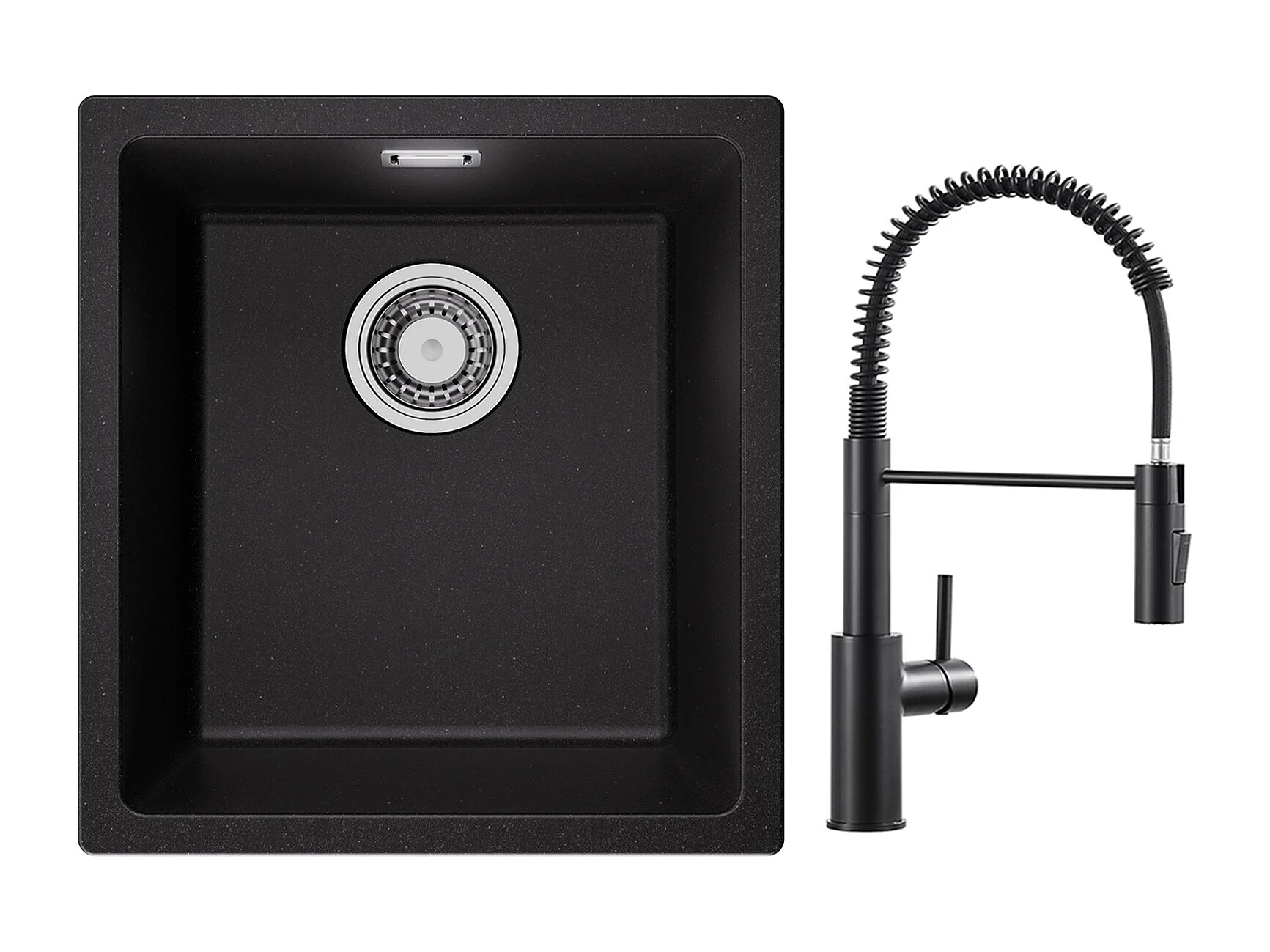 CECIPA MAX Einzelbecken aus Quarz- und Kunstharzspüle, Schwarzgrau, 40 x 44 x 20 cm + Küchenmischbatterie mit ausziehbarer Brause, Black Spring