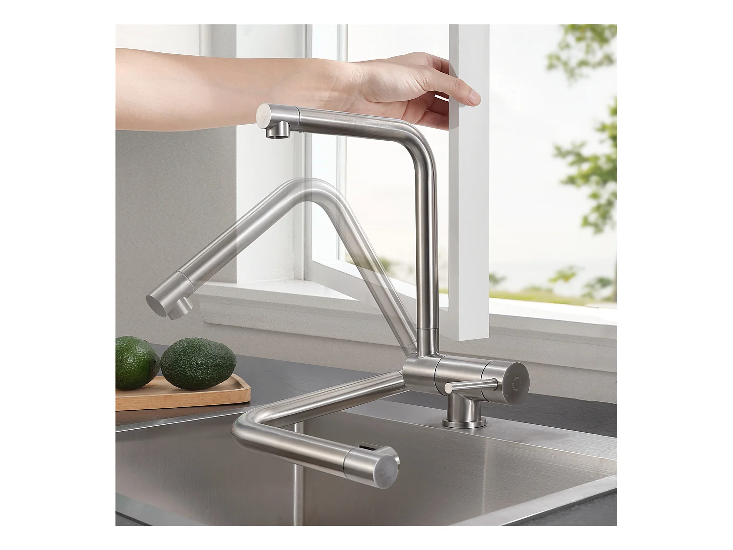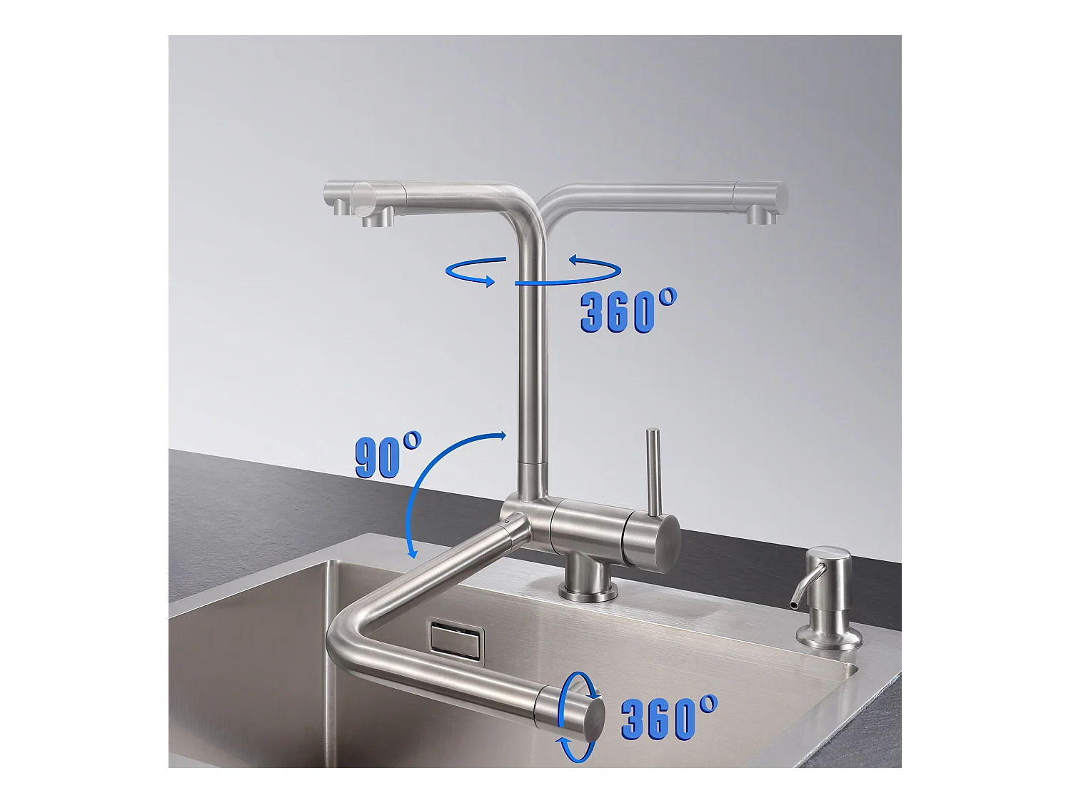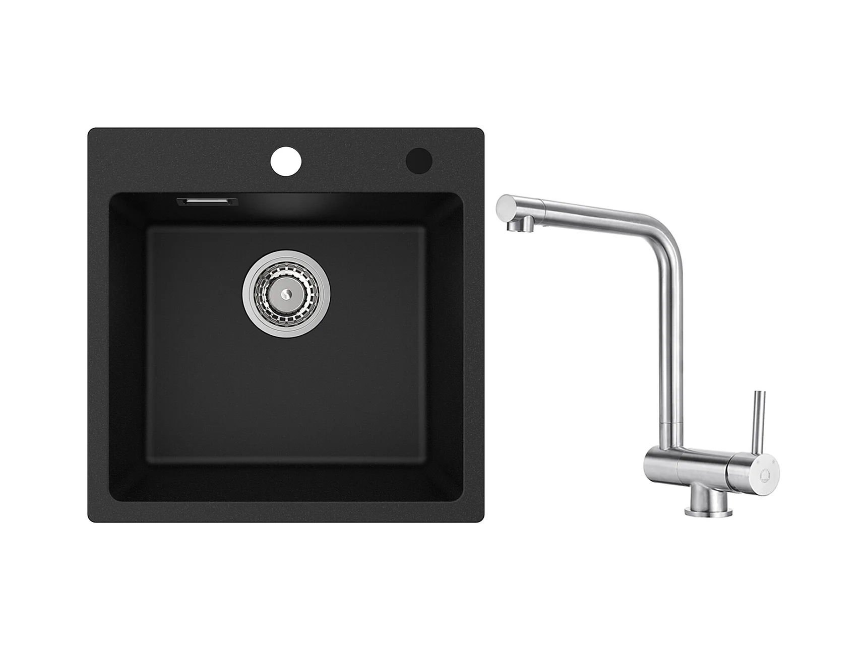 Cecipa MAX Einzelbecken aus Quarz und Kunstharz, Schwarz, 45 x 45 cm, Einbauspüle + gebürstete, klappbare Küchenmischbatterie