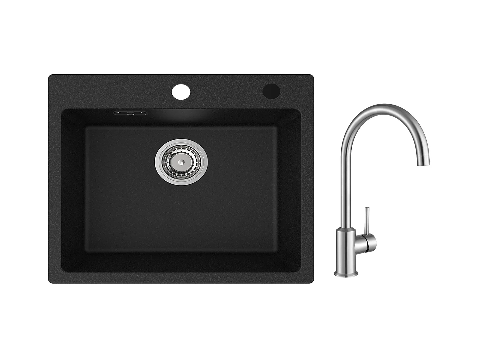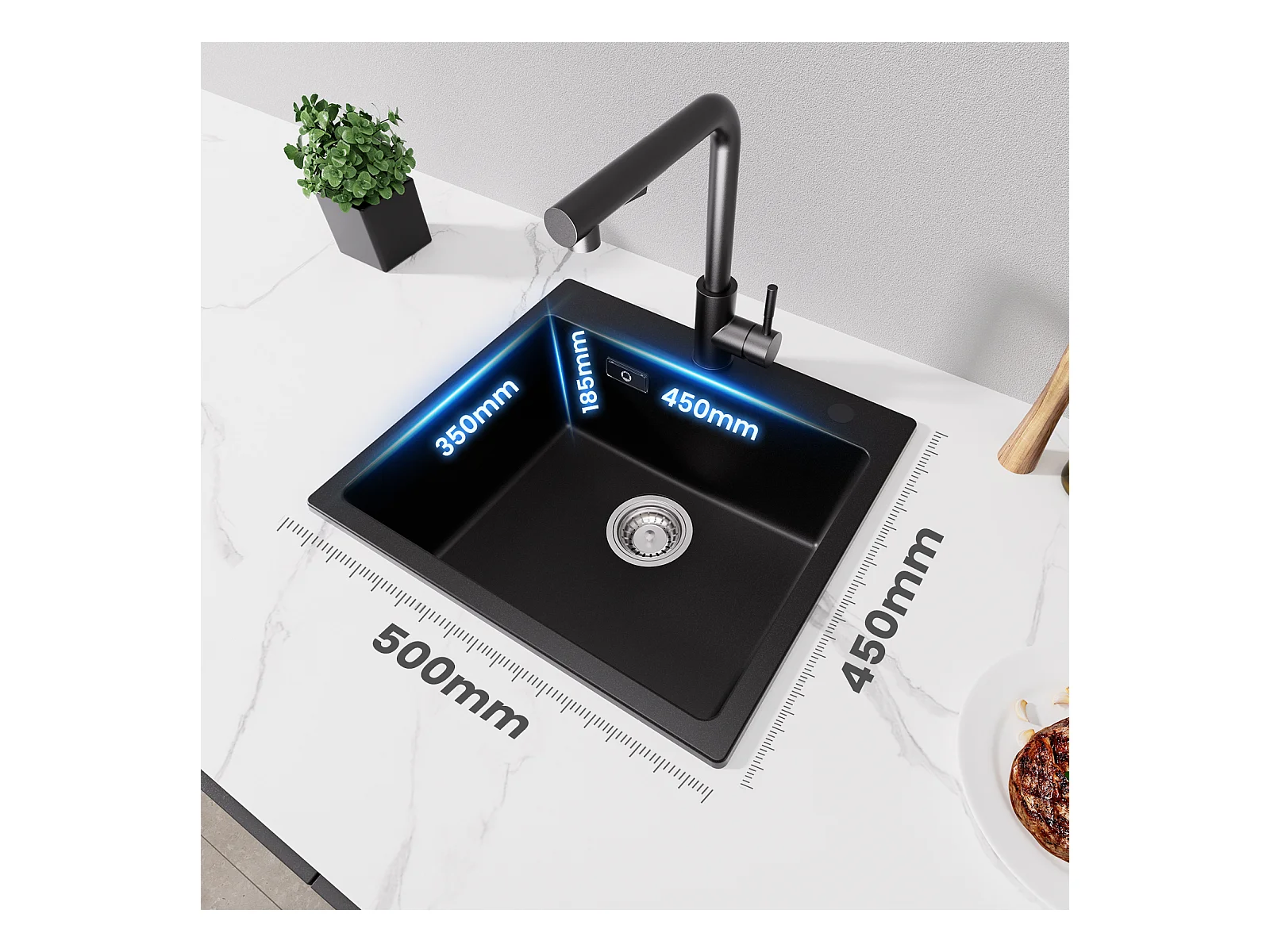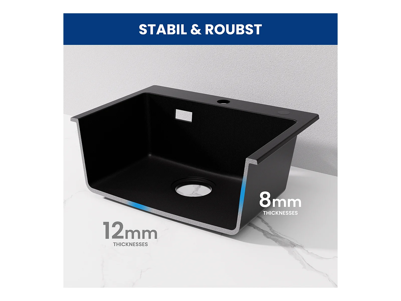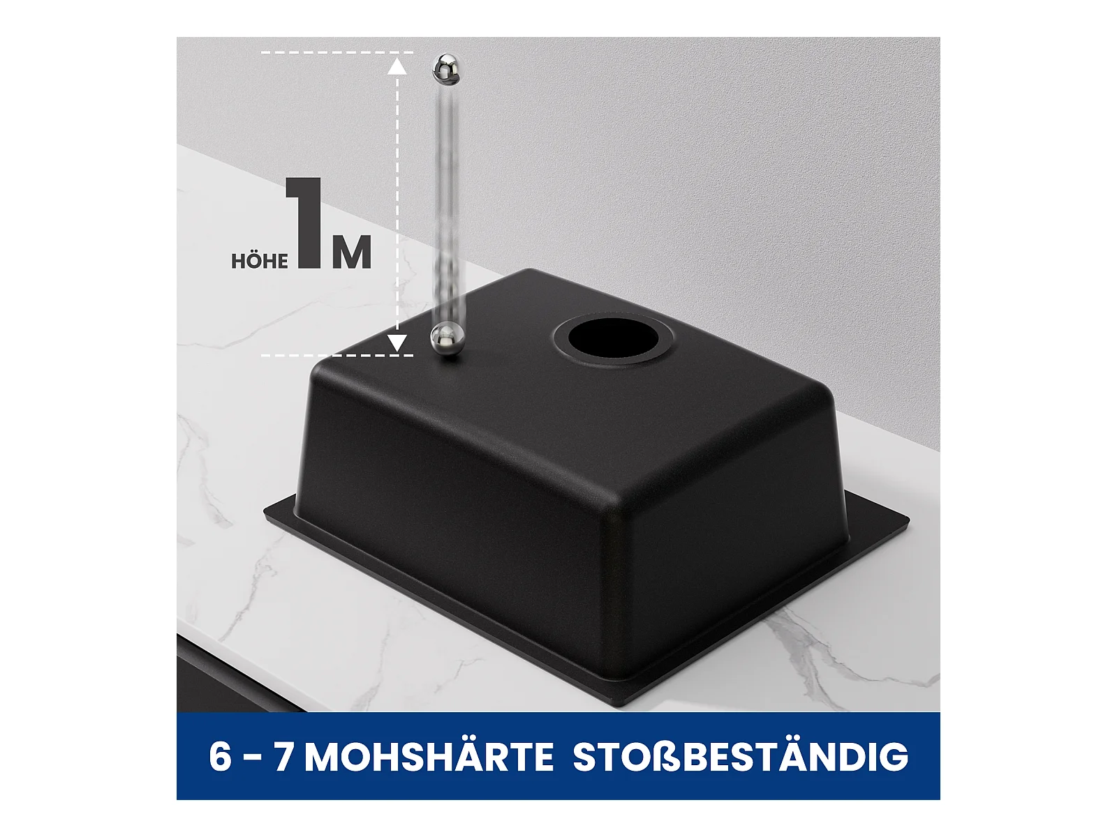 Cecipa MAX Einzelspüle 50x45cm Quarz- und Kunstharzspüle Einbauspüle + Küchenmischbatterie aus gebürstetem Edelstahl