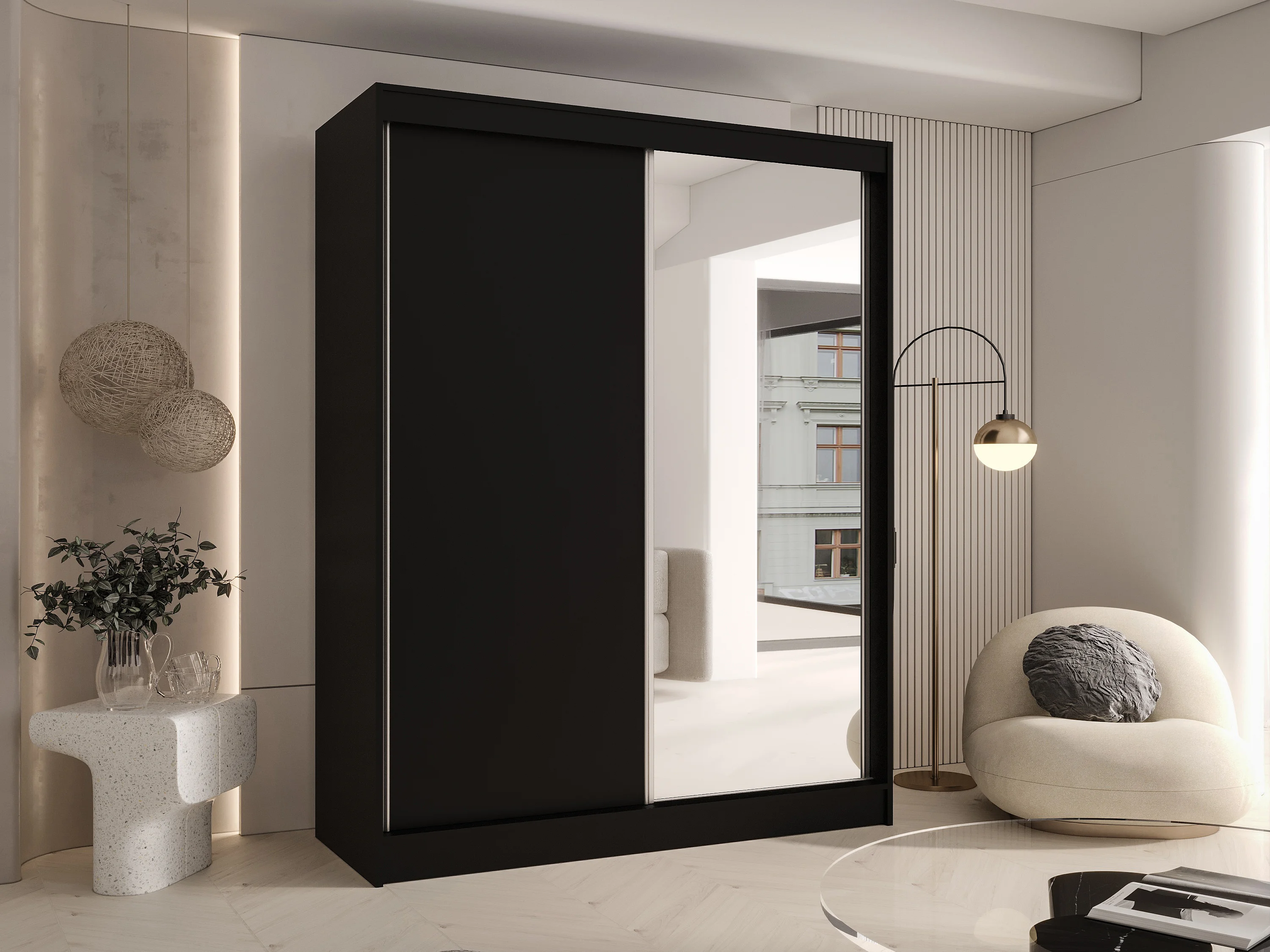 CHARLOTTE C1 Zweitüriger Schiebeschrank mit Spiegel, TOP PRODUKT 150cm Garderobe mit Kleiderstange/Regalböden, Verschieden Farben, Möbel vom Hersteller (Schwarz)