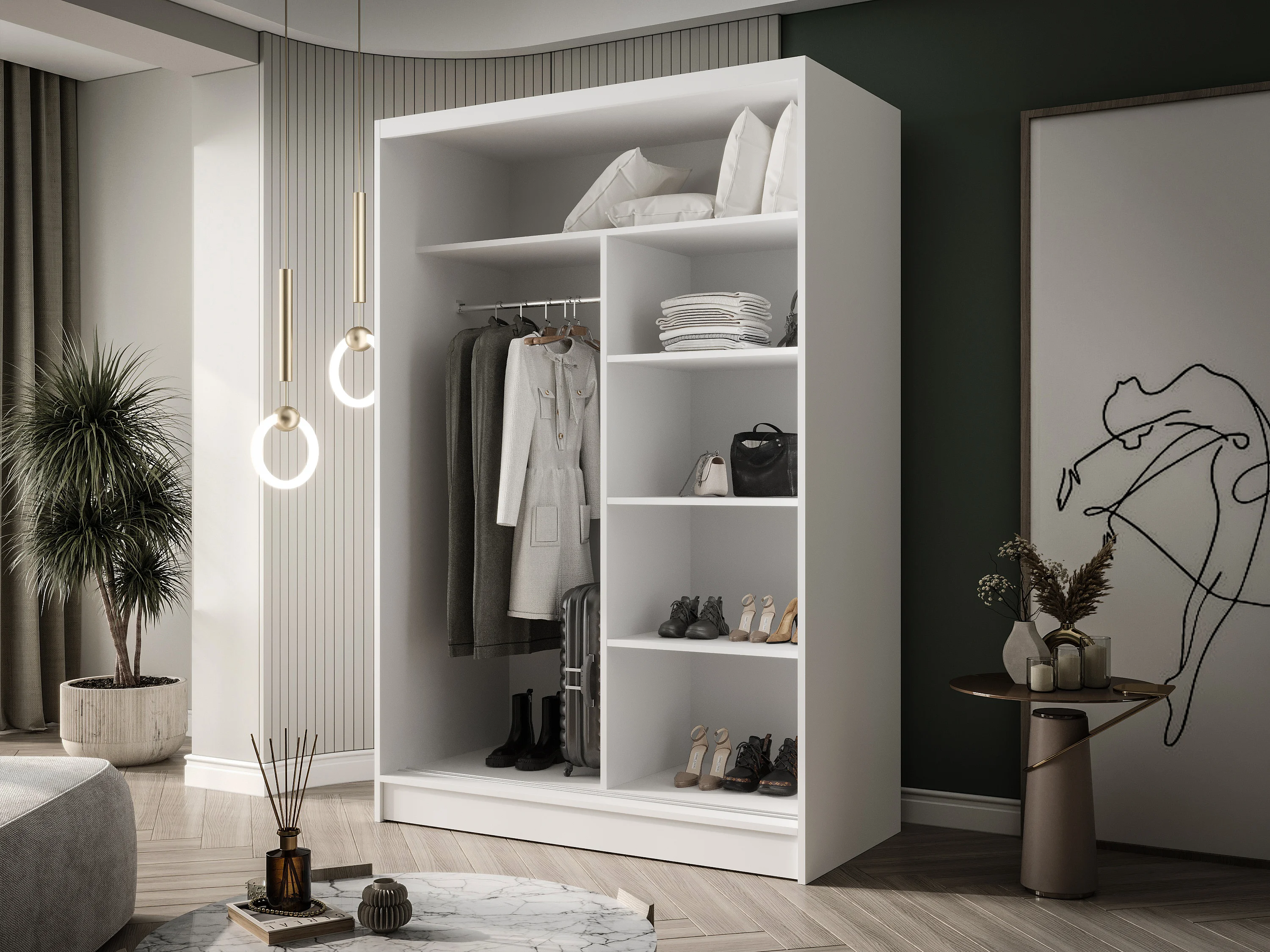 CHARLOTTE C4 Zweitüriger Schiebeschrank TOP PRODUKT 150cm Garderobe mit Kleiderstange/Regalböden, Verschieden Farben, Möbel vom Hersteller (Weiß/Sonoma)