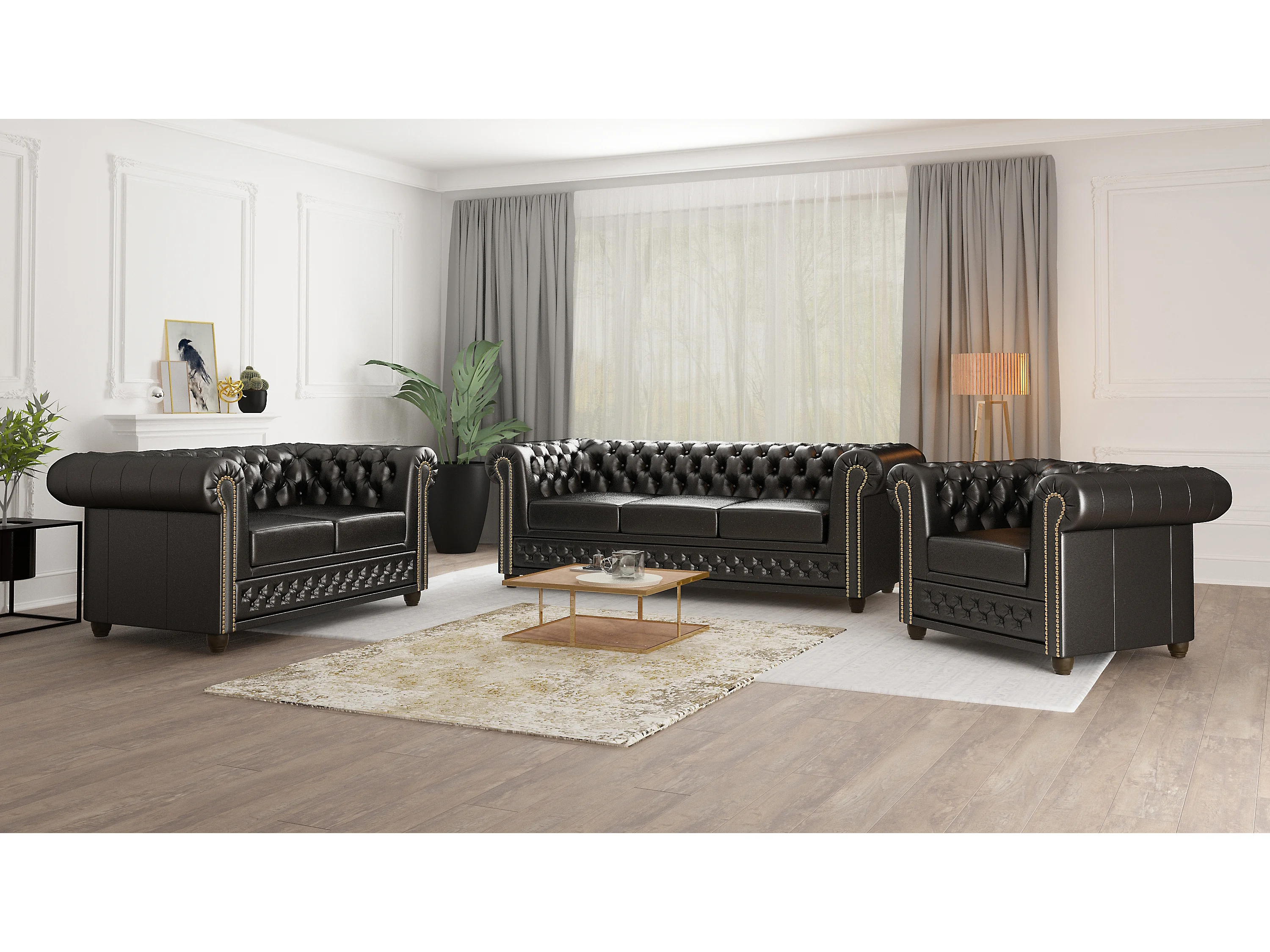 Chesterfield Polstergarnitur 3+2+1 aus veganem Leder mit Holzbeinen - Rex