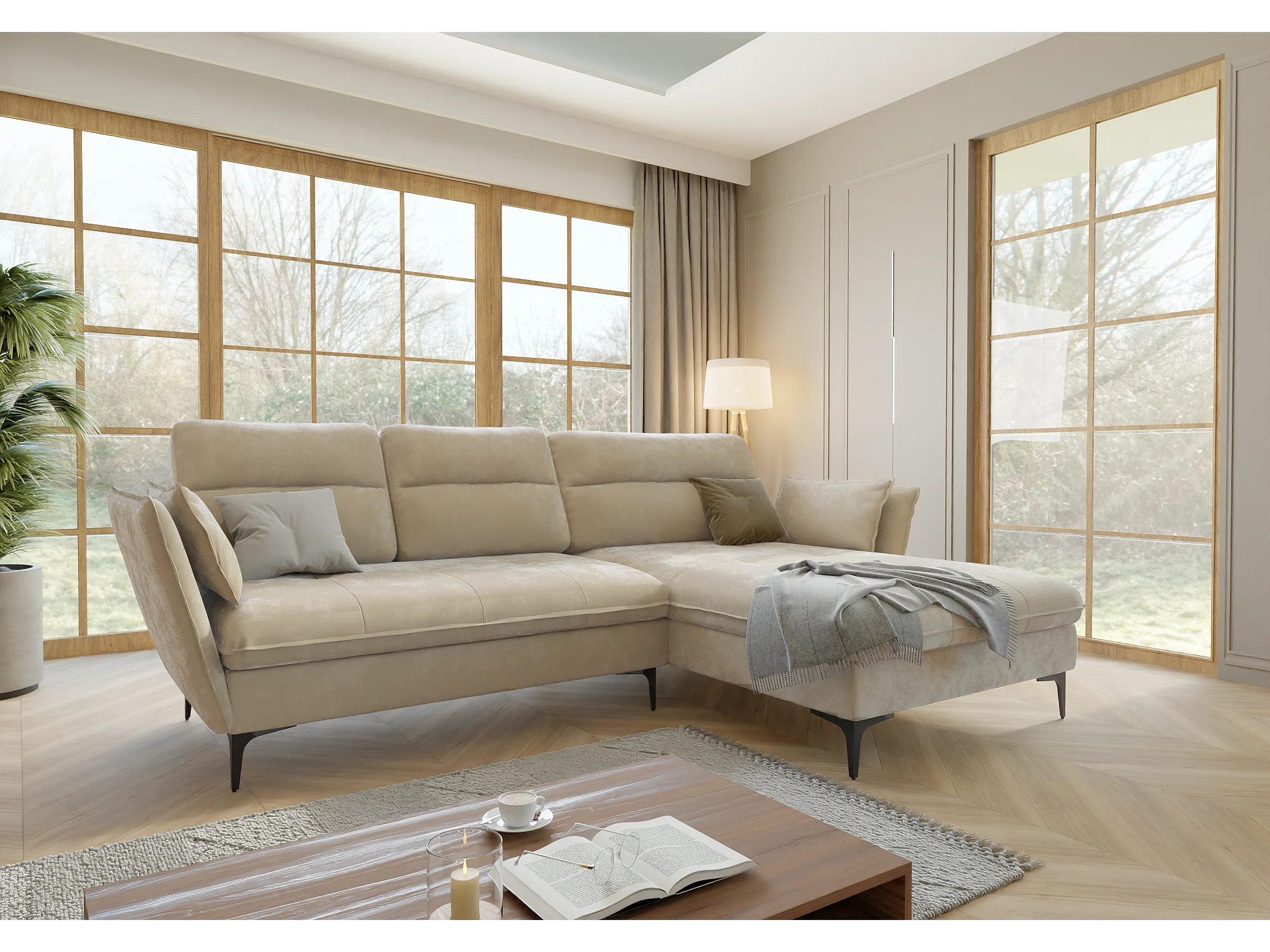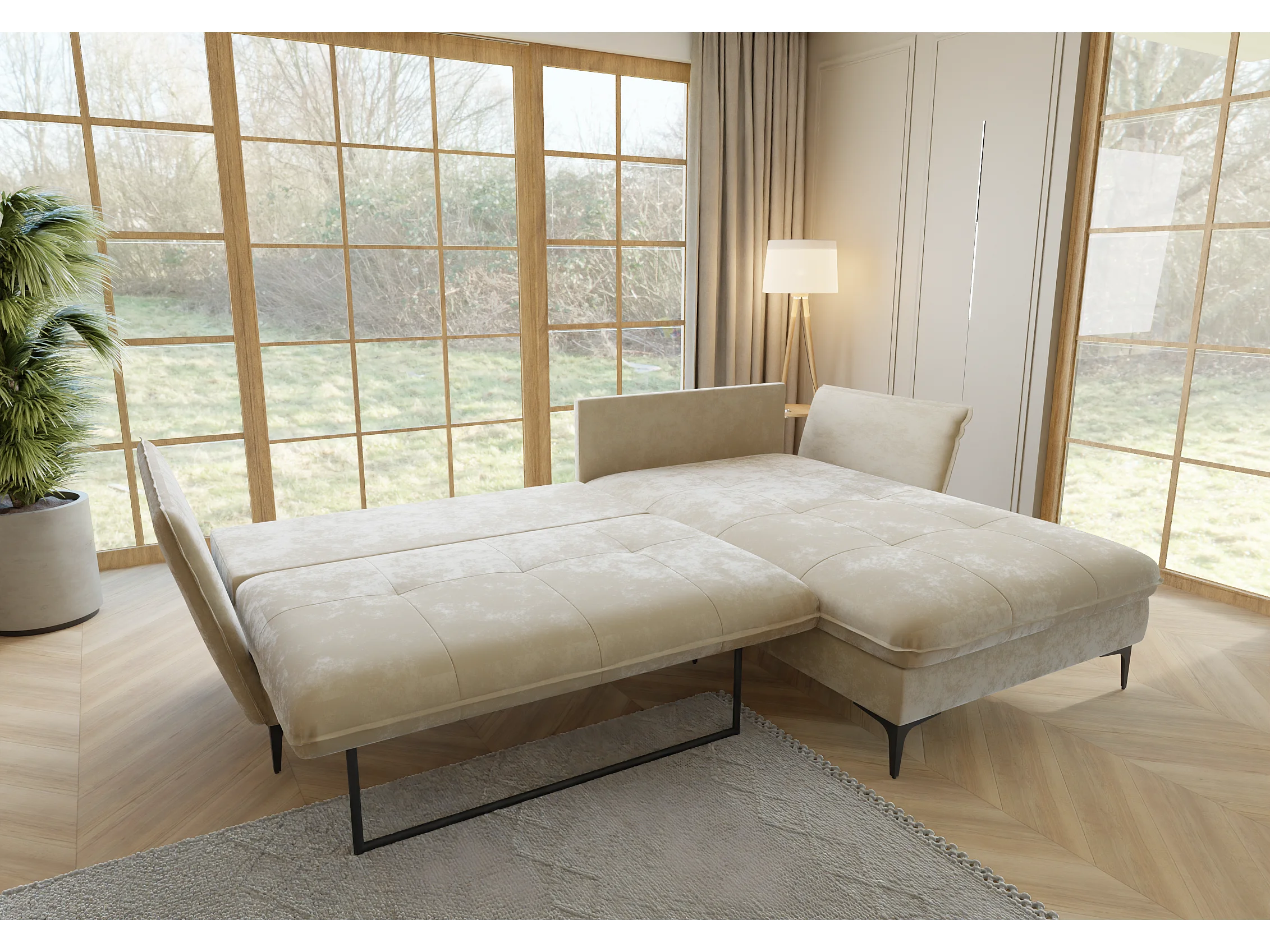 Christa Ecksofa mit Bettfunktion und Bettkasten aus Samt-Stoff mit hohen schwarzen Metallfüßen