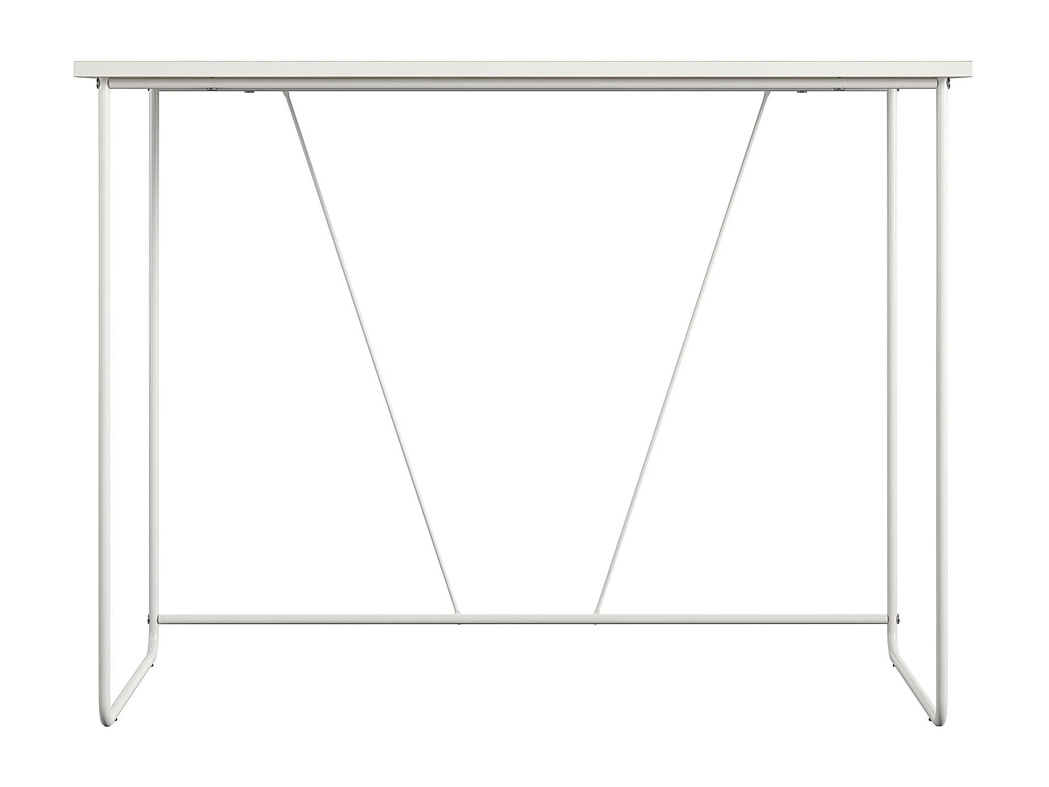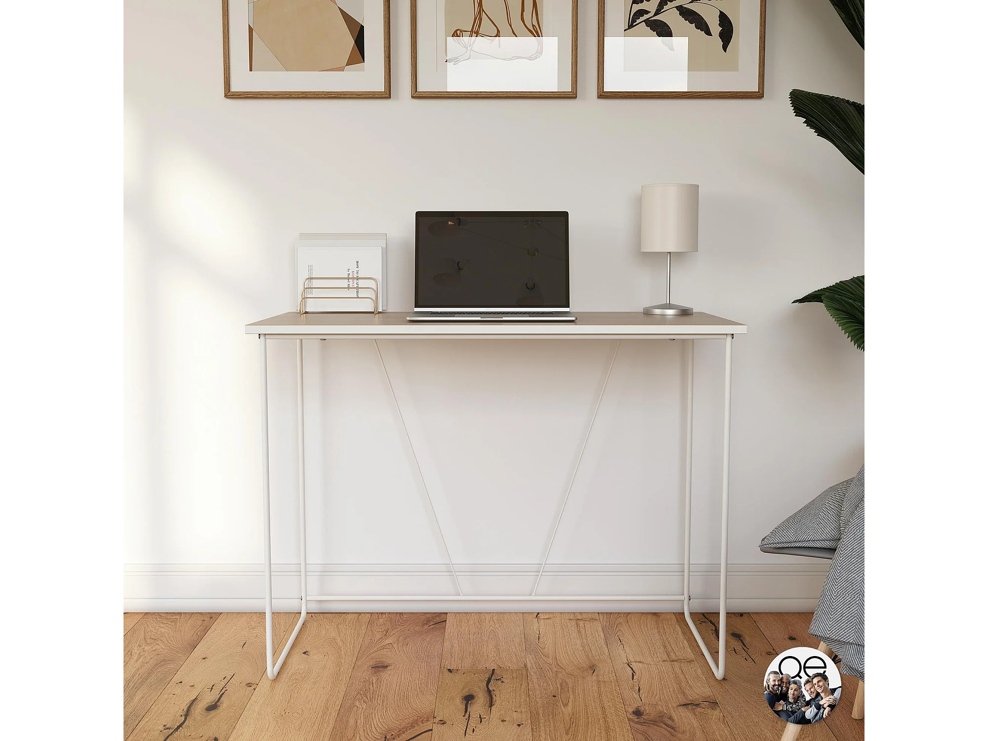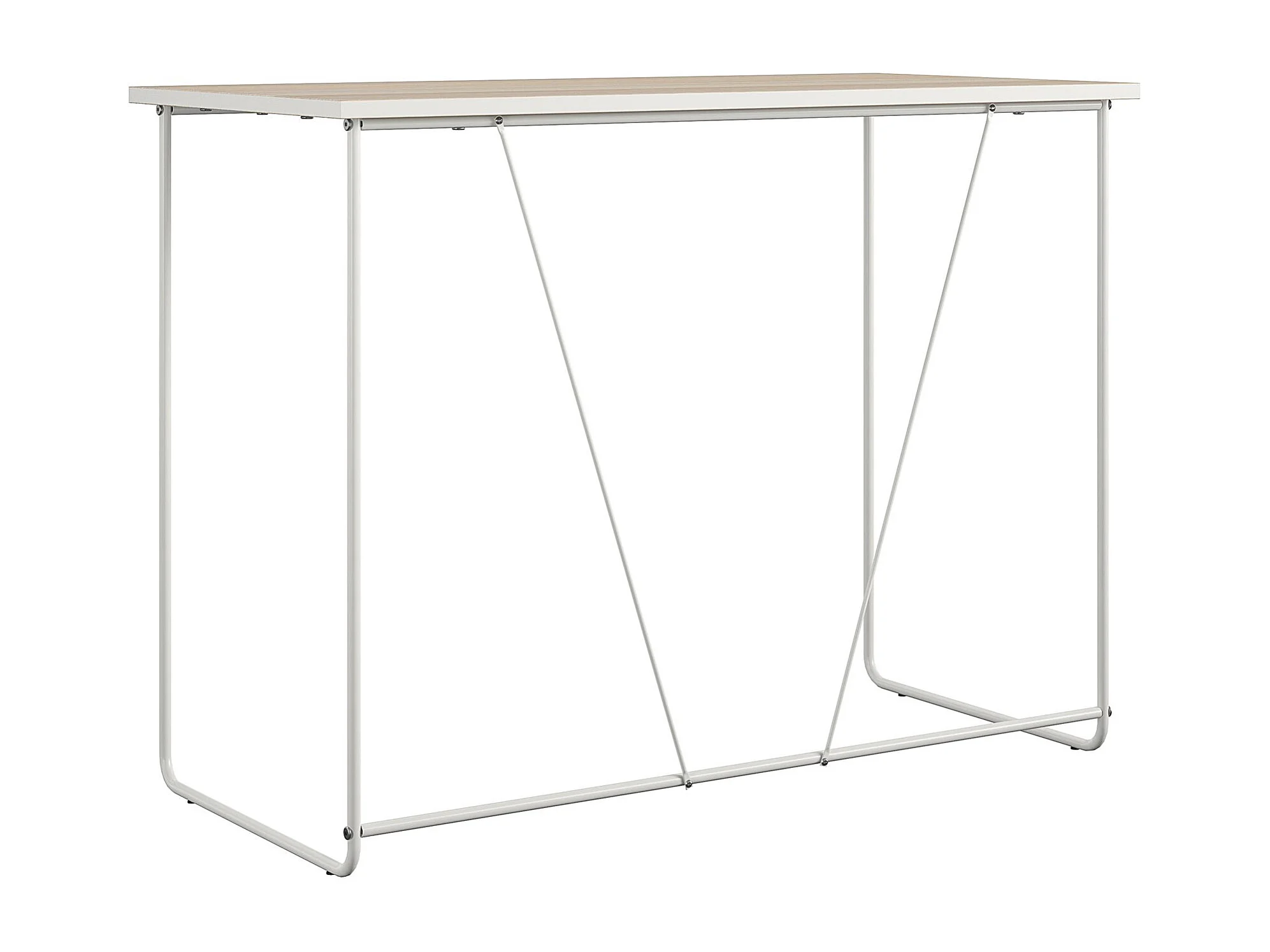 Computertisch aus Spanplatte natur und Gestell aus weißem Metall