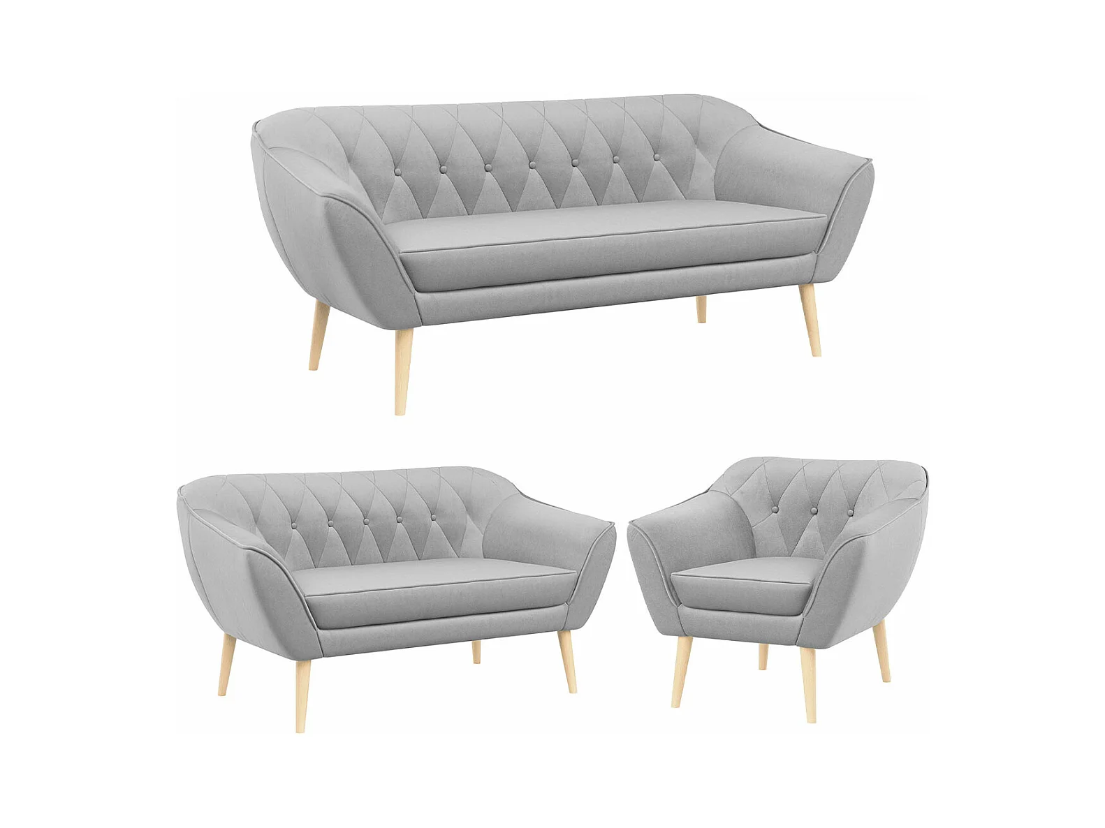 Couchgarnitur PIRS - 3+2+1, mit Armlehnen, Holzbeine, Skandinavischer Design - Hellgrau Velvet