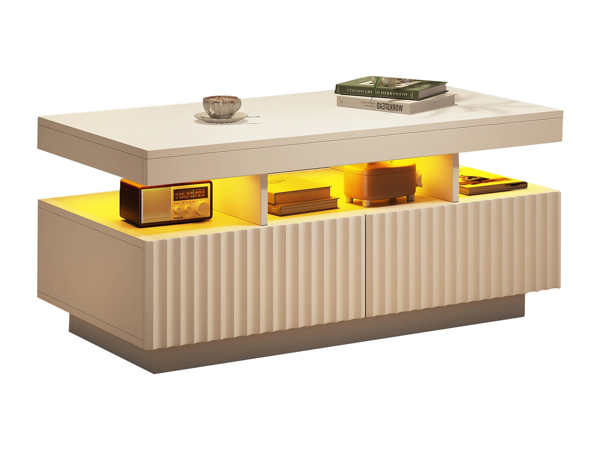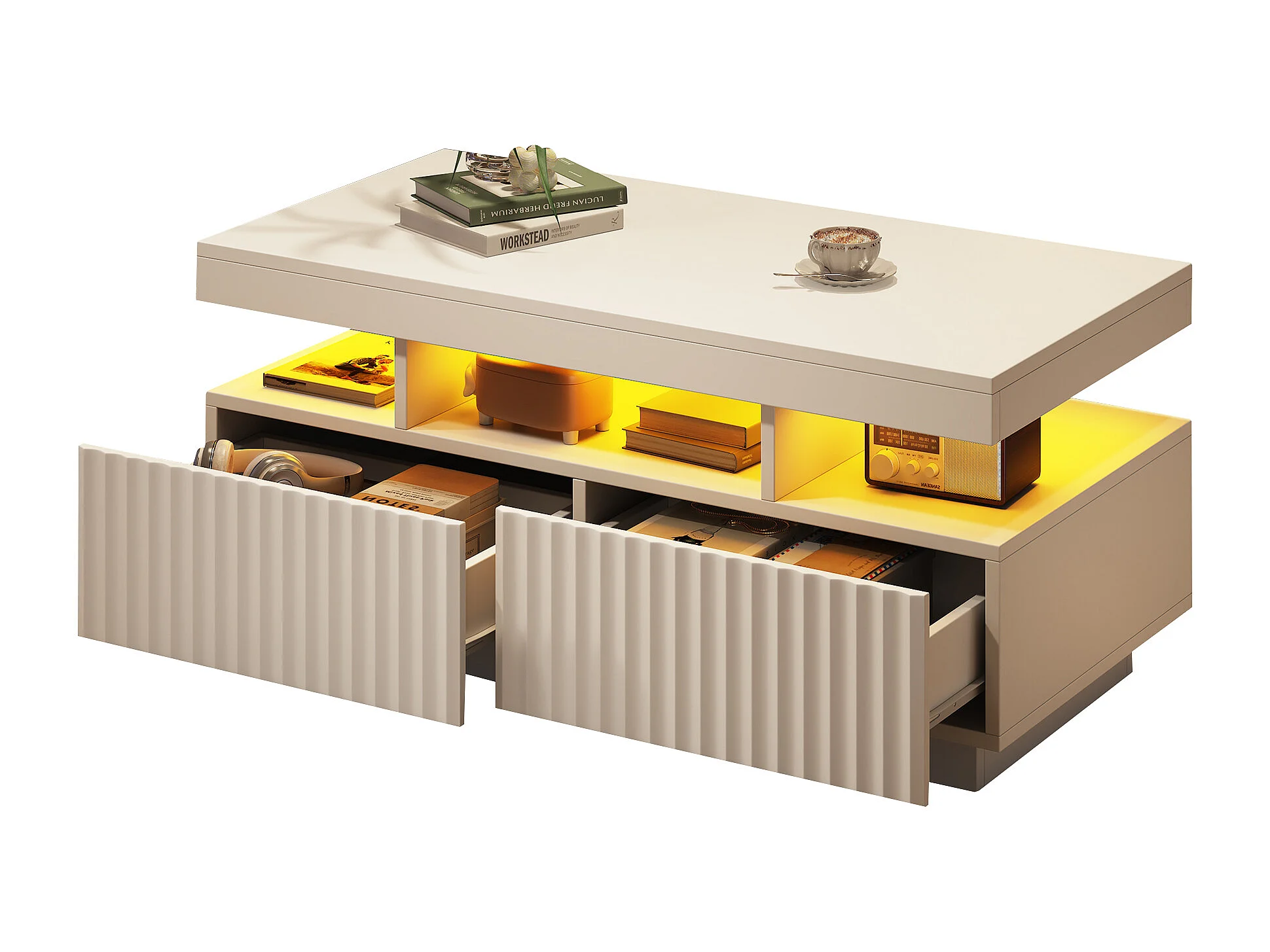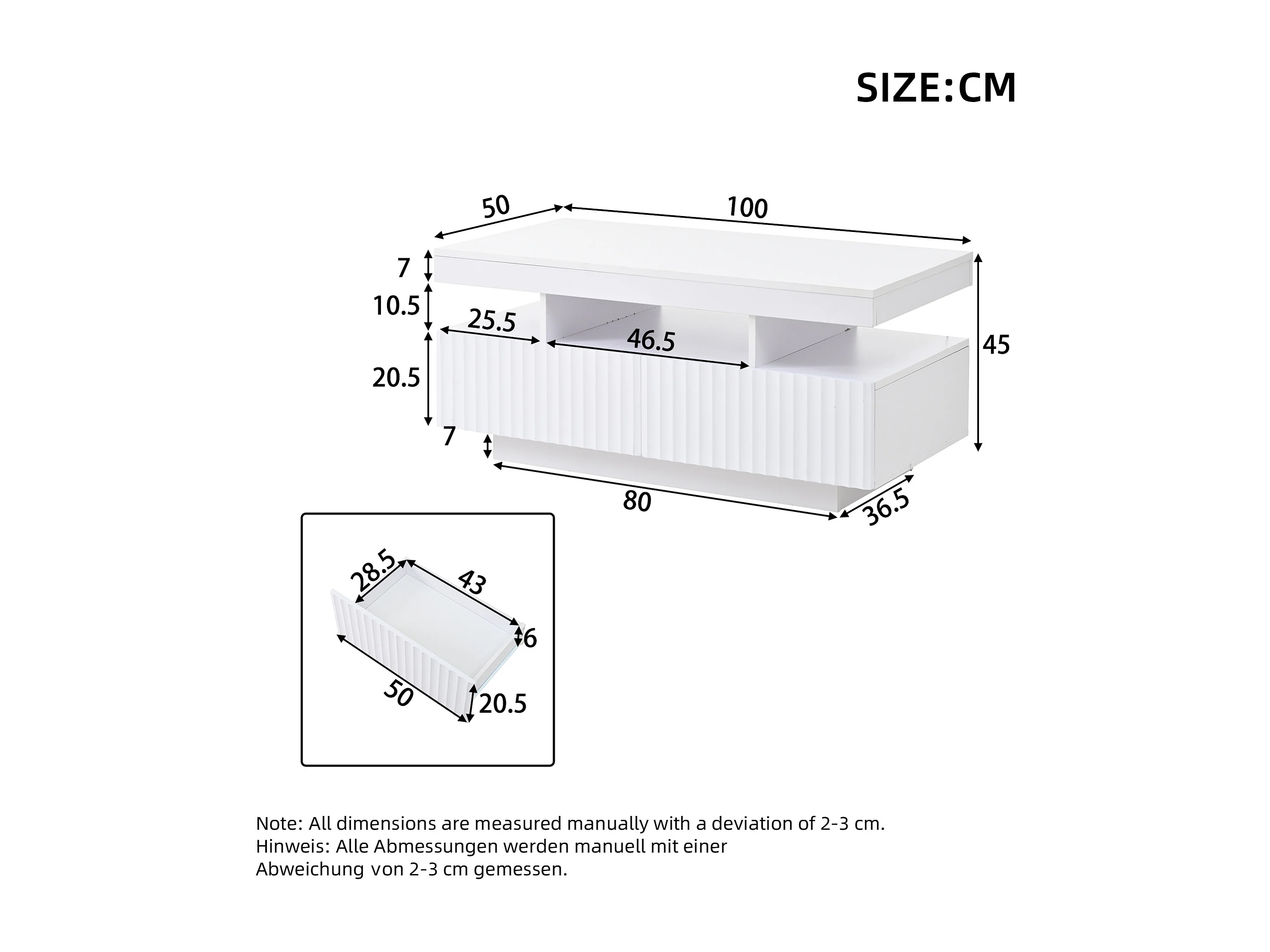 Couchtisch 100x50x45cm - mit LED-Beleuchtung - 2 Schubladen - Offener Stauraum - Spanplatten - Weiß