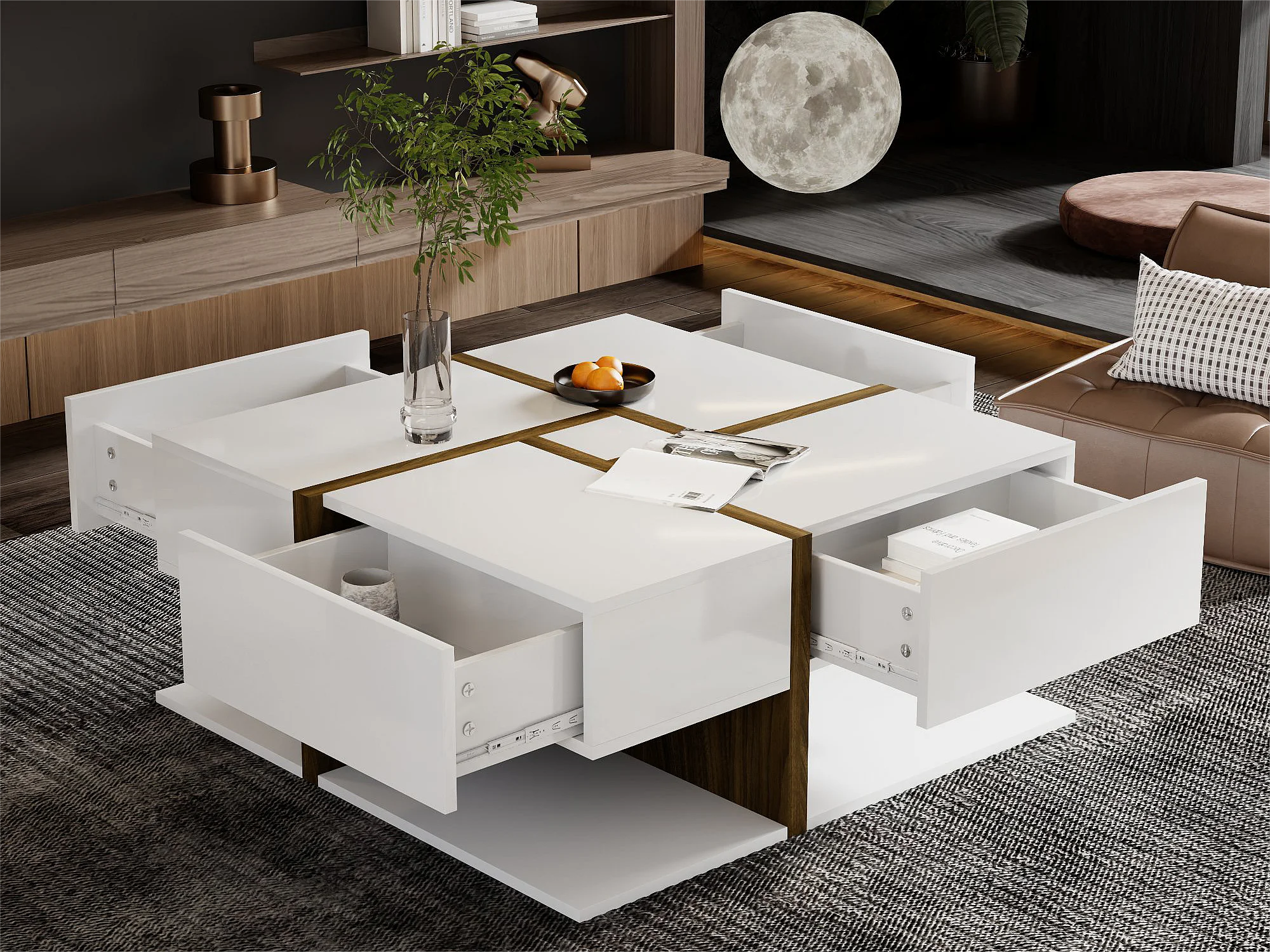 Couchtisch – 4 Schubladen – Stauraum unten – 78 x 78 x 36 cm – Weiß und Braun