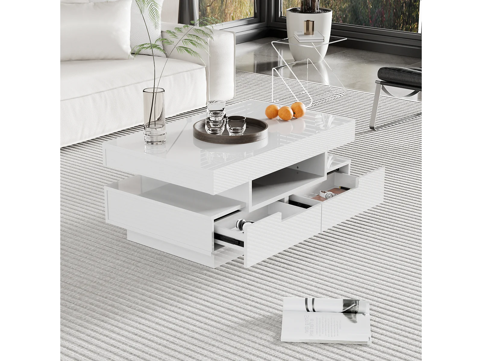 Couchtisch, Hochglanzoberfläche, mit LED, 4 Schubladen vorne und hinten, viel Stauraum 80x50x36cm, weiß